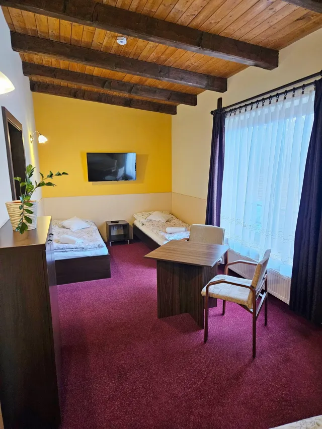 Útulný dvoulůžkový pokoj je ideální volbou pro páry nebo jednotlivce hledající pohodlí a klid.Pokoj nabízí komfortní manželskou postel (nebo dvě oddělená lůžka), vlastní koupelnu se sprchovým koutem a toaletou.Vybavení pokoje:klimatizaceTVlednicevarná konvicefénWi-Fi připojení zdarma