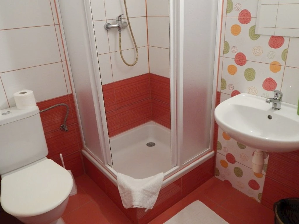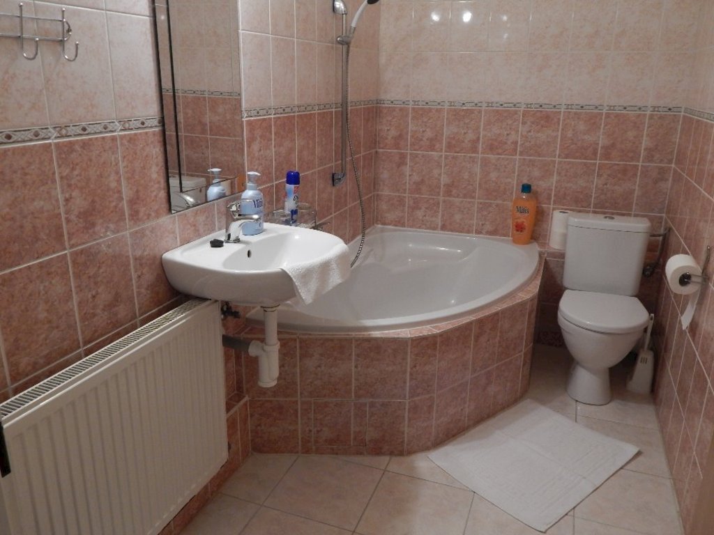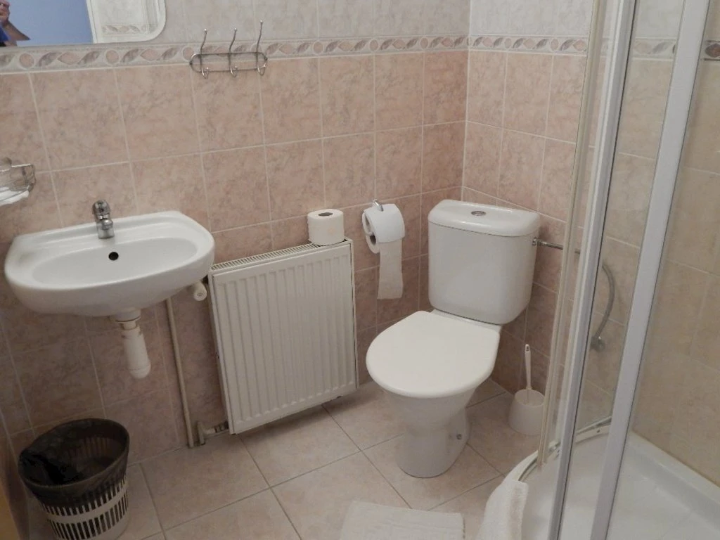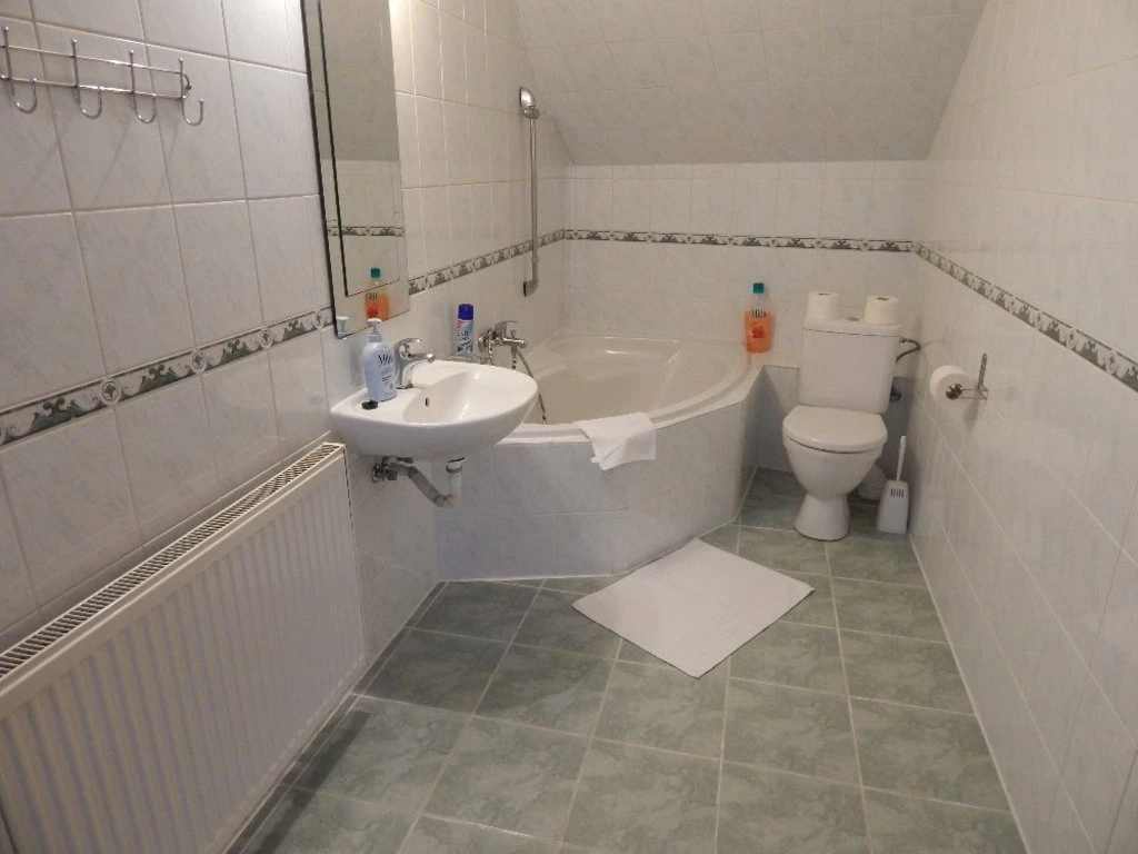 Koupelna je vybavena toaletou, umyvadlem a ručníky. Podle konkrétního pokoje je k dispozici buď sprchový kout, nebo vana.