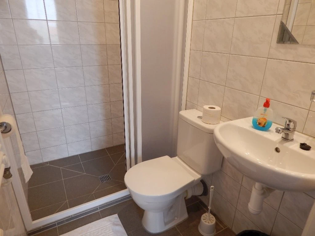 K dispozici je koupelna s toaletou, sprchou, umyvadlem a ručníky.