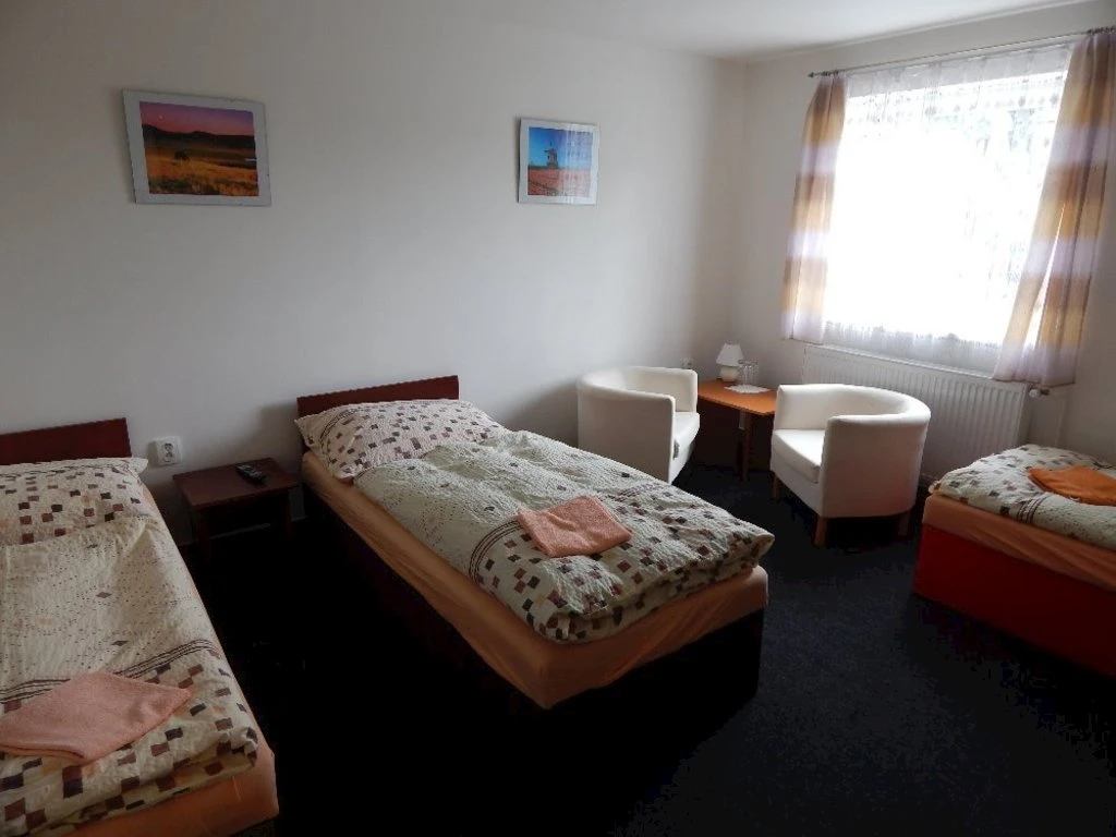 Třílůžkový pokoj o rozloze 25 m² se nachází ve 3 pokojích v 1. podlaží. Součástí je ložnice se třemi jednolůžkovými postelemi, které lze v případě potřeby spojit do dvoulůžka.Pokoj je vybaven Wi-Fi připojením k internetu, televizí, ledničkou a rychlovarnou konvicí.Koupelna zahrnuje toaletu, umyvadlo a ručníky. Podle konkrétního pokoje je k dispozici buď sprchový kout, nebo vana.