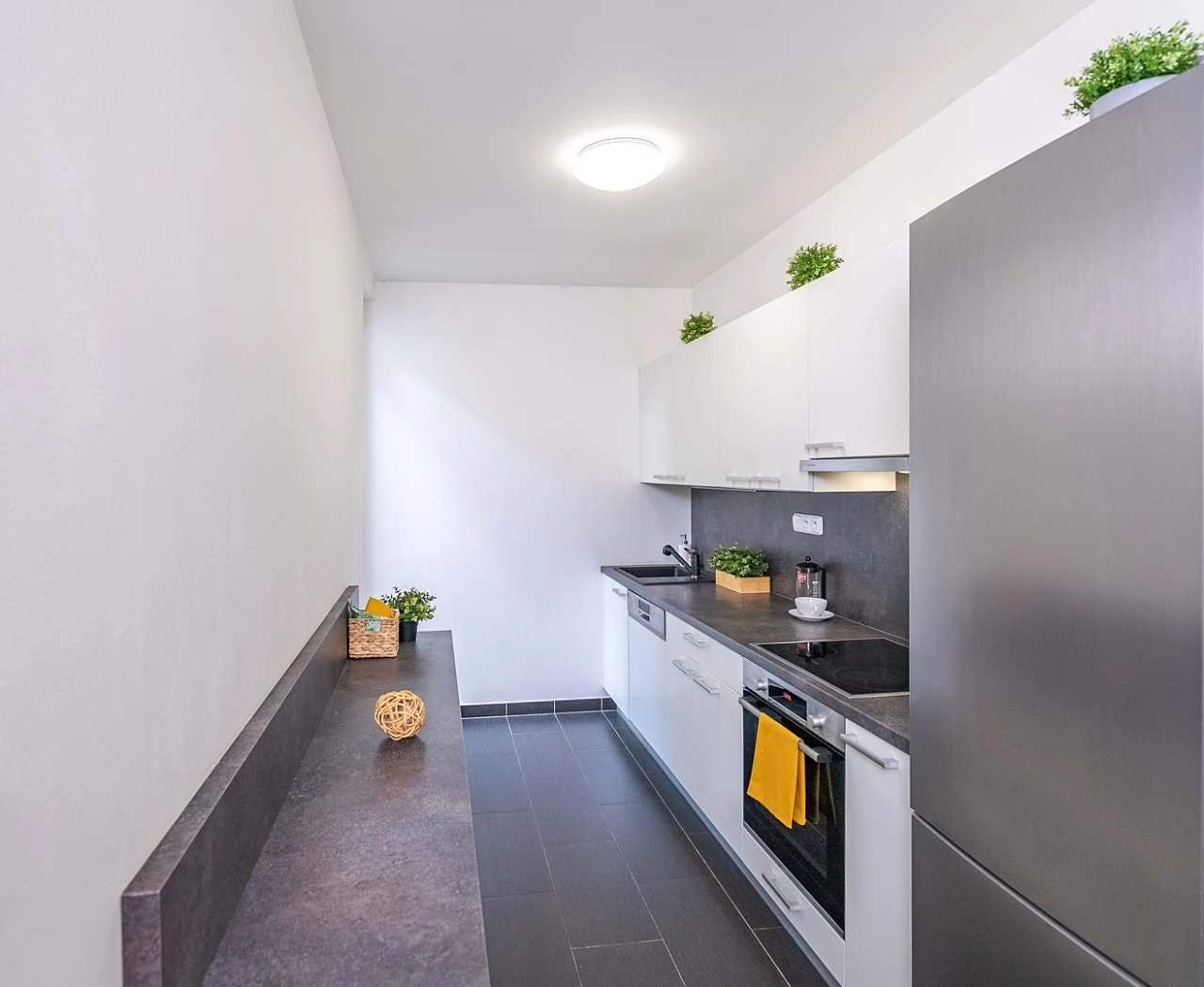 - Kuchyně: lednice s mrazákem, myčka nádobí, mikrovlnná trouba, sklokeramická deska, elektrická trouba, kávovar na překapávanou kávu, rychlovarná konvice, tyčový mixér, kompletní kuchyňské vybavení.