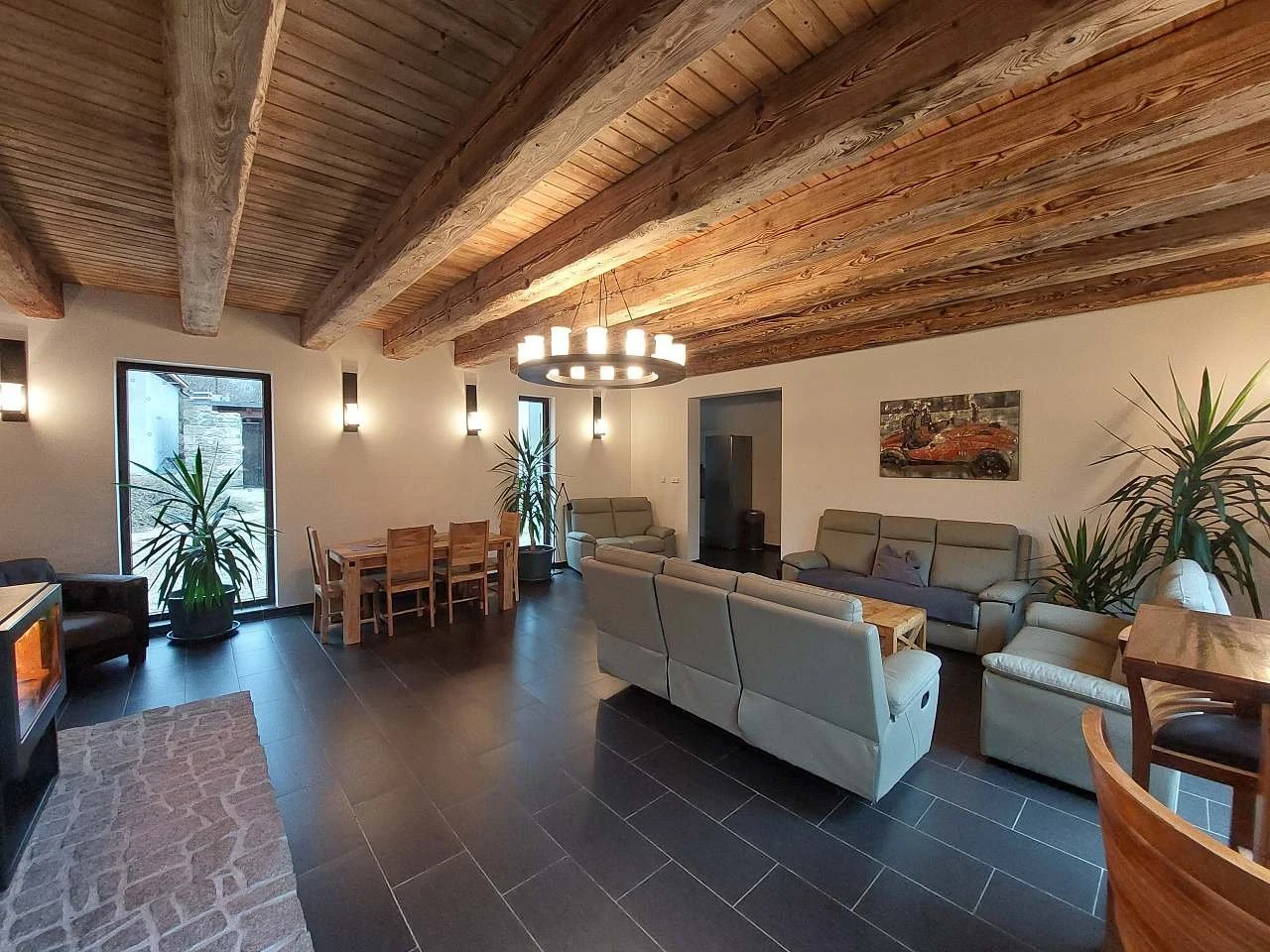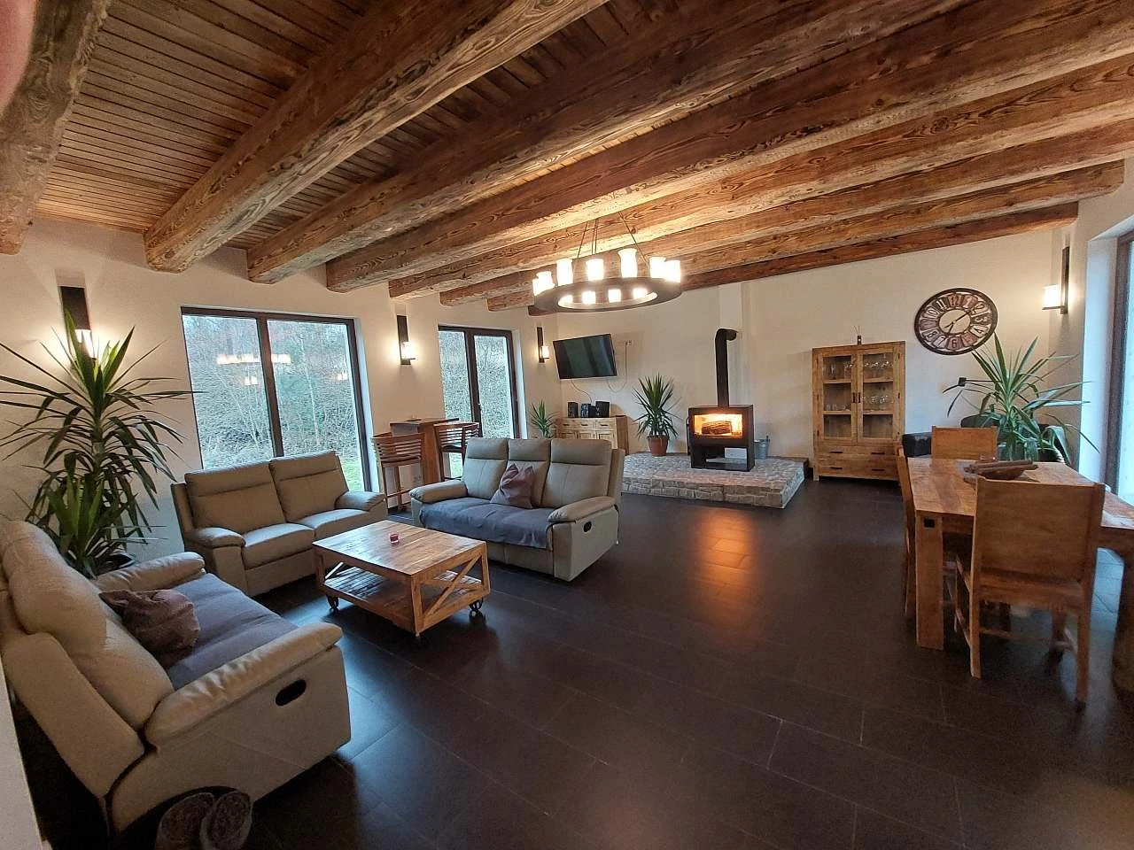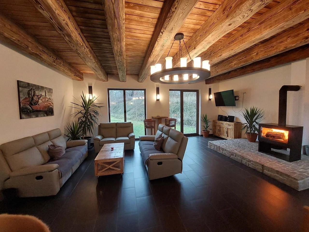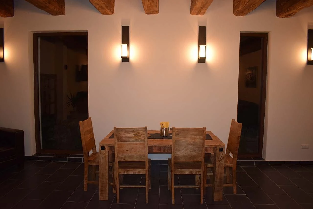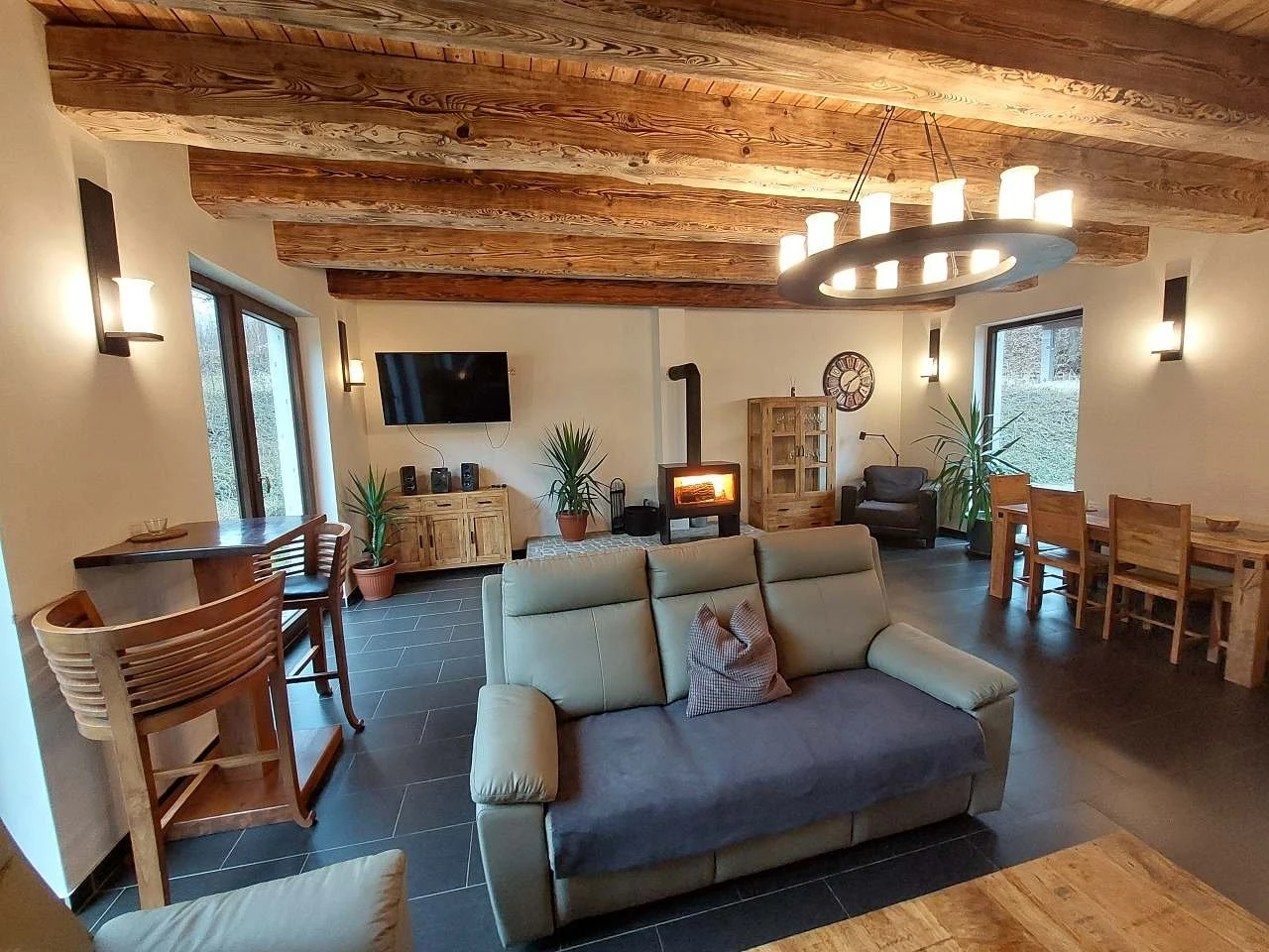 - Obývací pokoj: TV + satelit, audio systém, krbová kamna, 2× sedačka, jídelní stůl s lavicí a židlemi, barové posezení (2 místa), křeslo.