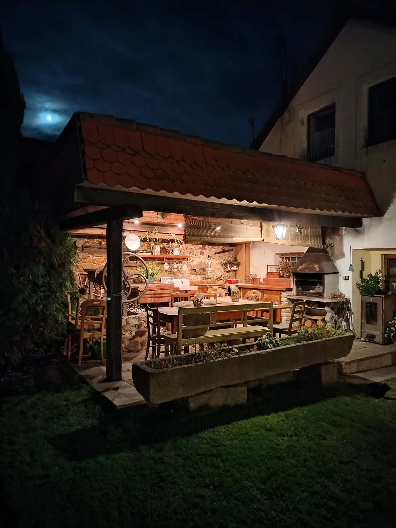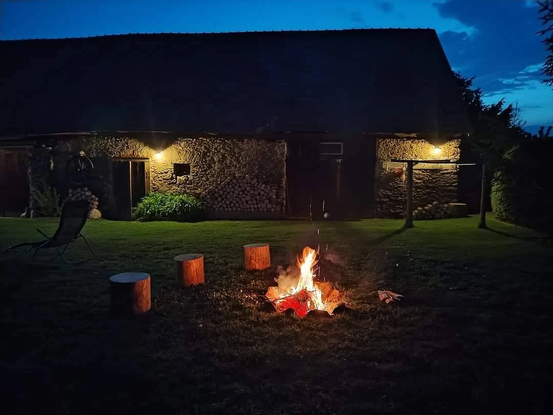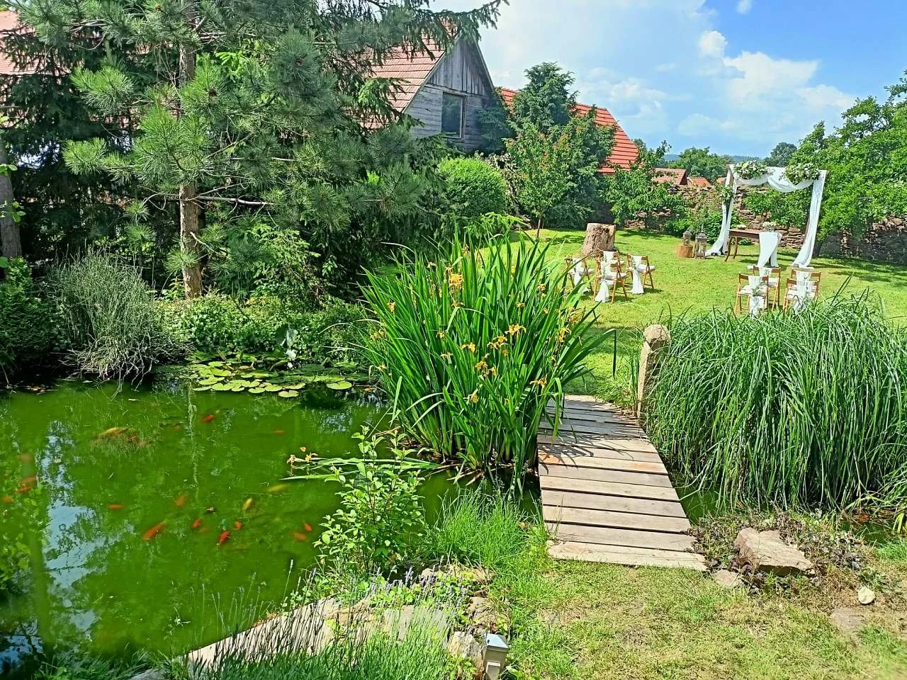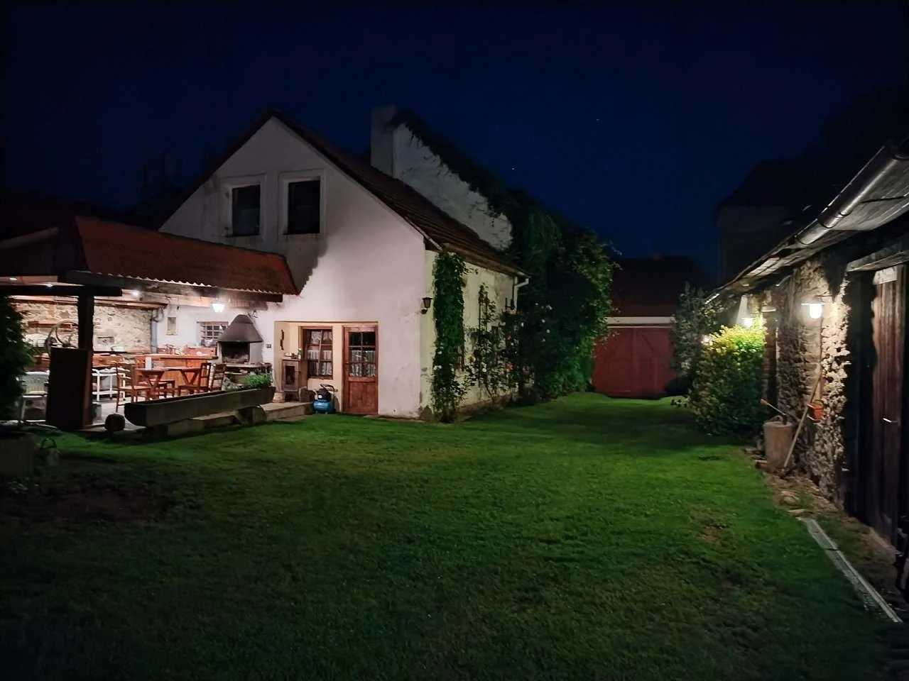 Venkovní areál tvoří uzavřený travnatý dvůr se zahradou, lesíkem, ohništěm, jezírkem a 2 bazény (průměr 360 cm a 160 cm). Nechybí zastřešené venkovní posezení s kuchyní a grilem ani velký pojízdný rožeň na pečení selat či kýt.