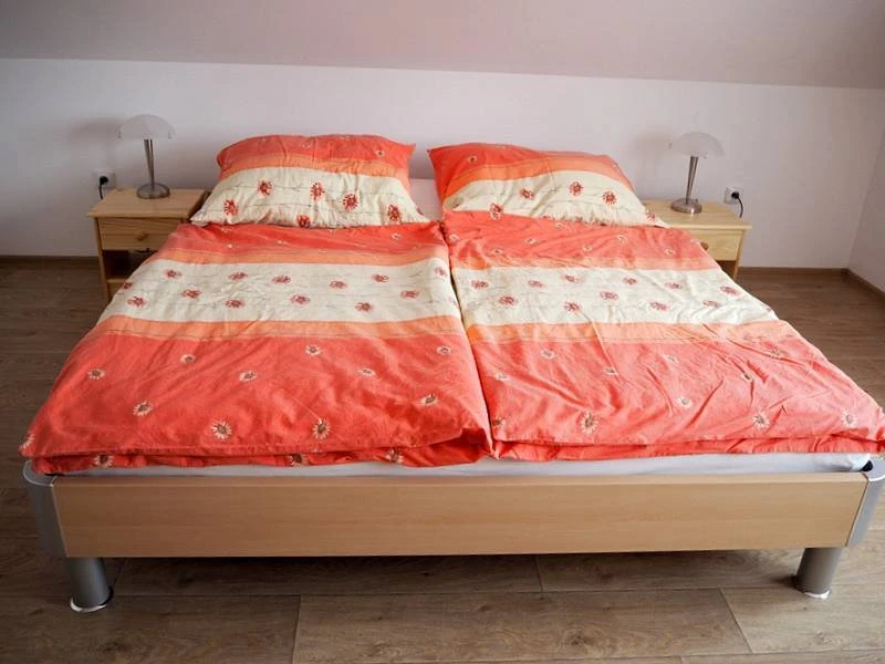V horním patře jsou dva světlé pokoje a druhá koupelna s vanou a toaletou. Každý pokoj má dostatek úložného prostoru. Hosté mají k dispozici čisté povlečení, ručníky, osušky, základní hygienické potřeby a toaletní papír.