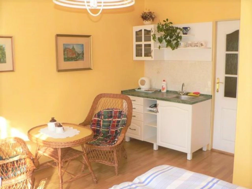 Kuchyňský kout: mikrovlnná trouba, rychlovarná konvice, lednička, jídelní sezení