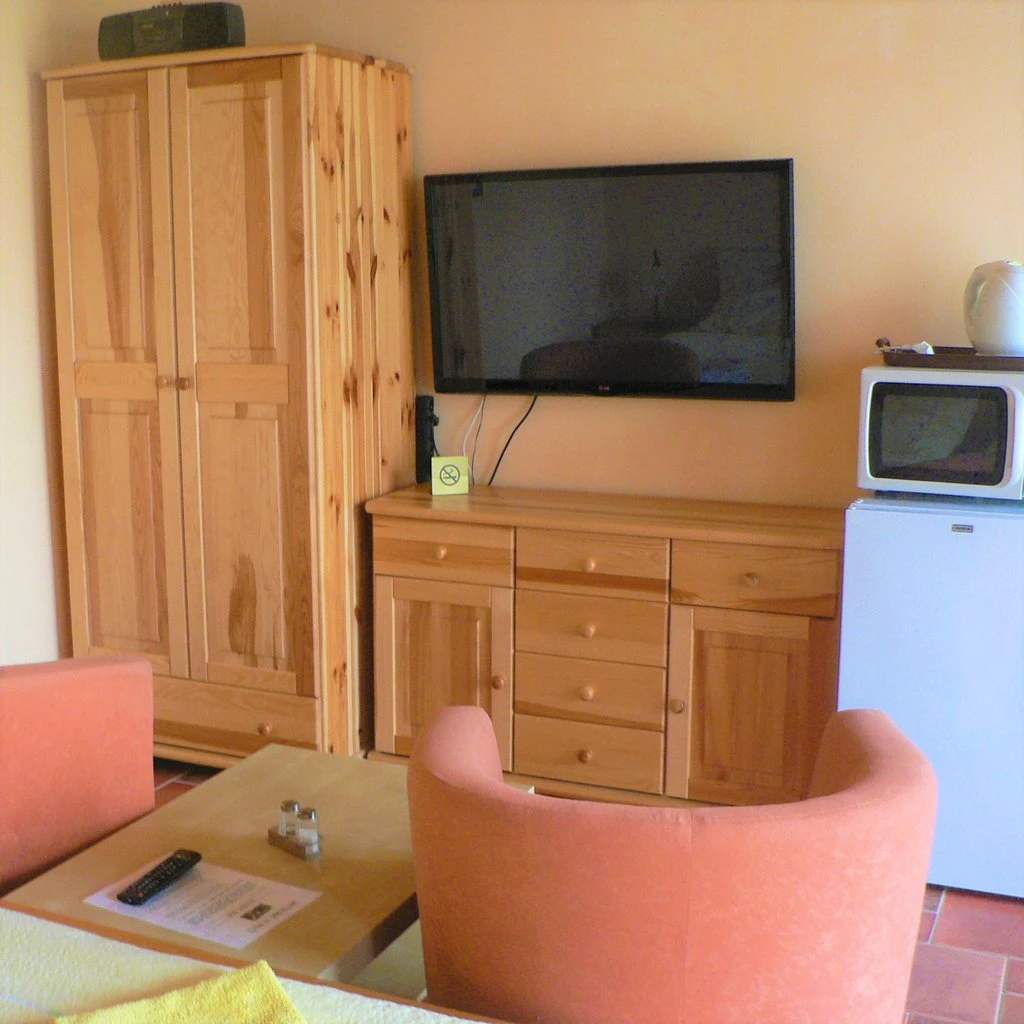 Kuchyň: mikrovlnná trouba, rychlovarná konvice, lednička, jídelní sezení, elektrický vařič
