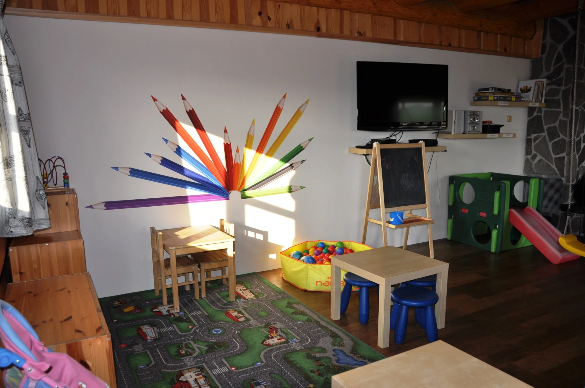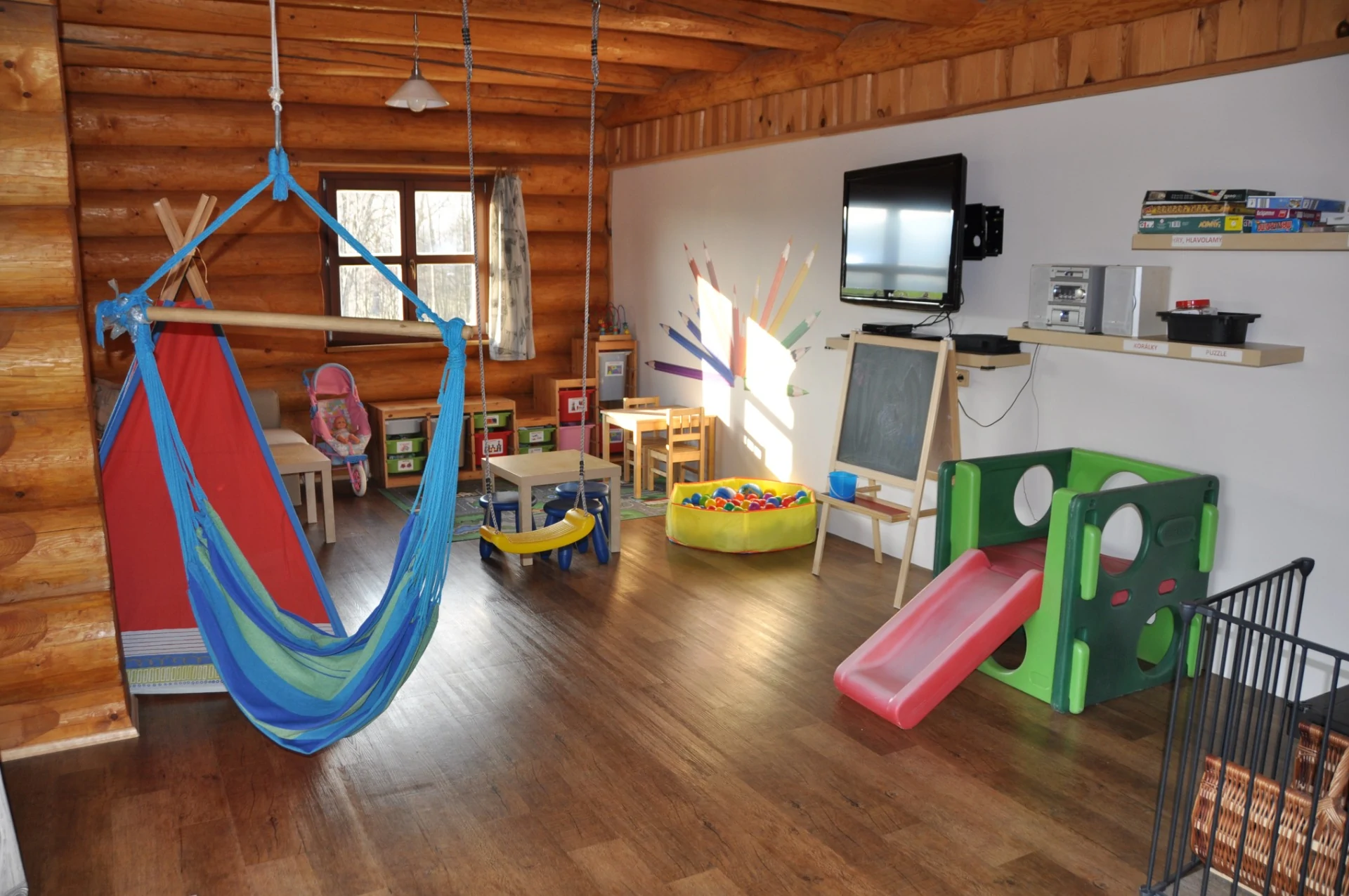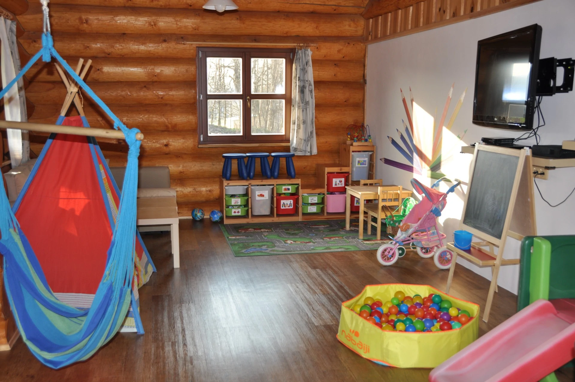 - Herna: hrací koberec, pěnové puzzle, dřevěná vláčkodráha, tabule, stan, bazén s balonky, stolek a židličky, pastelky a omalovánky, hračky a společenské hry