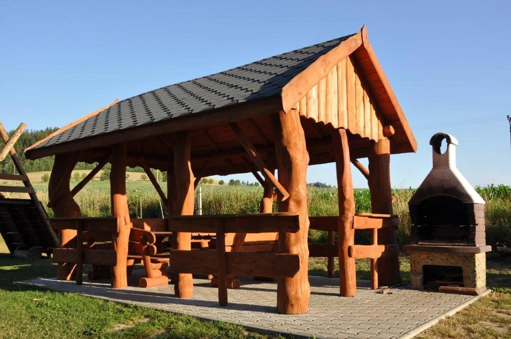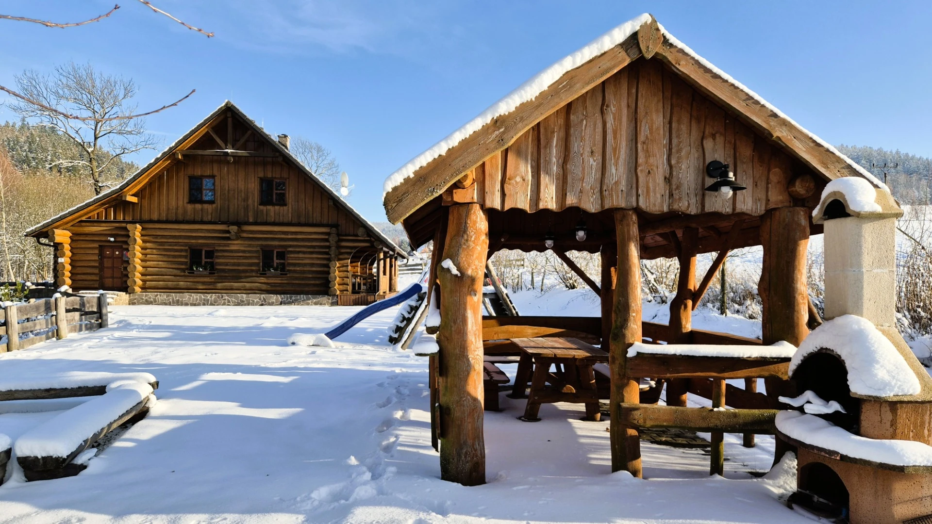 - Zastřešená terasa s jídelním stolem, venkovní altán s posezením a grilem