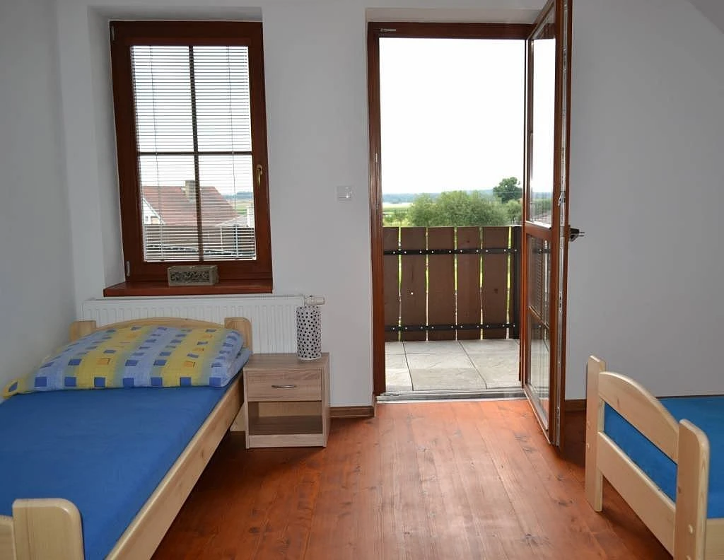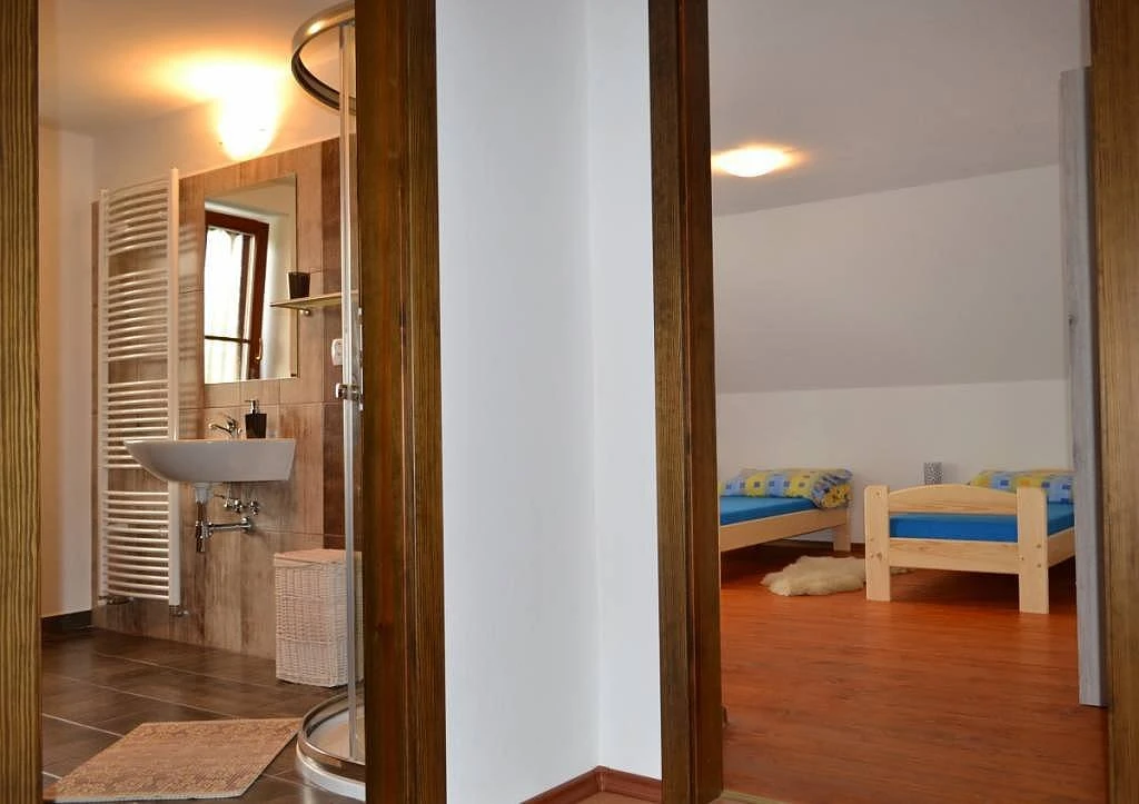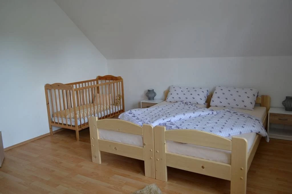 V přízemí se nachází bezbariérový dvoulůžkový pokoj s vlastní koupelnou, který má samostatný vstup na zahradu a je vybaven úložnými prostory. V patře jsou tři pokoje: třílůžkový pokoj s oddělenými postelemi a vstupem na balkon, dále pokoj s manželskou postelí, dětskou postýlkou a televizí a třetí třílůžkový pokoj s manželskou postelí a samostatným lůžkem.