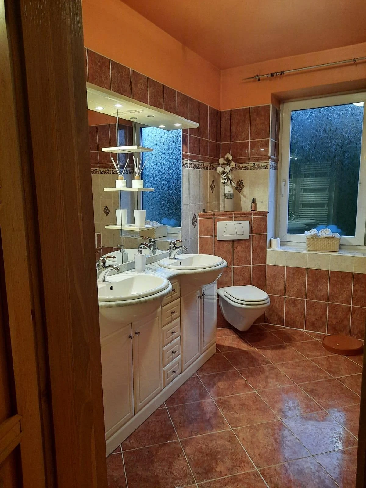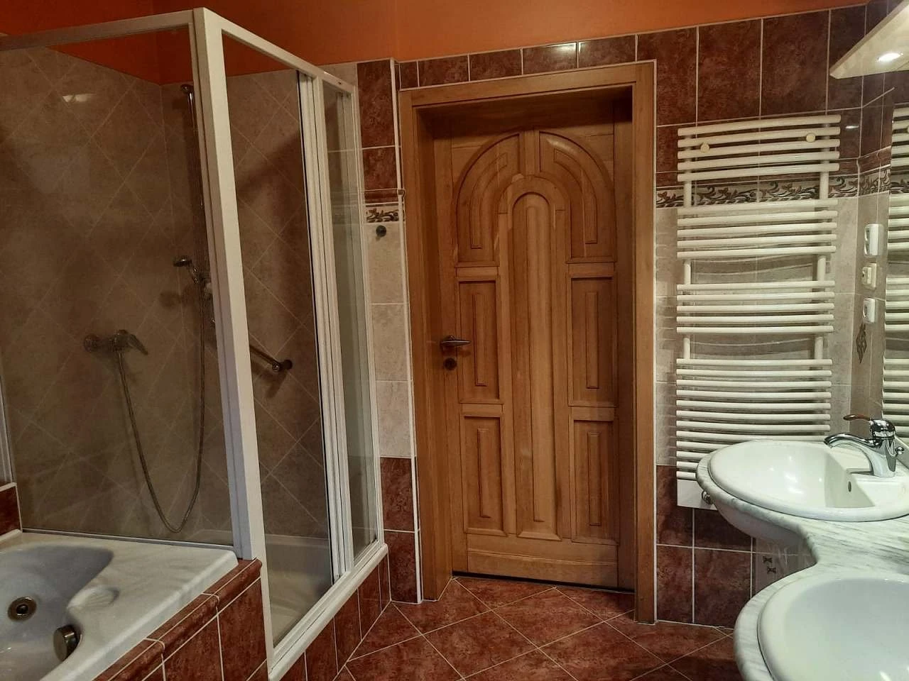 2 umyvadla, vyhřívaná podlaha, žebříkový radiátor, velký sprchový kout a vana - Koupelna v přízemí:
