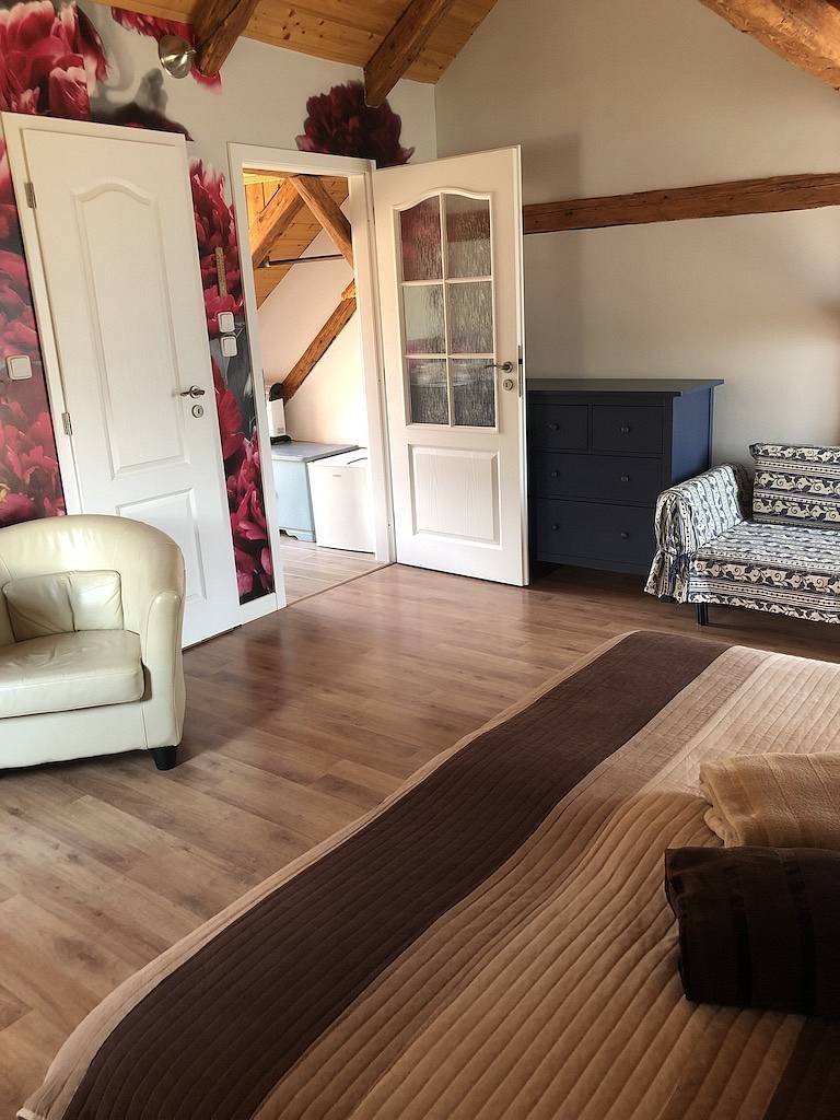 - Vybavení: manželská postel + rozkládací gauč (140 × 200), koupelna s vanou, WC, mini lednička, varná konvice