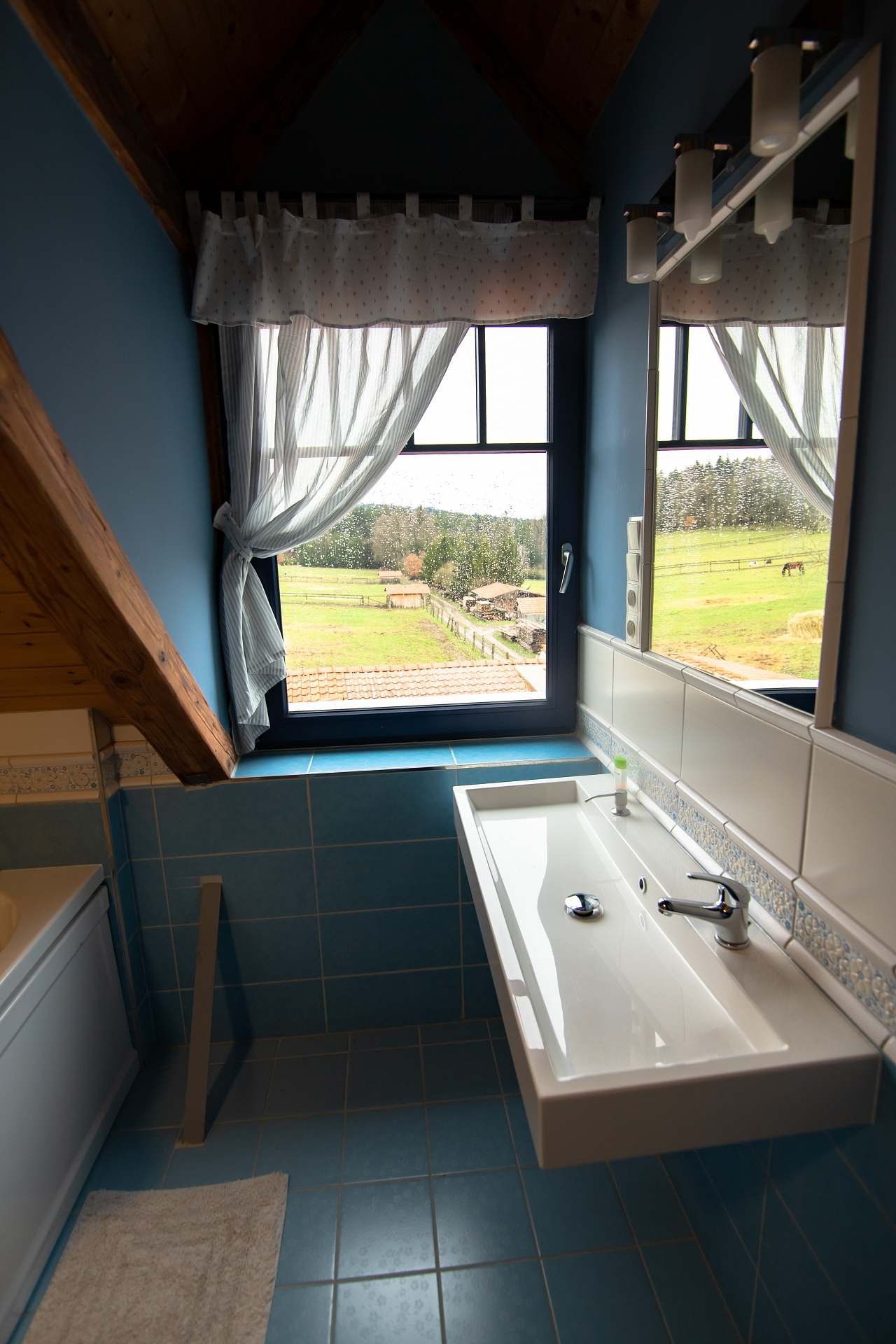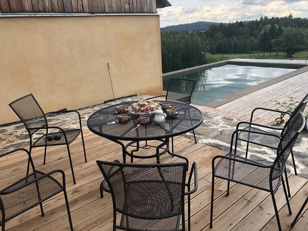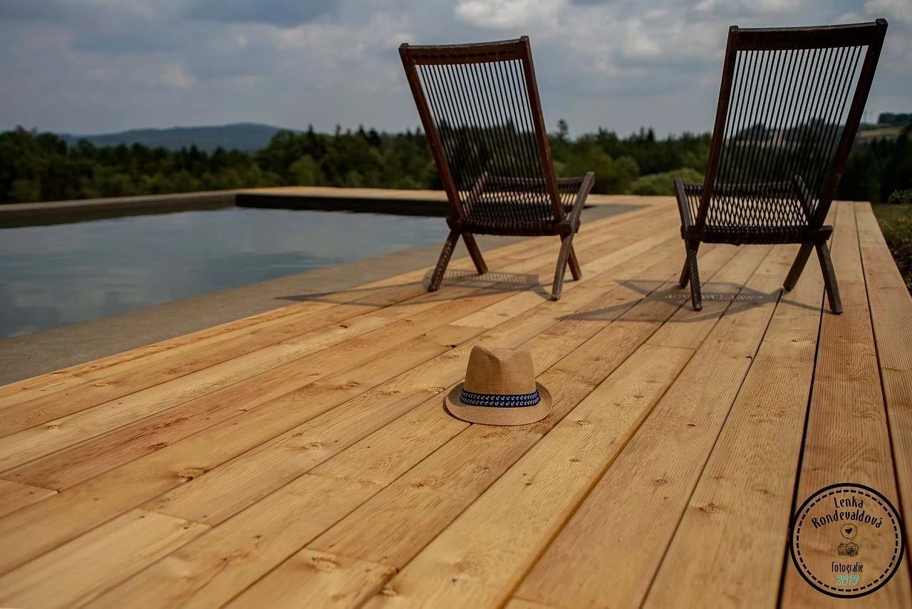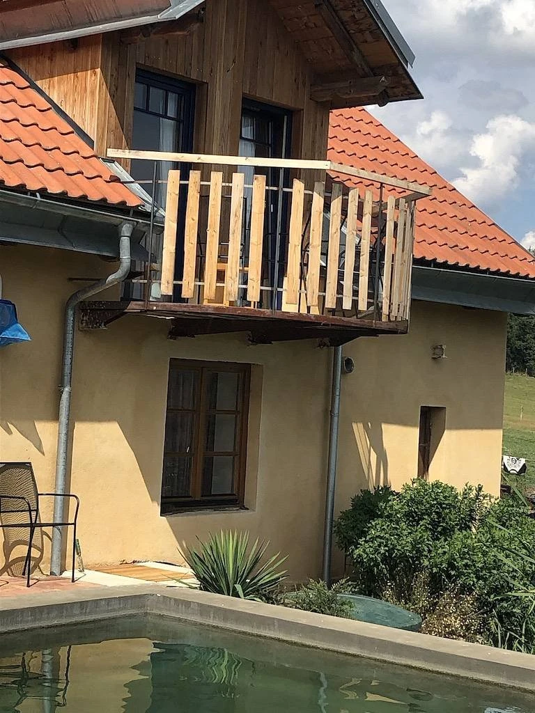 - Balkon: společný s Pivoňkovým apartmánem, výhled na pastvinu a bazén