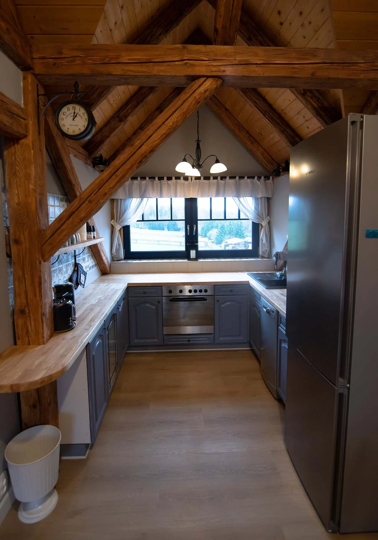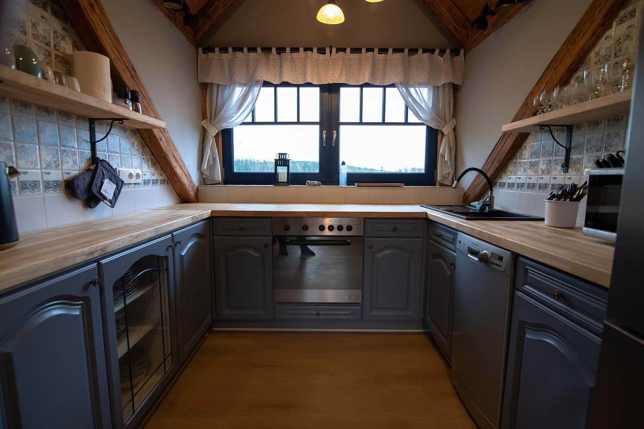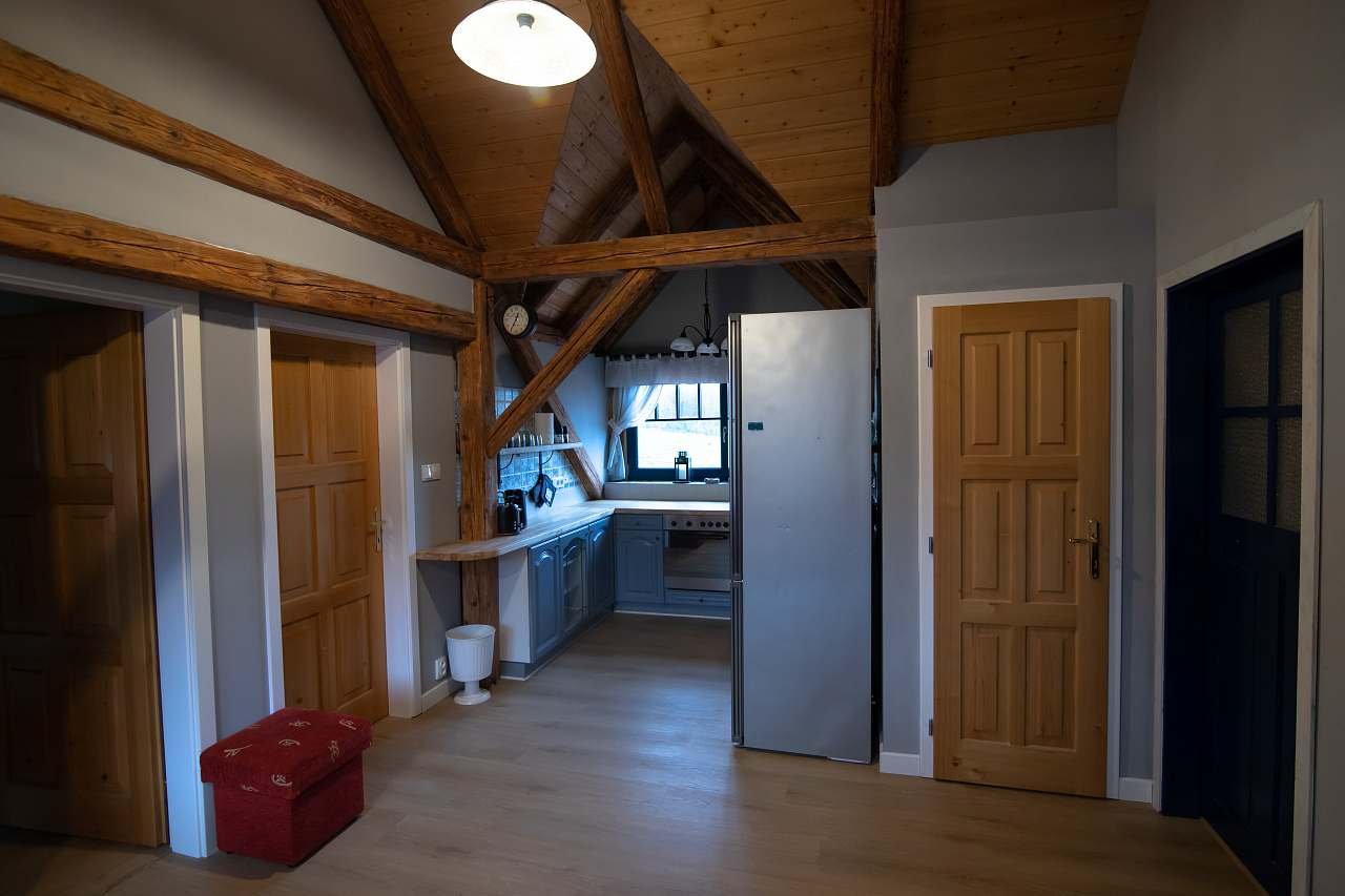 - Kompletně vybavená kuchyň: velká lednice, trouba, přenosná indukční dvouplotýnka