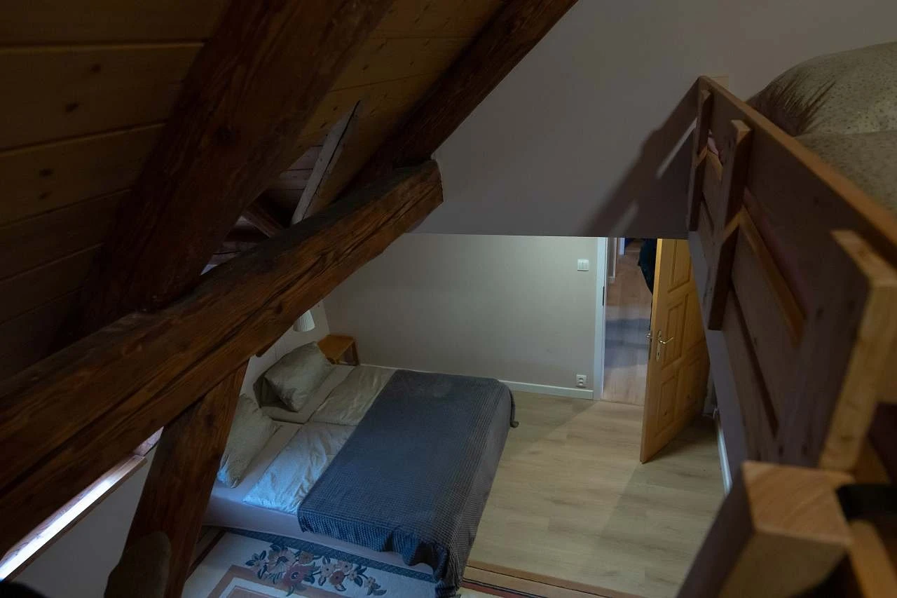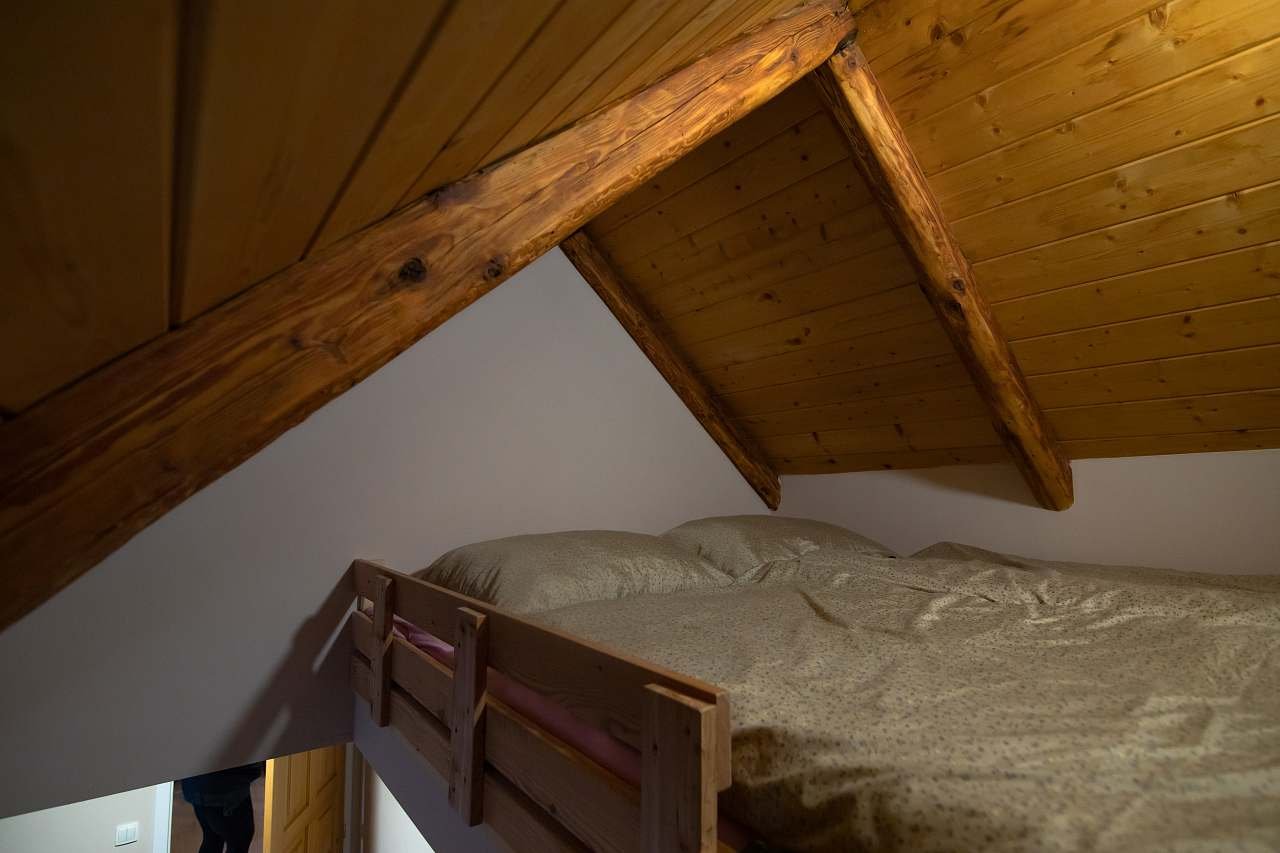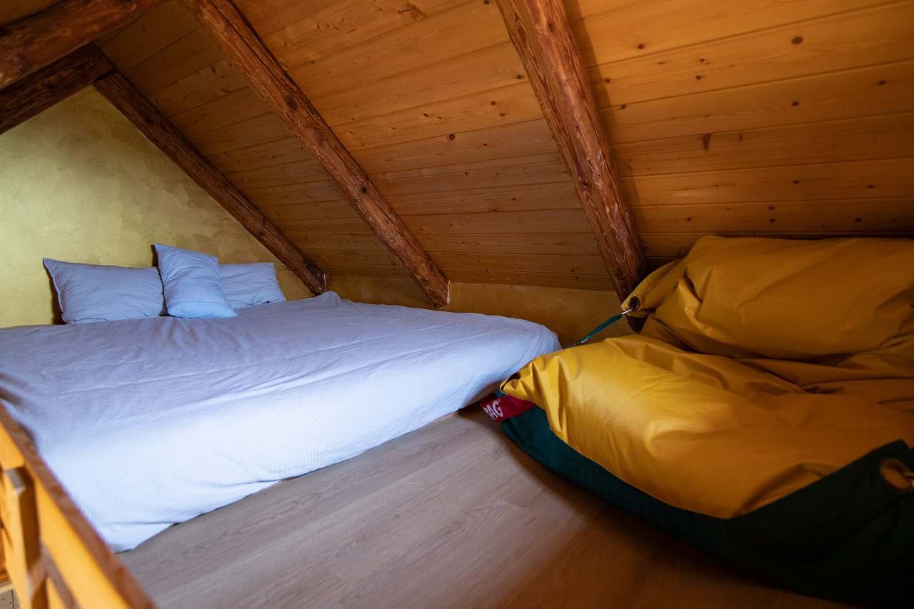 - 2 samostatné pokoje: manželská postel s možností rozdělení na 2 postele + spací patro (180 × 200)