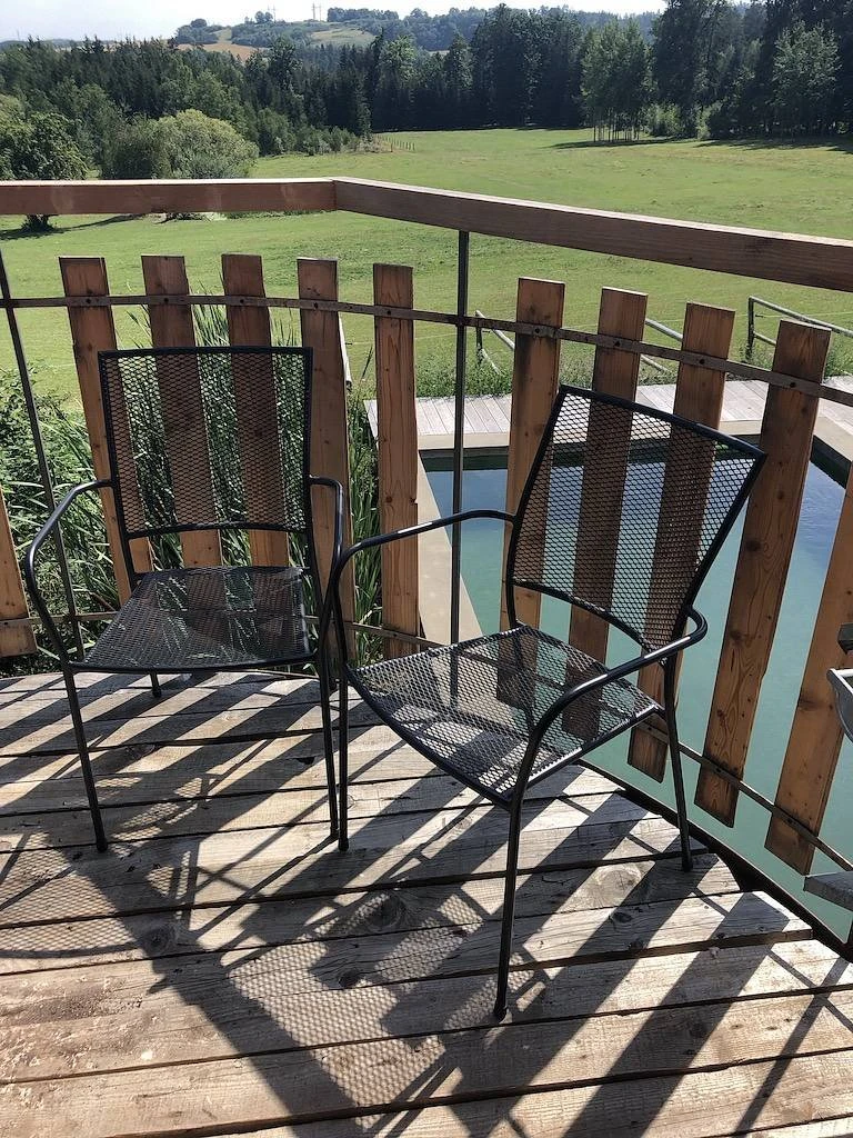 - Balkon: společný se Sakurovým apartmánem, výhled na pastvinu a bazén