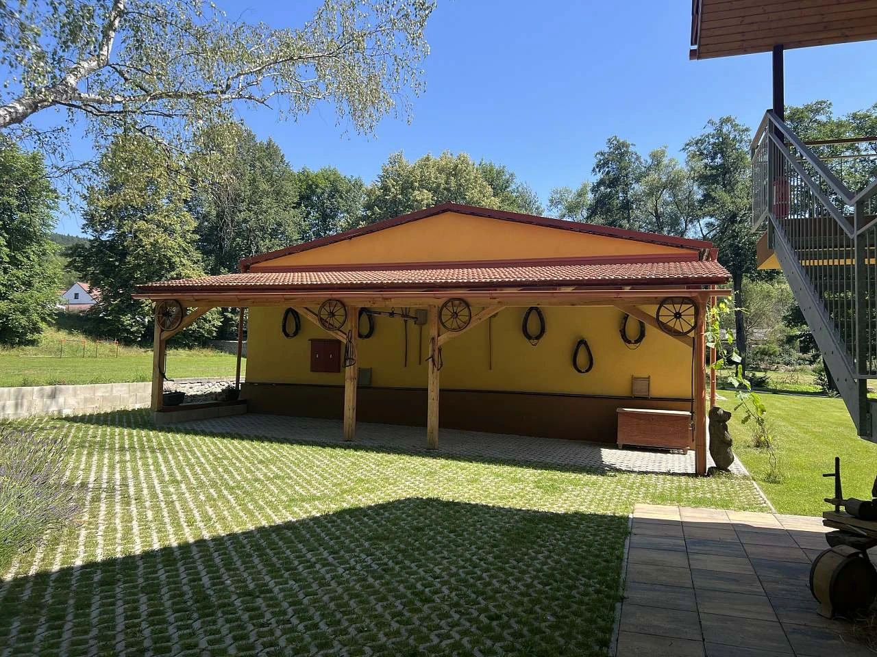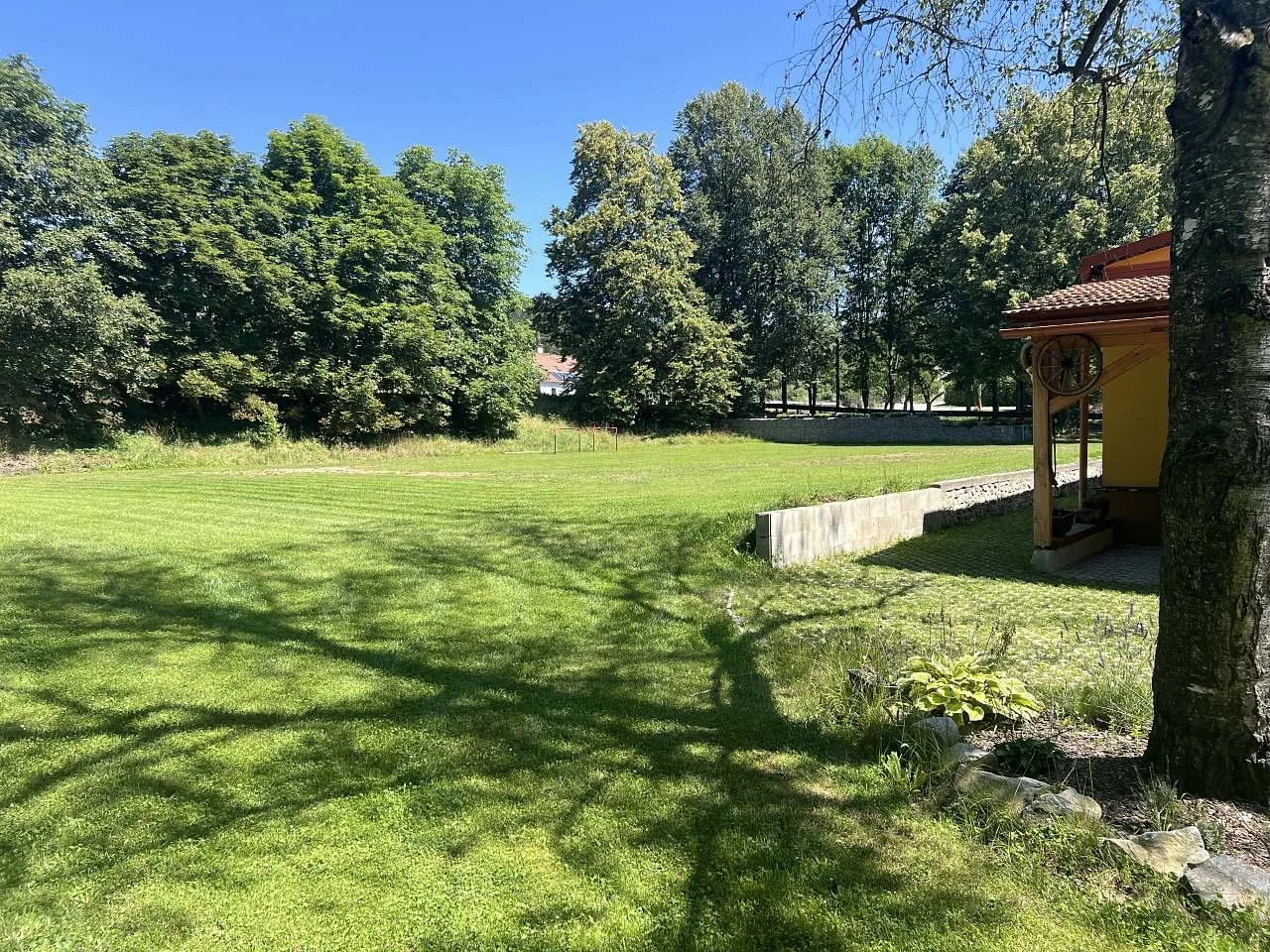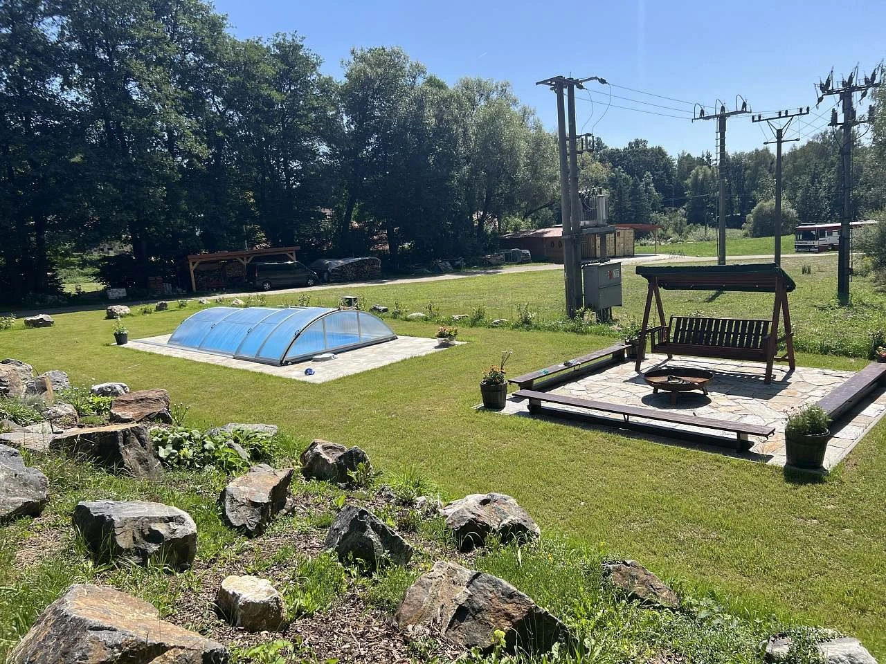 Areál je plně oplocený a nabízí dostatek soukromí. K dispozici je rozsáhlá venkovní plocha pro sportovní aktivity (např. volejbal, badminton, malá kopaná) a možnost využití hřiště. Vhodné také pro pořádání menších akcí, jako jsou oslavy, svatby nebo teambuildingy. Parkování je zajištěno přímo v areálu s kapacitou až 40 vozidel, včetně možnosti stání pro karavany nebo přespání ve vlastním stanu.
