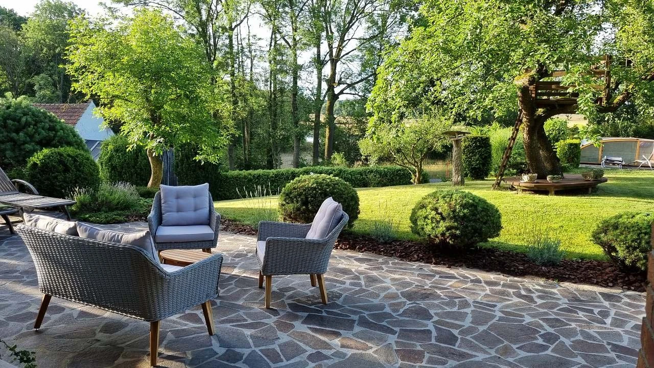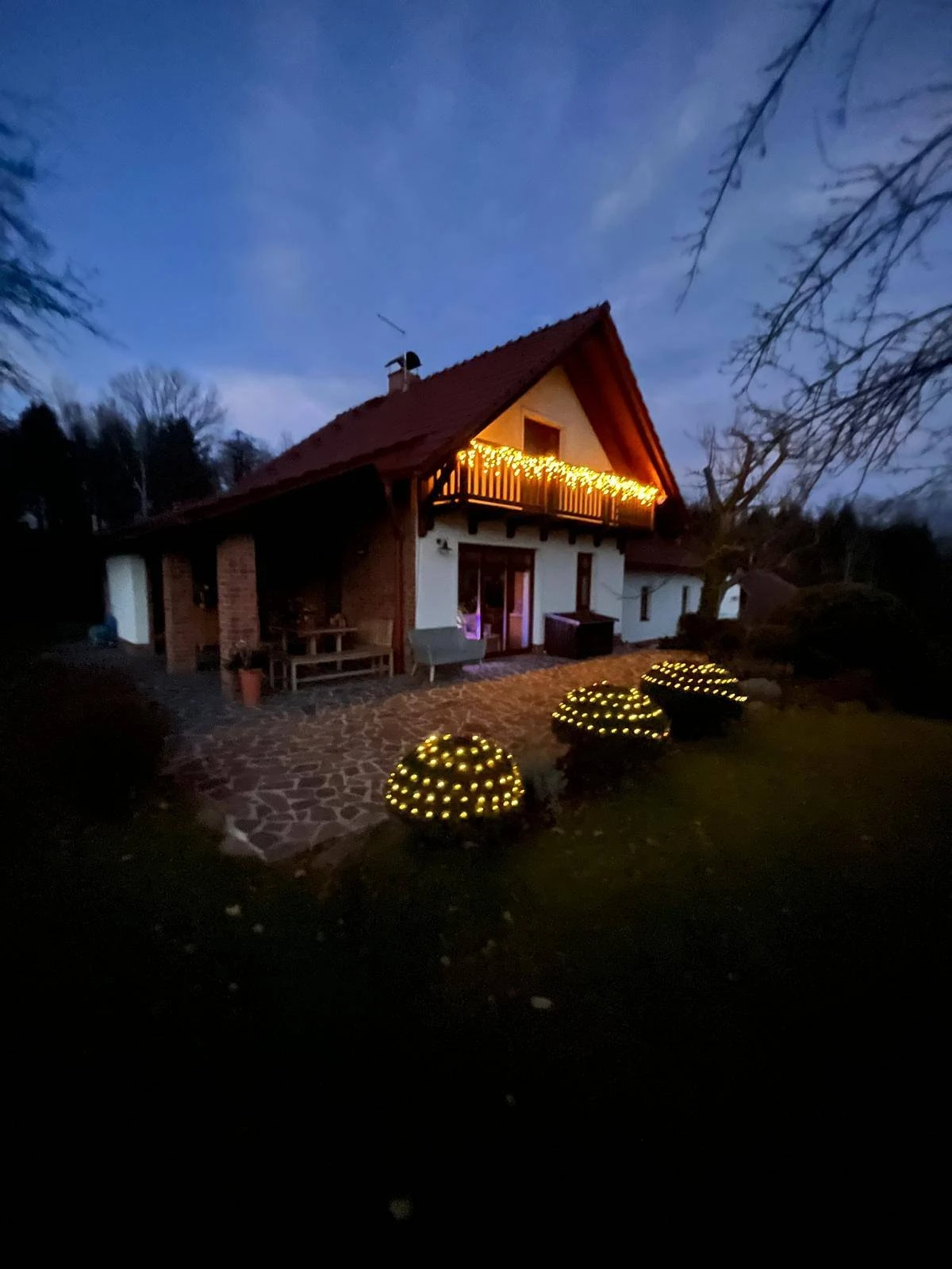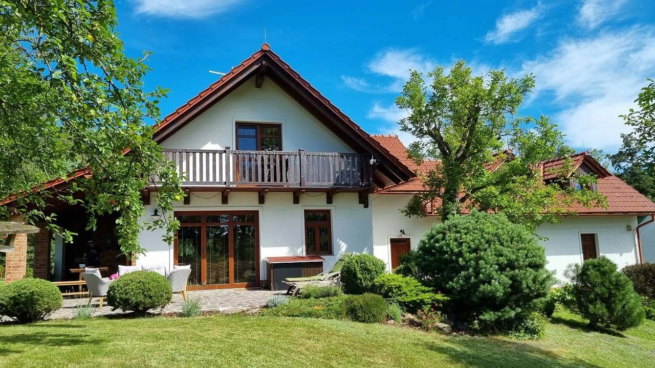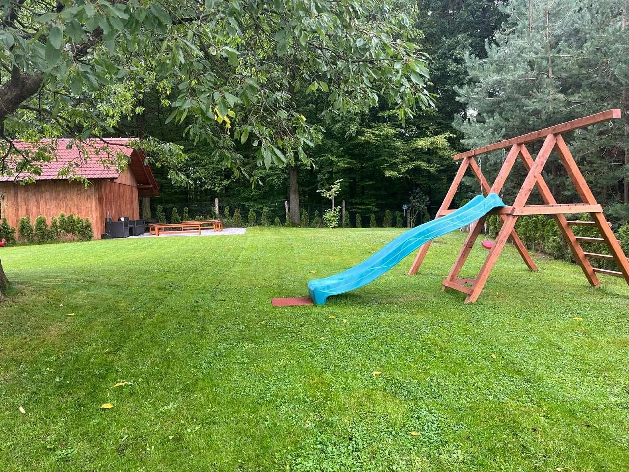 Pozemek je rozlehlý a udržovaný, poskytuje dostatek prostoru pro volný pohyb i soukromí. Pro děti jsou připraveny prvky jako houpačka, skluzavka a domek na stromě. Dům je situován na samotě u lesa , v přírodě , což rozšiřuje možnosti trávení volného času.