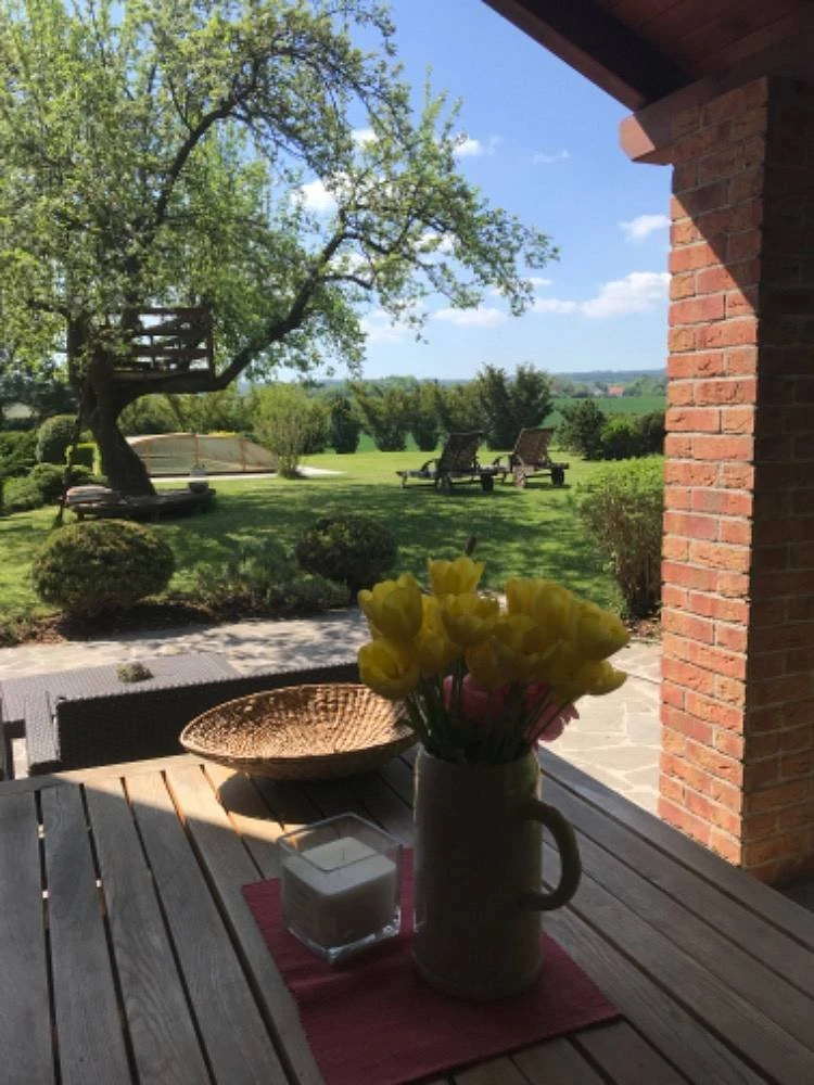 Součástí objektu je venkovní vyhřívaný bazén, který je zapuštěný a krytý, obvykle využitelný od jara do podzimu podle počasí. Dále je k dispozici finská sauna a vnitřní krb, což umožňuje využití domu i mimo hlavní sezónu. Na zahradě se nachází několik posezení včetně posezení u ohniště , vhodné pro společné stravování nebo večerní pobyt venku.