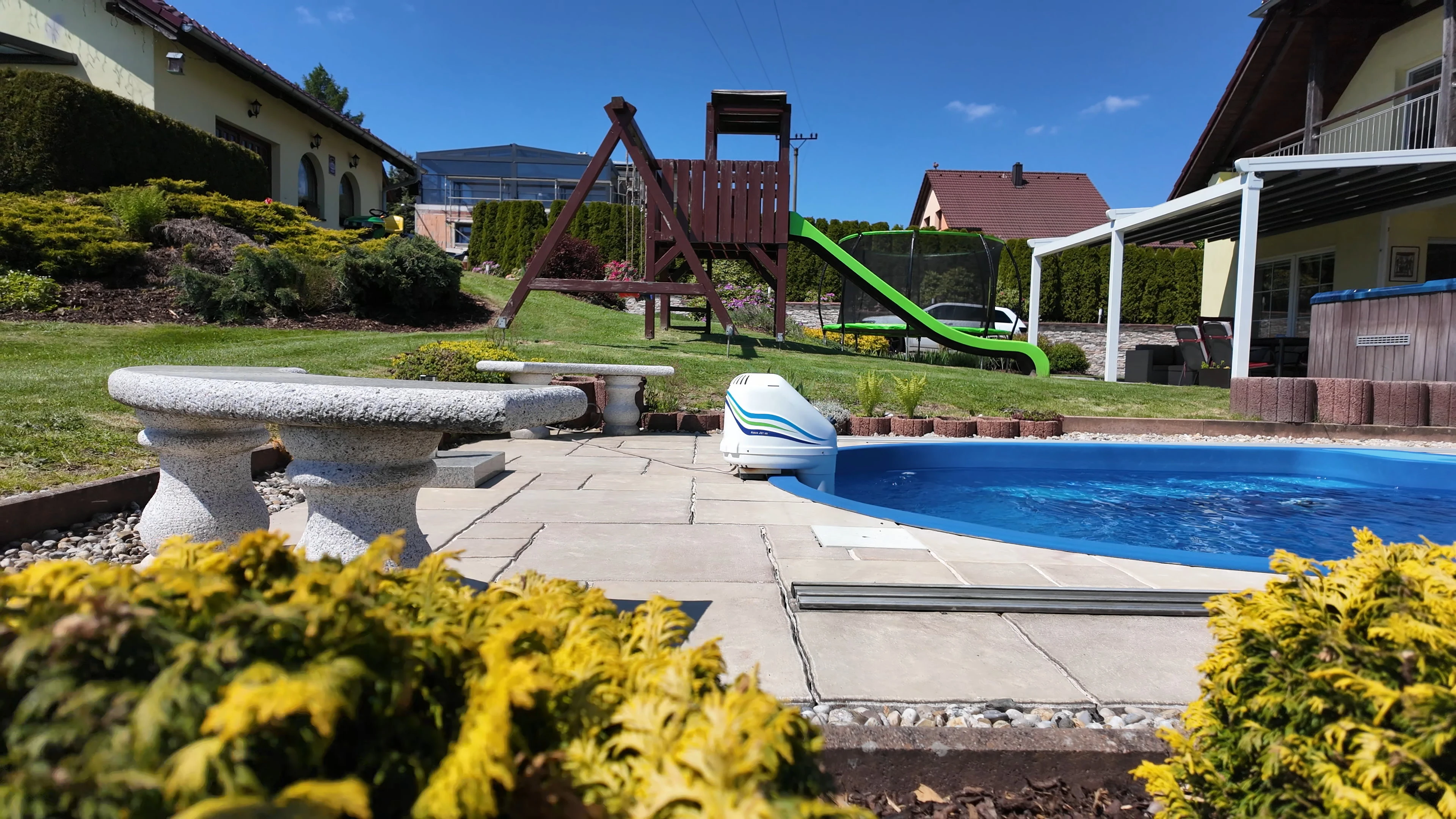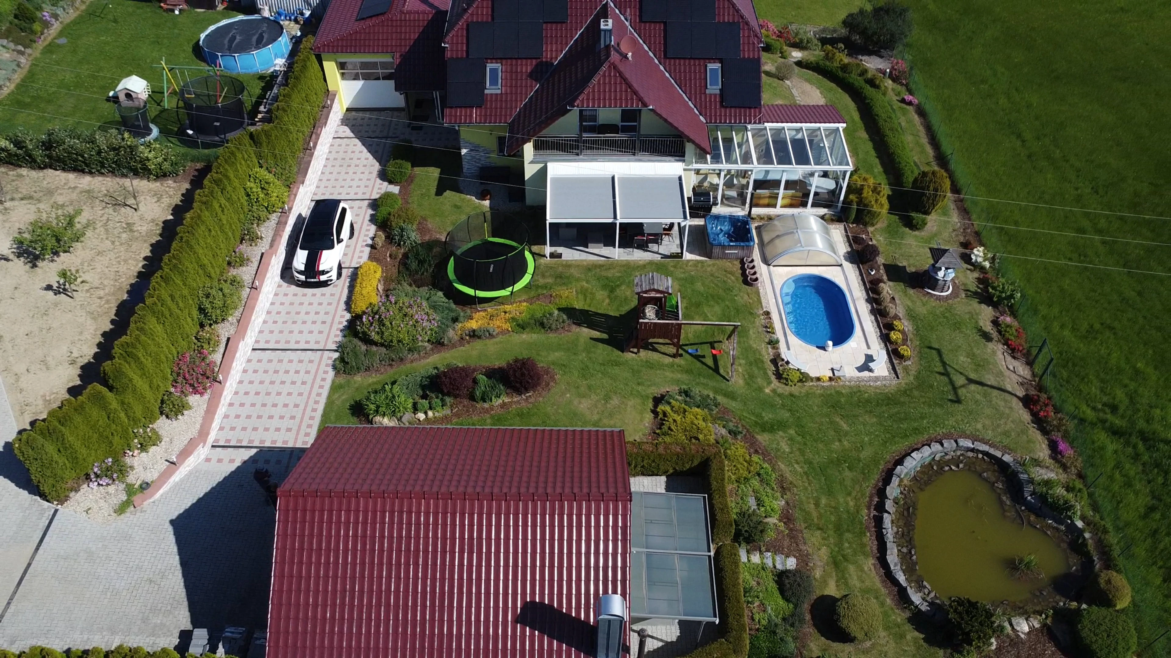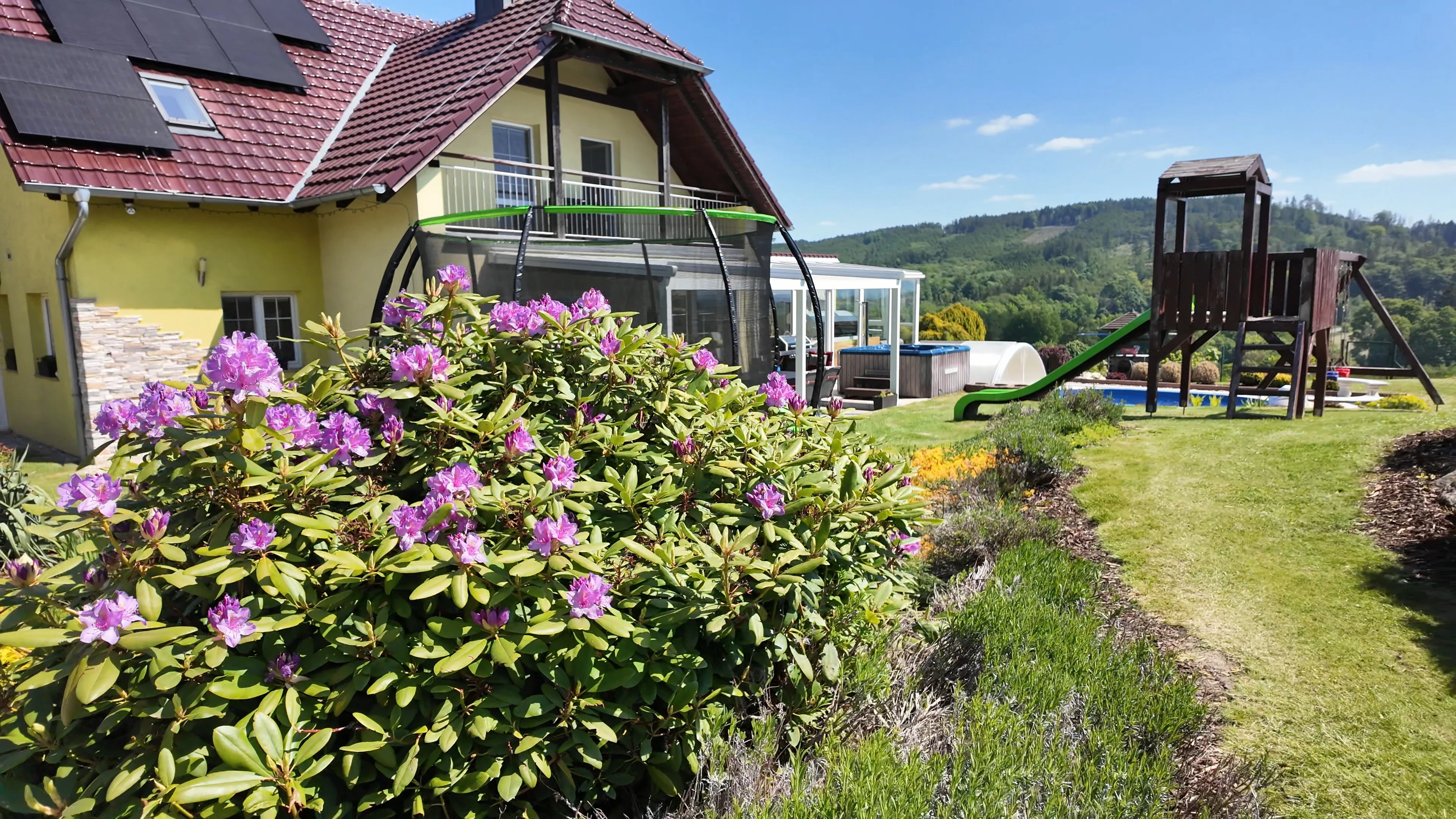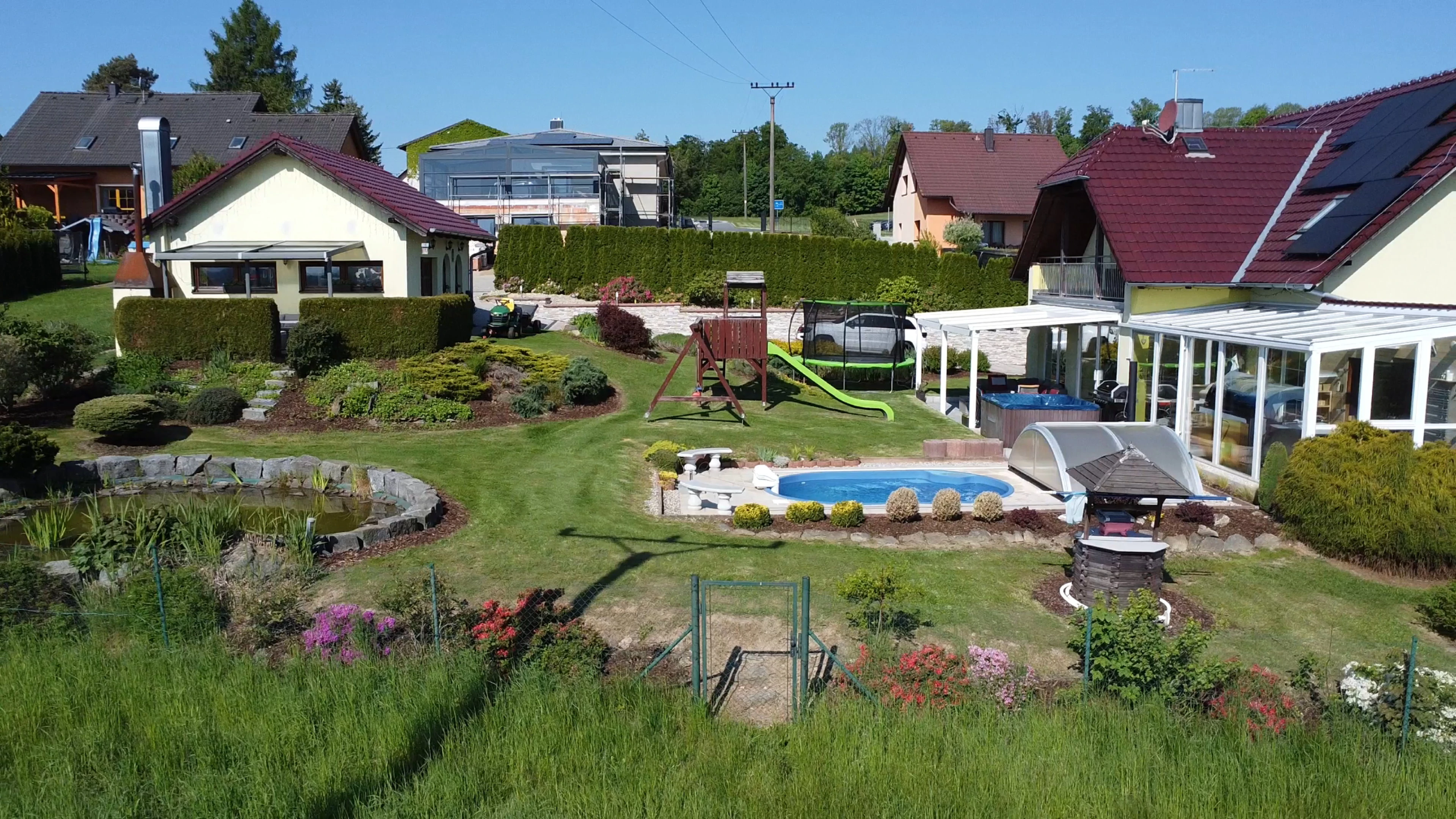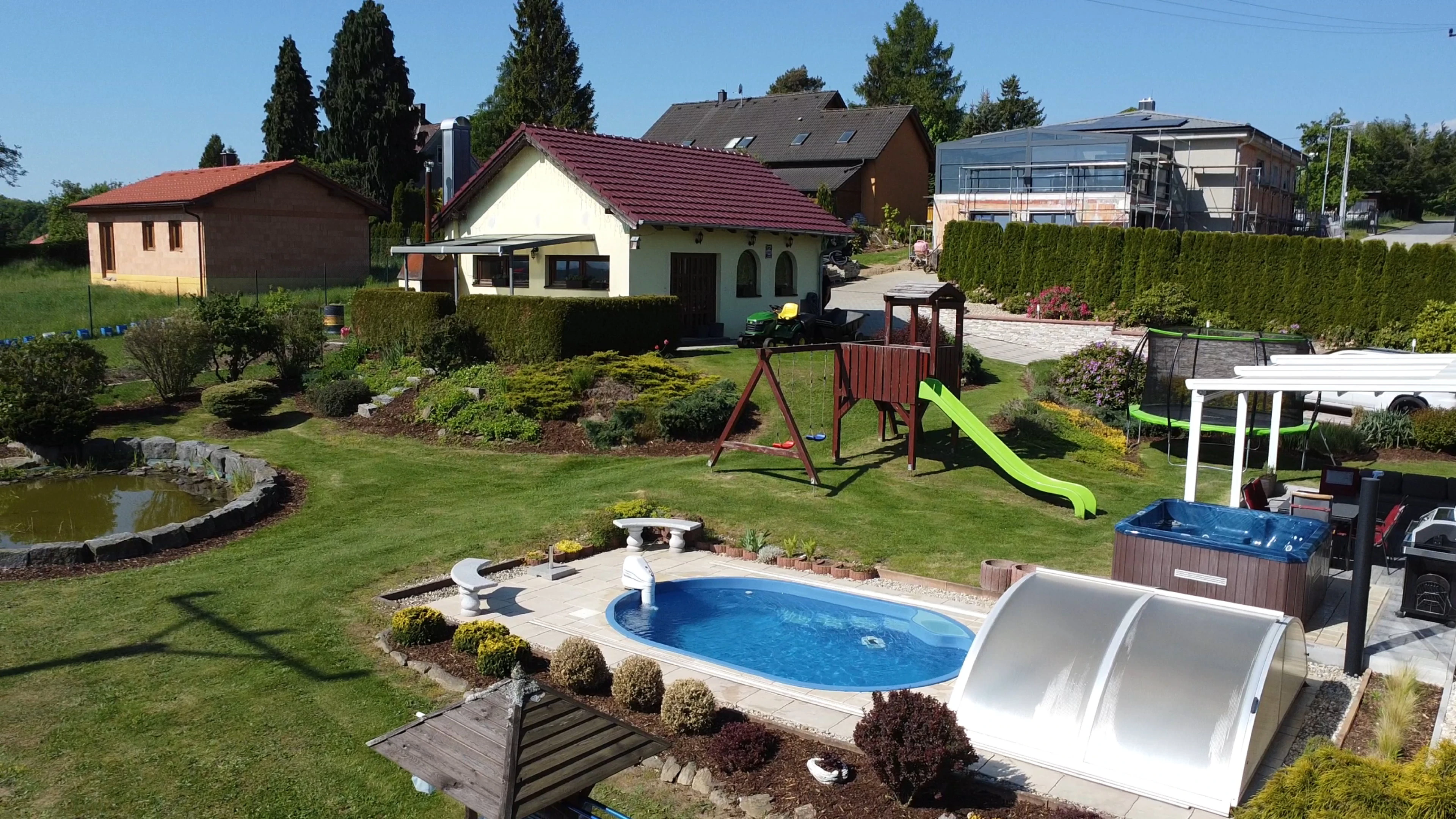 - Zahrada: krytý bazén s protiproudem, dětské hřiště se skluzavkou, trampolína 3,6 m, venkovní pingpongový stůl, jezírko