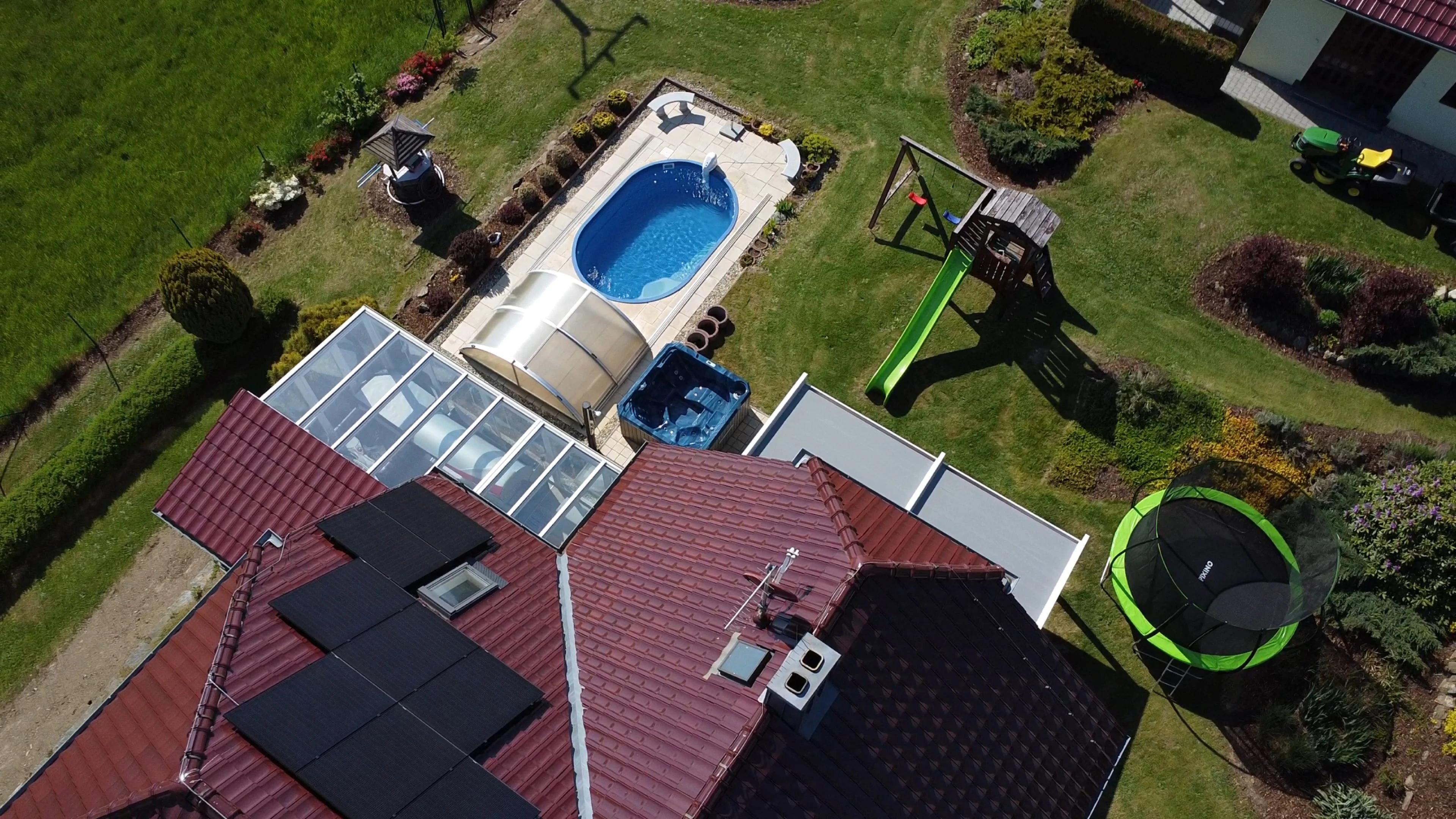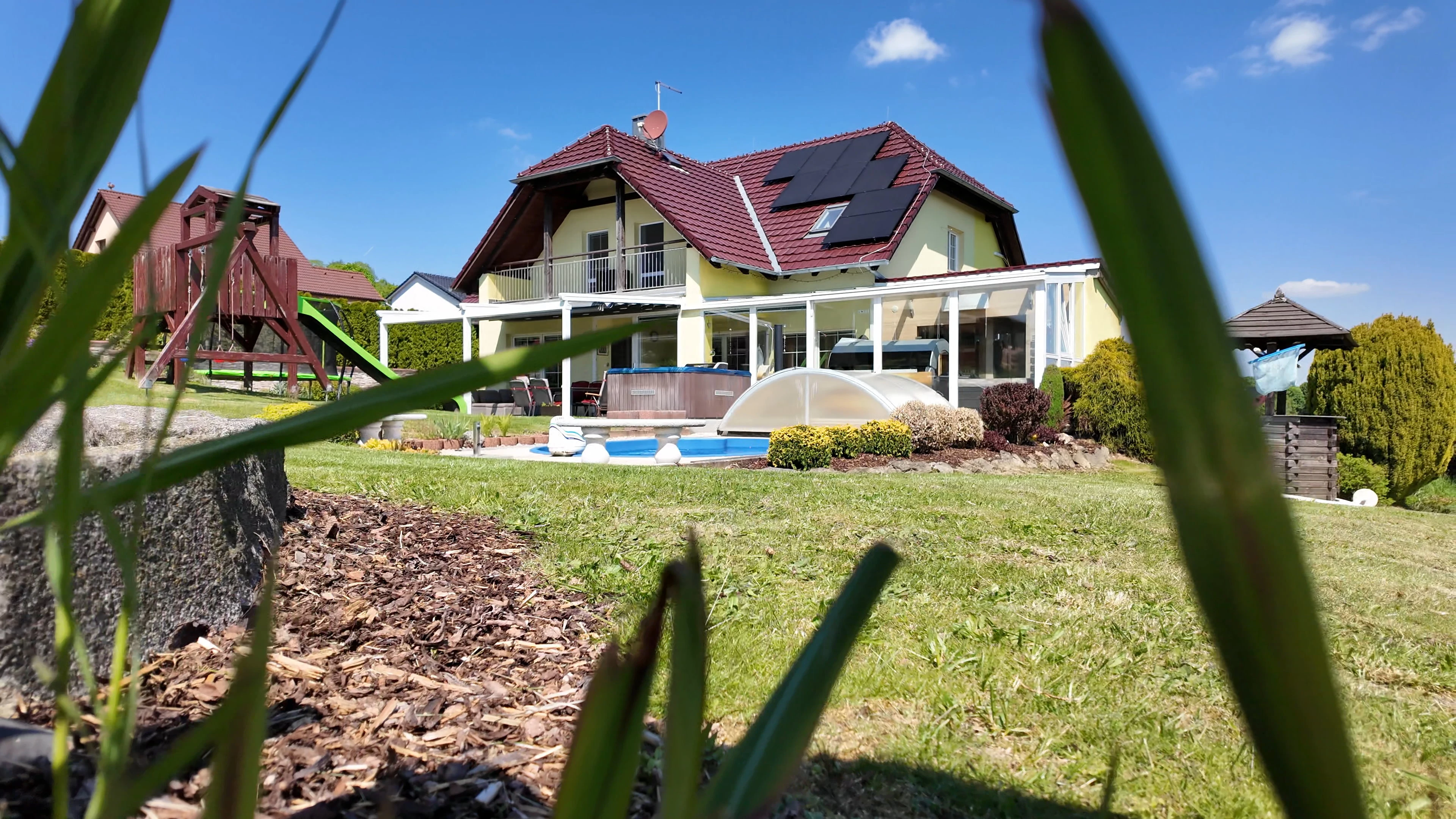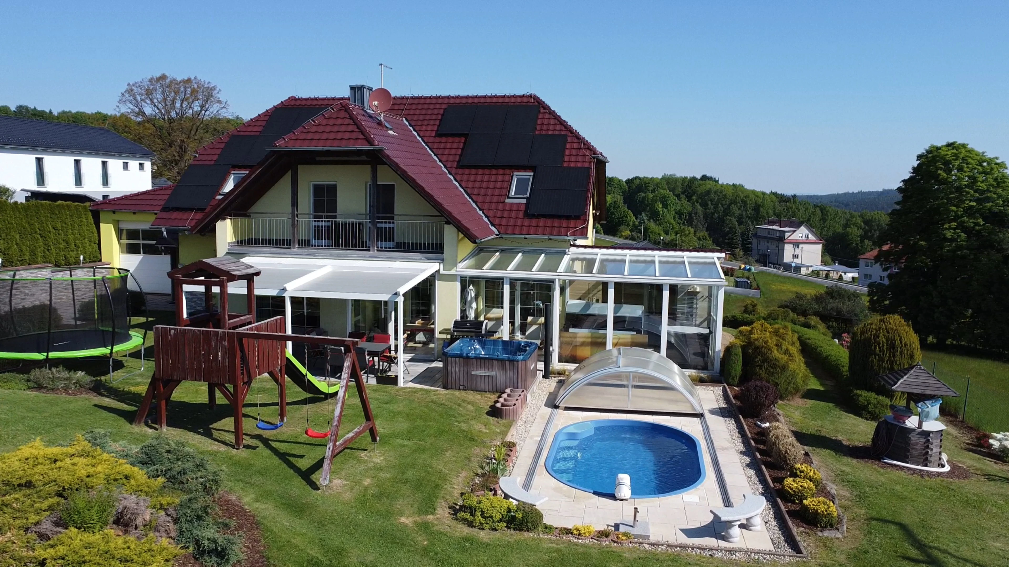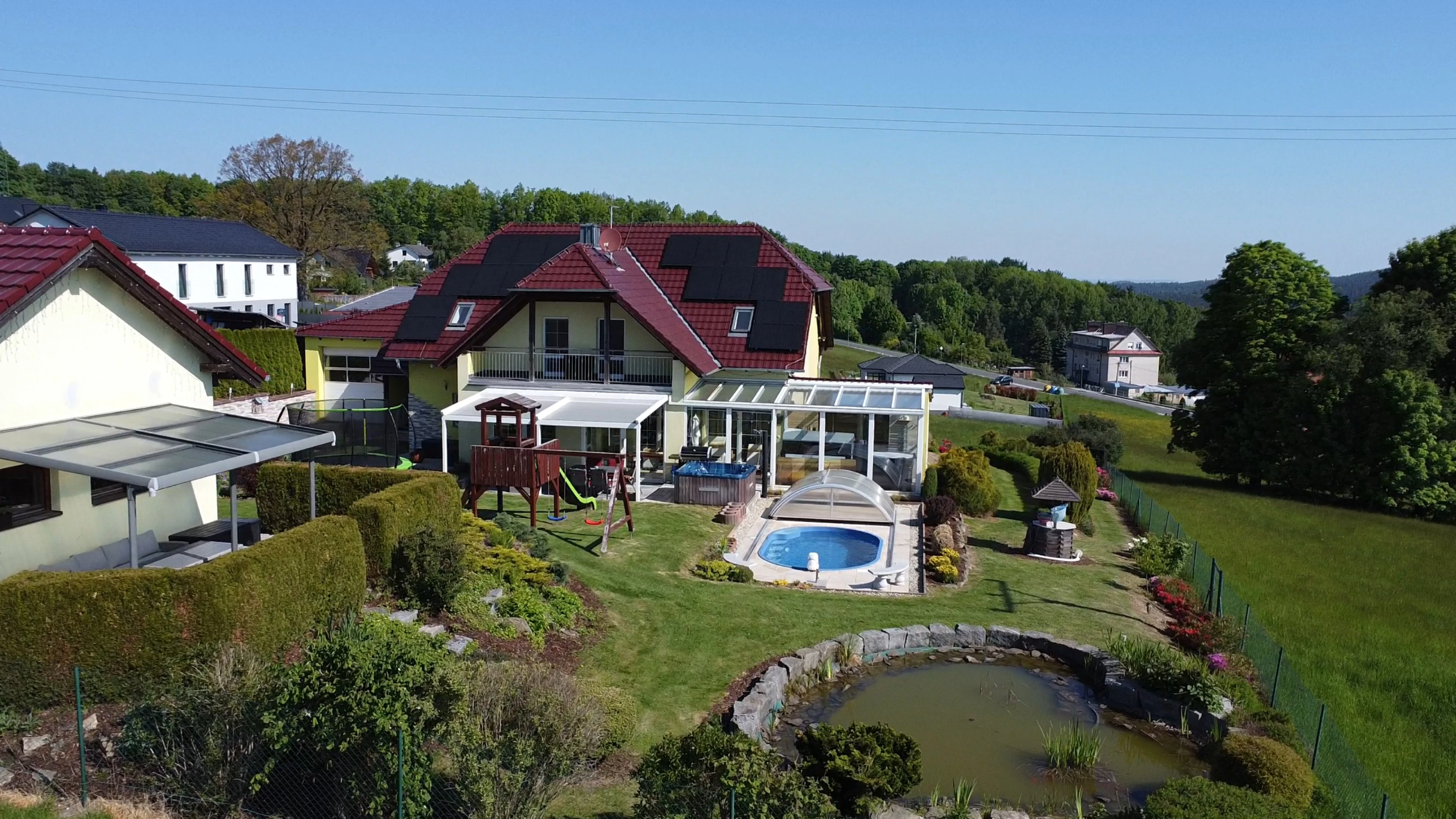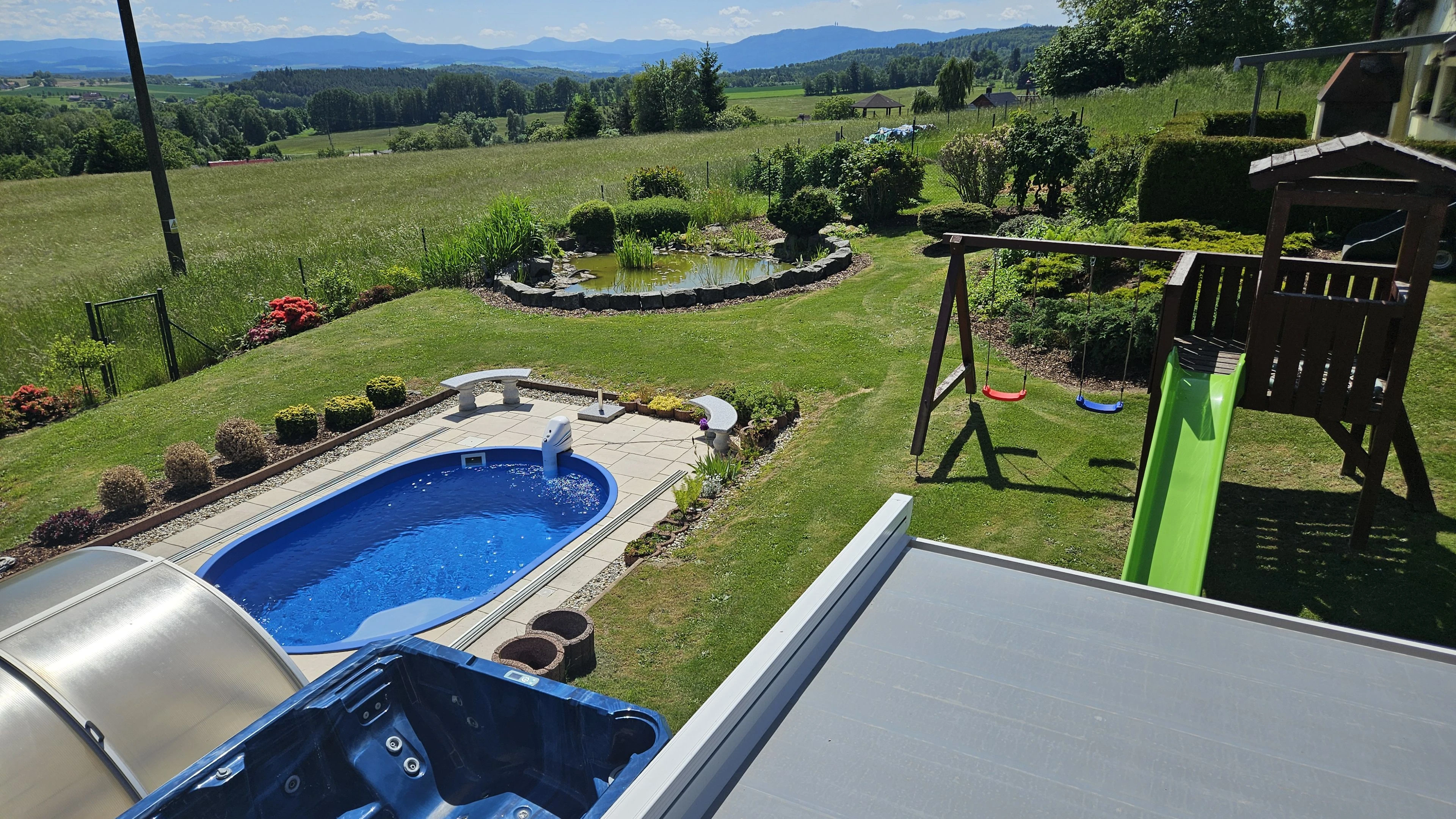 - Zahrada: krytý bazén s protiproudem, dětské hřiště se skluzavkou, trampolína 3,6 m, venkovní pingpongový stůl, jezírko