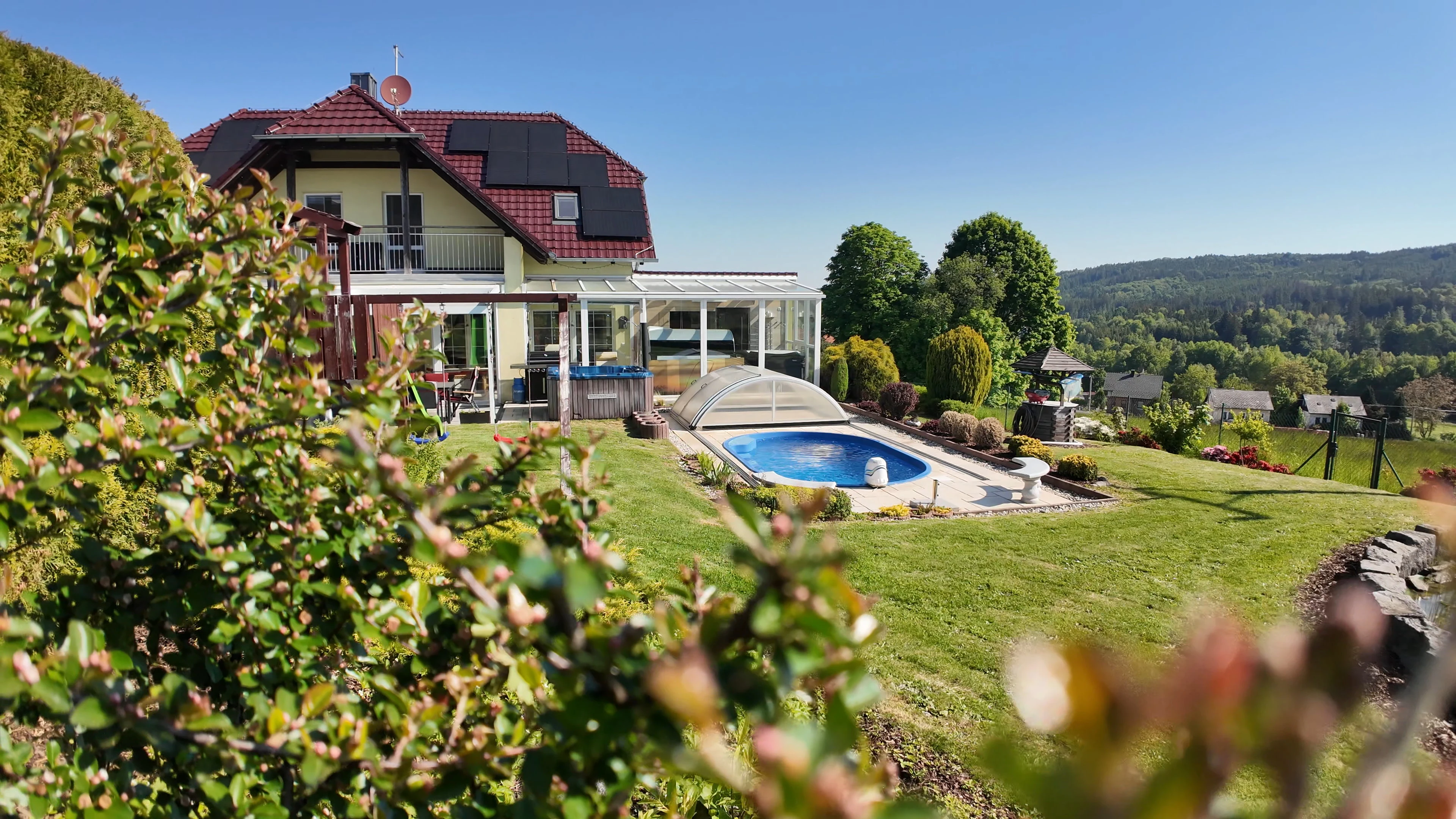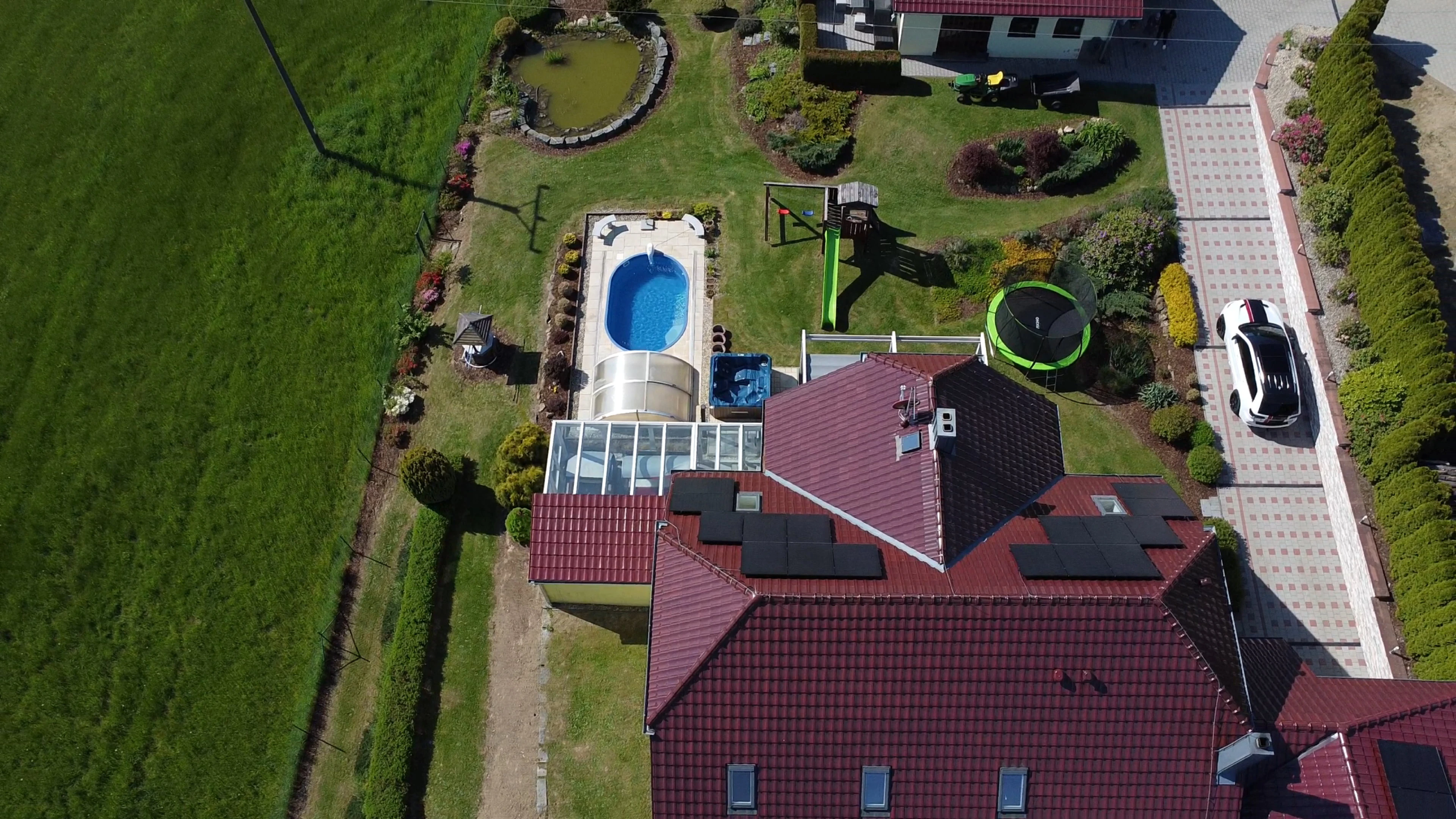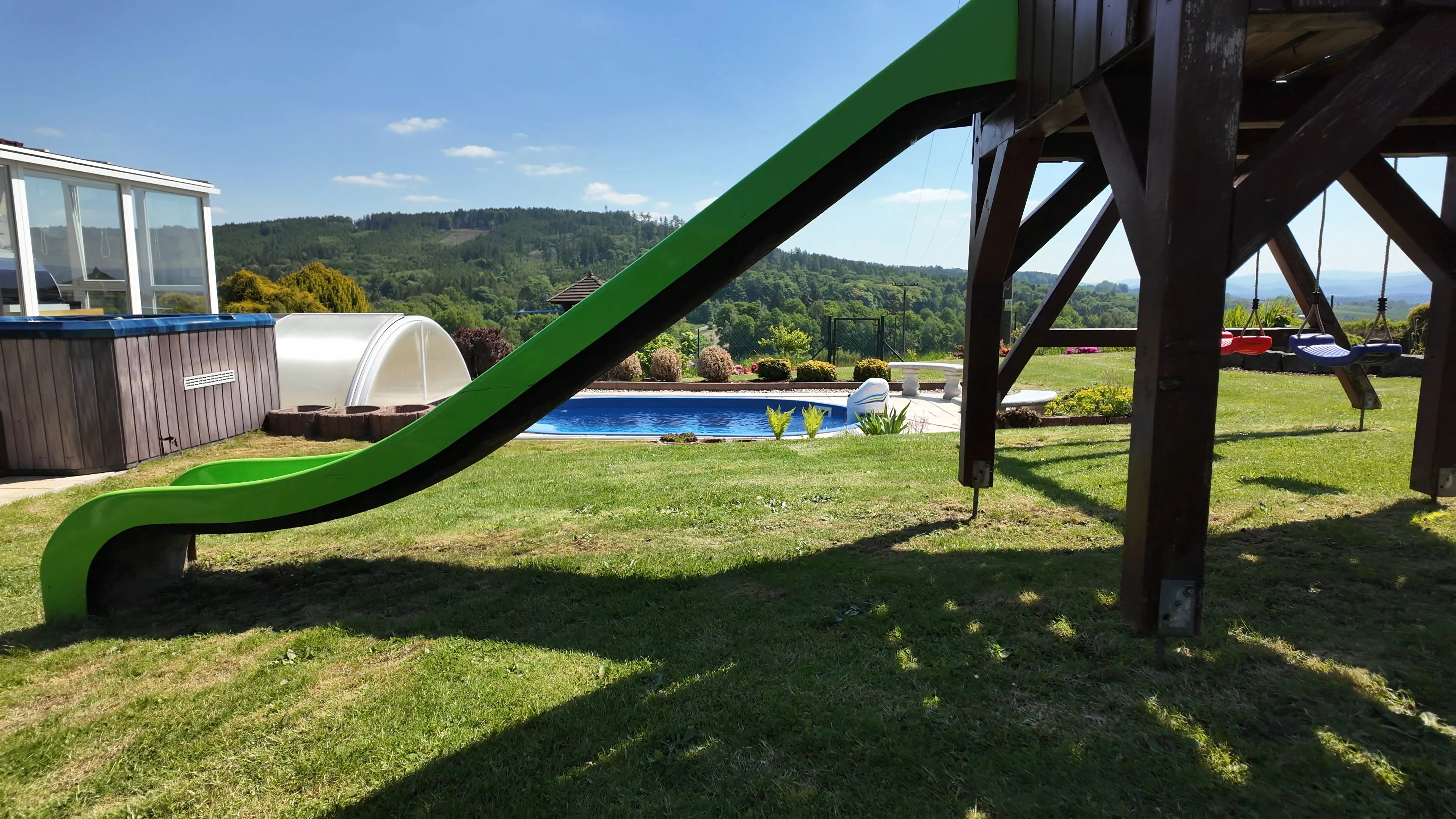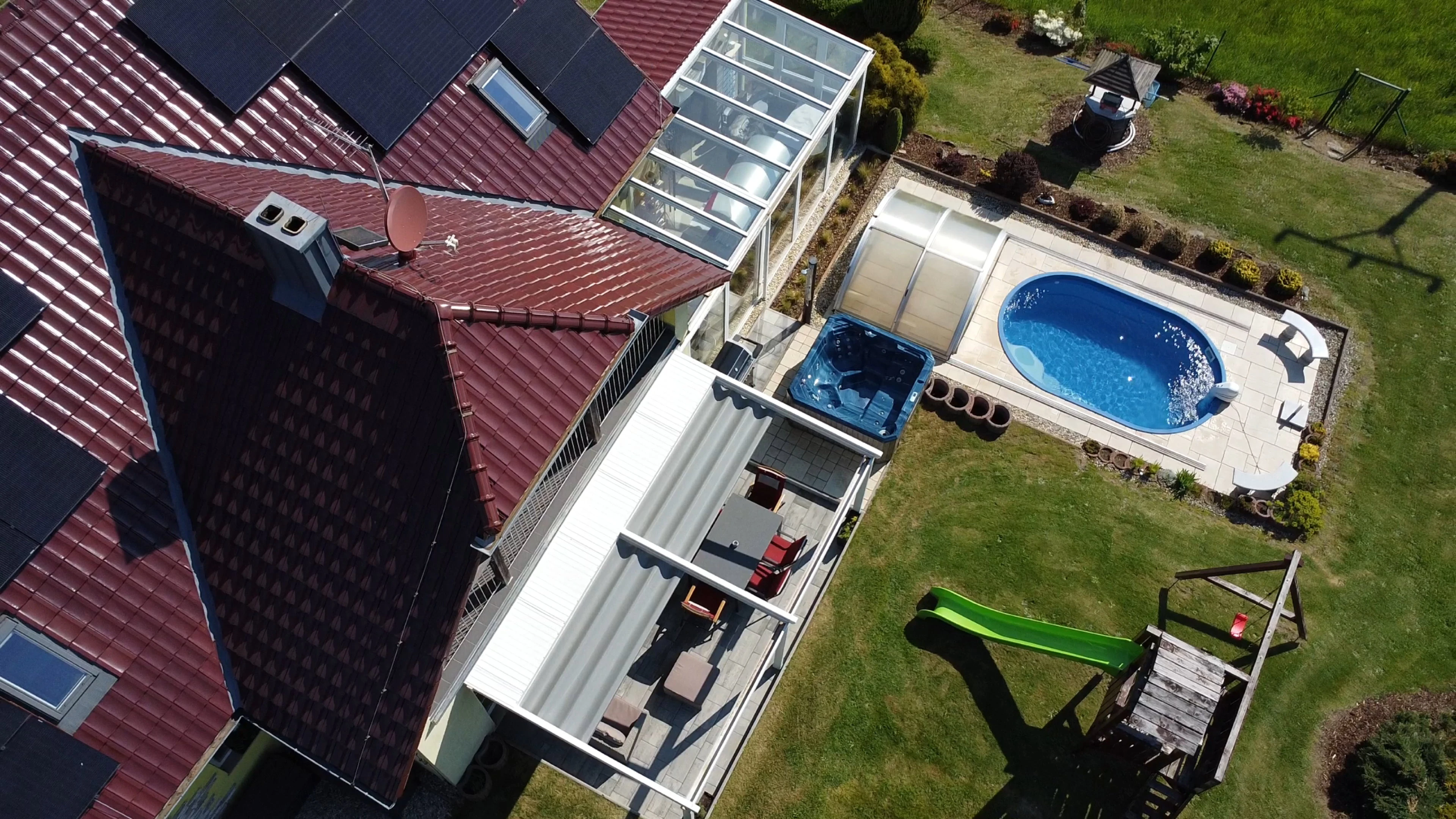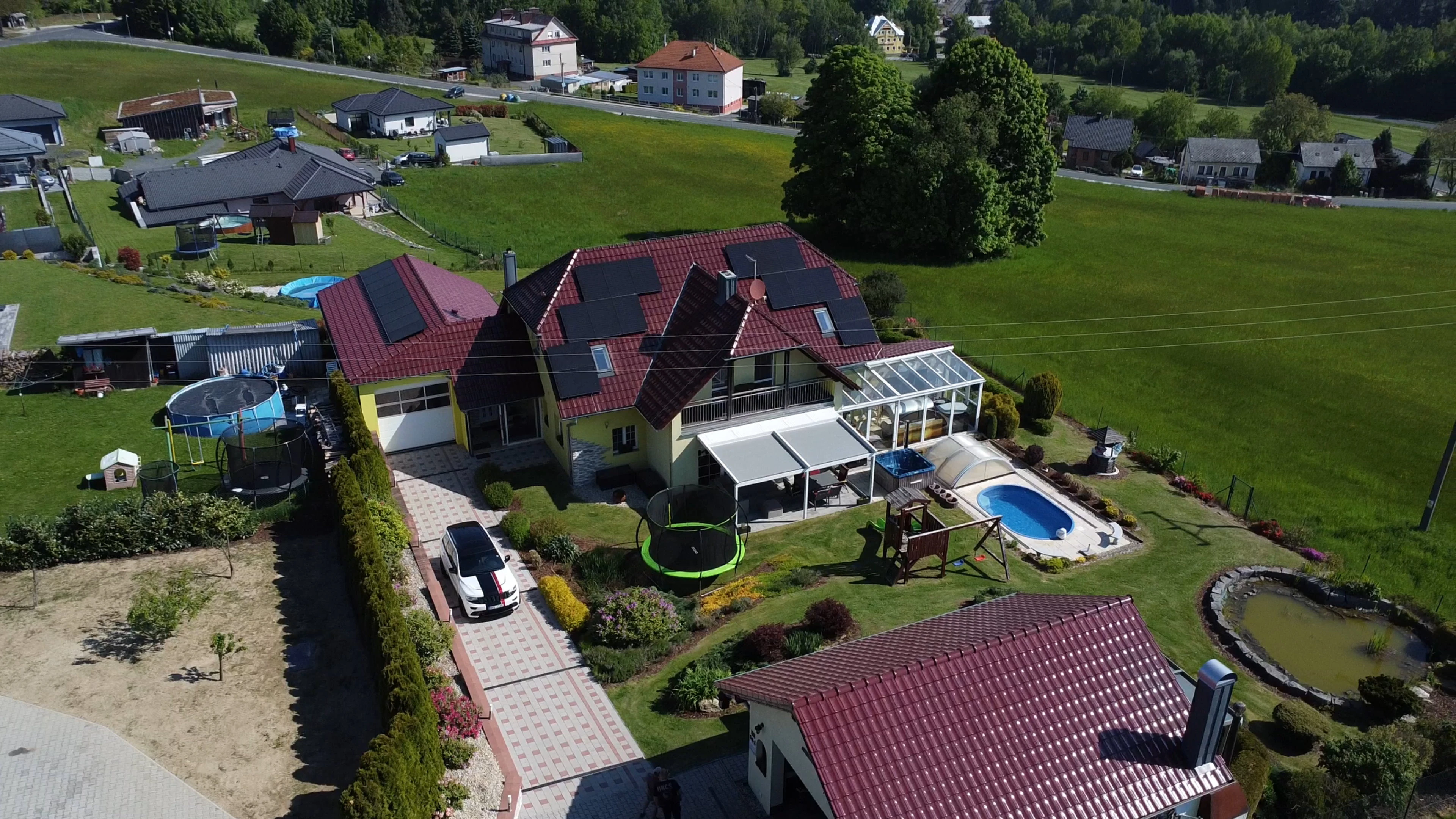 - Zahrada: krytý bazén s protiproudem, dětské hřiště se skluzavkou, trampolína 3,6 m, venkovní pingpongový stůl, jezírko