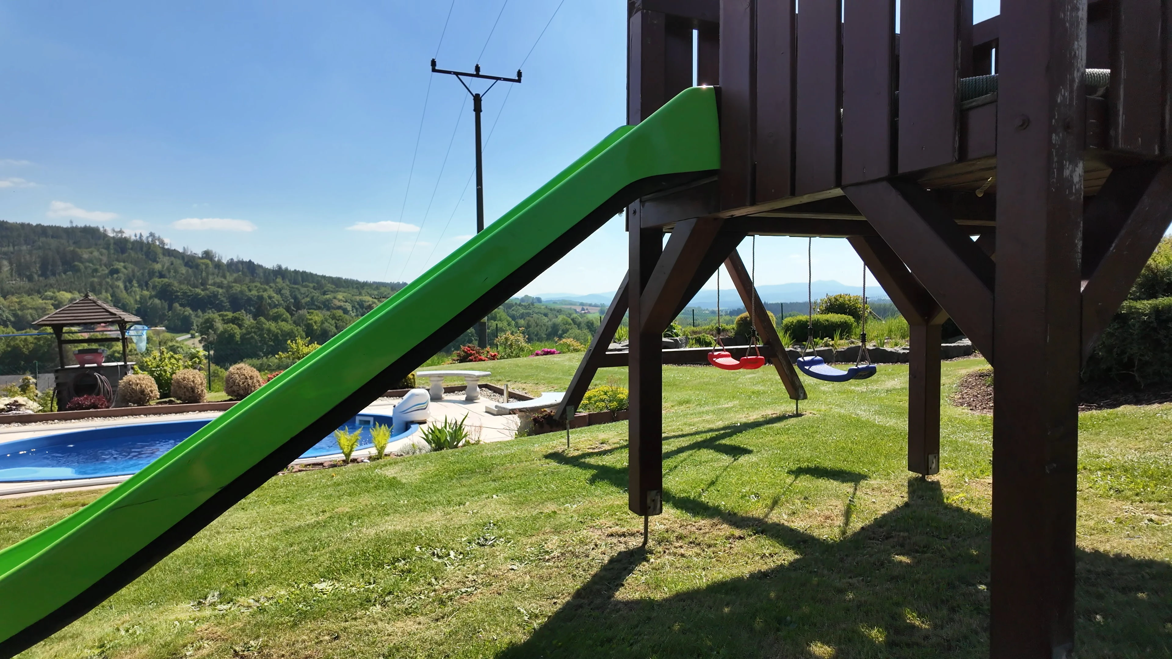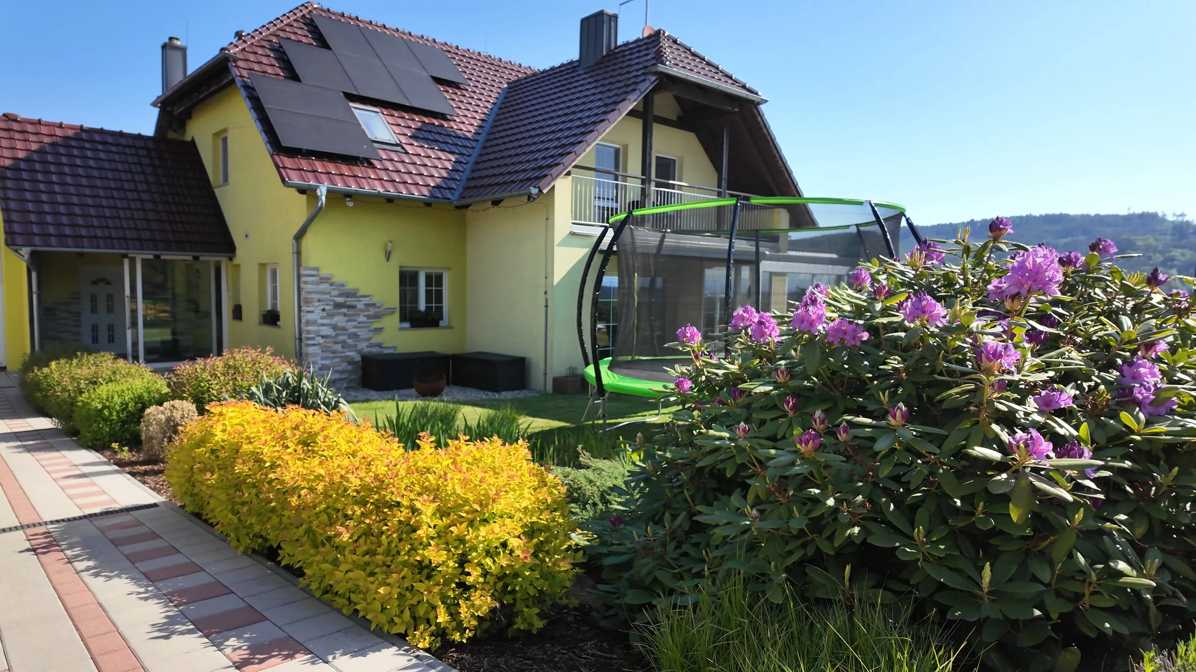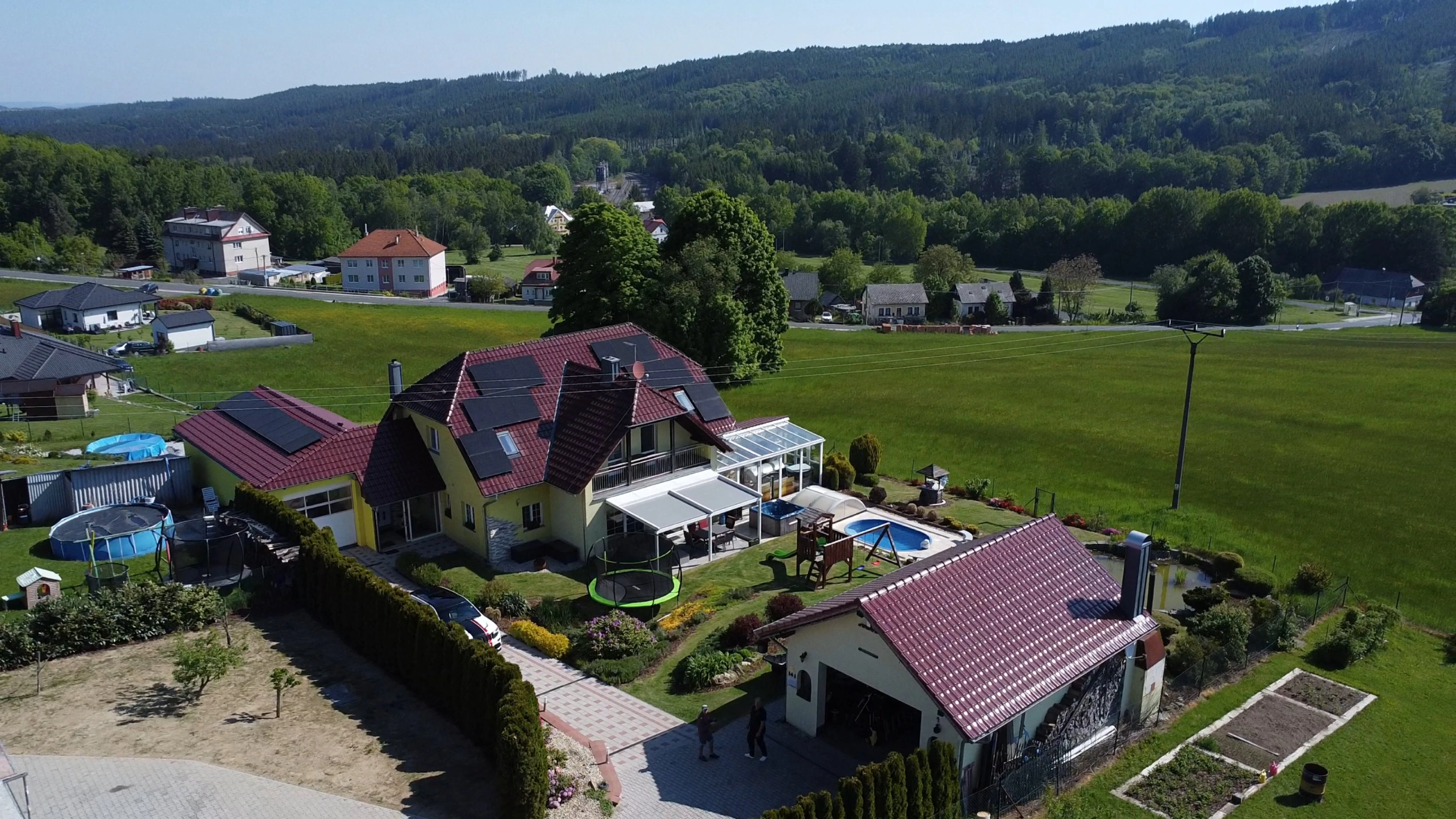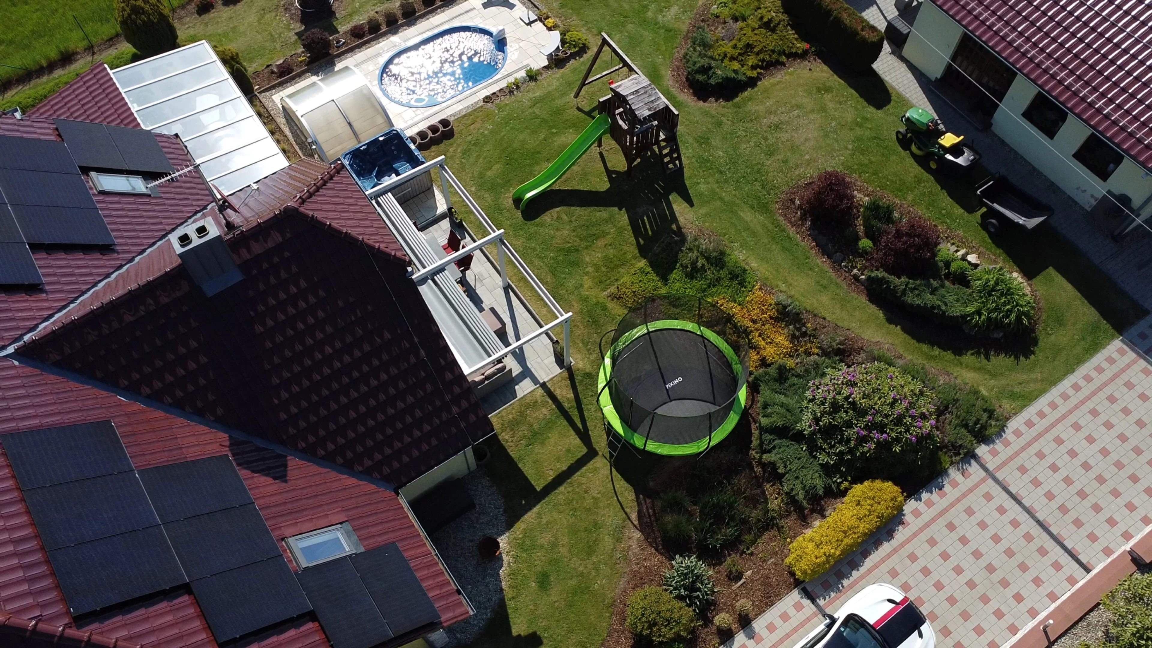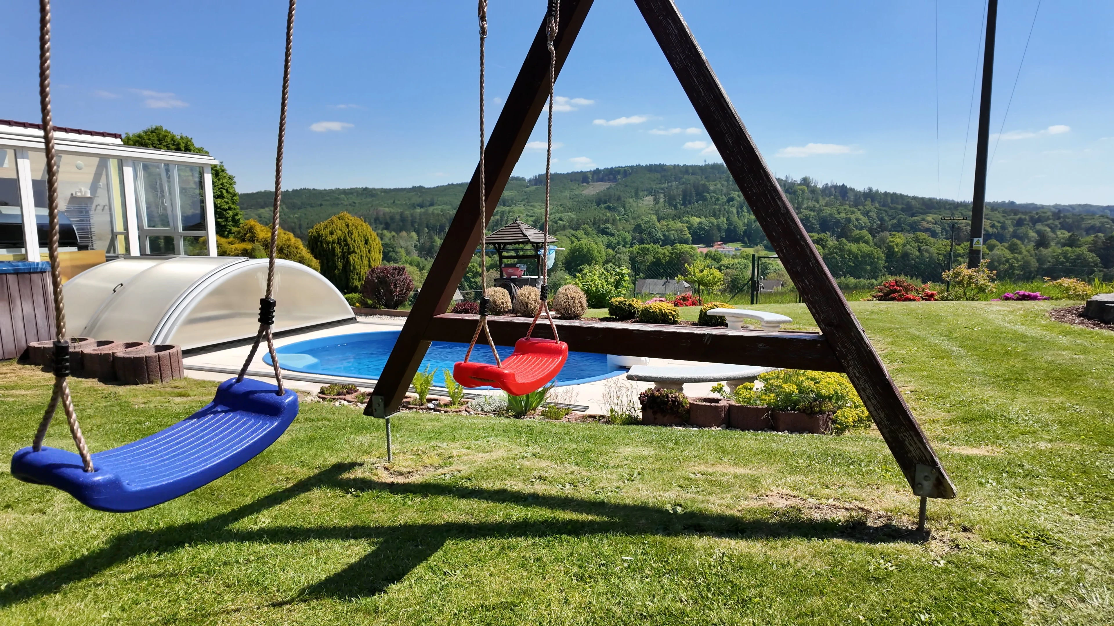 - Zahrada: krytý bazén s protiproudem, dětské hřiště se skluzavkou, trampolína 3,6 m, venkovní pingpongový stůl, jezírko