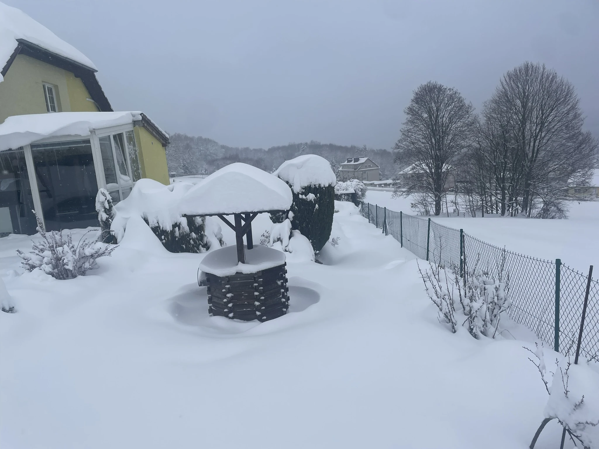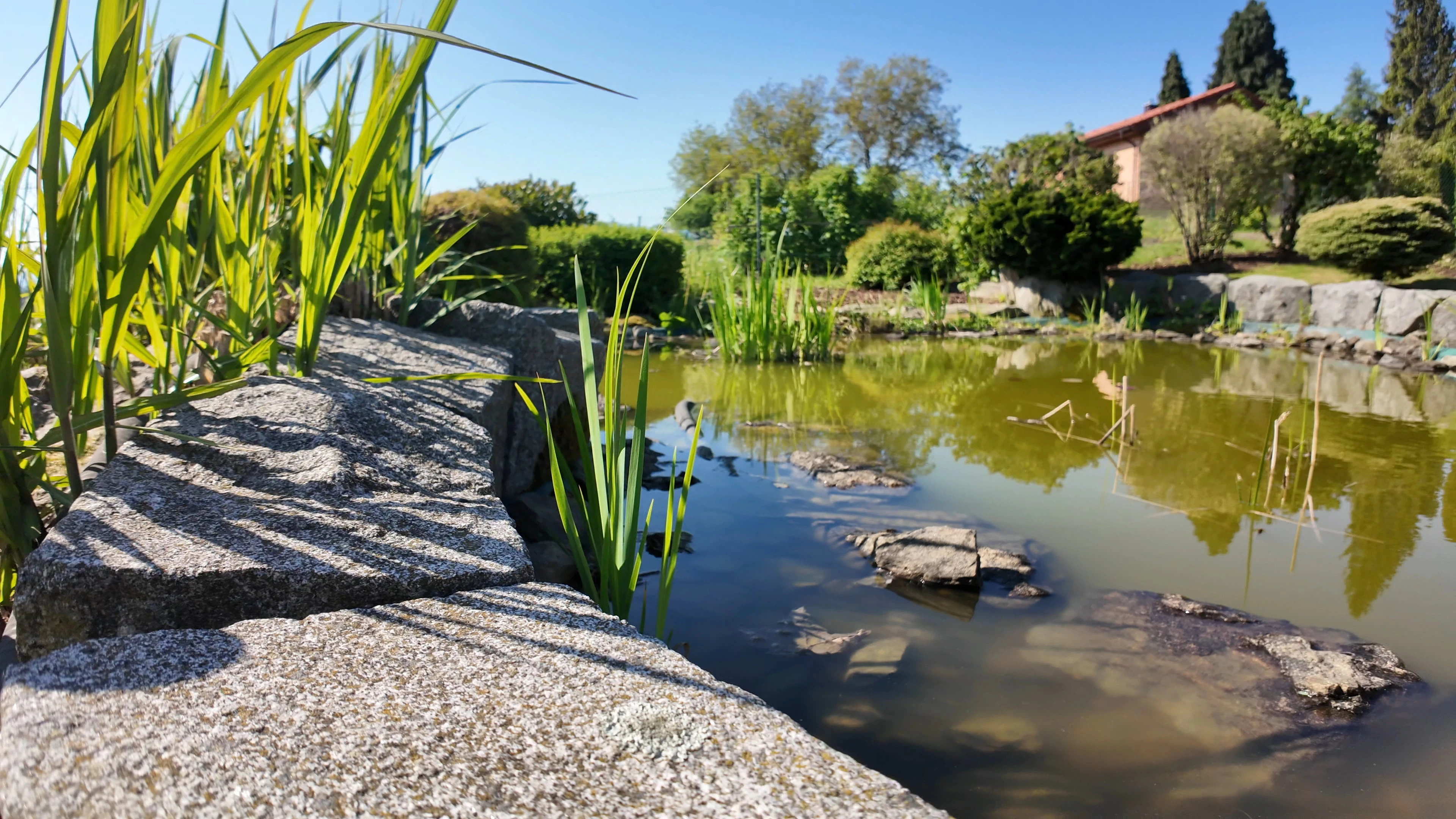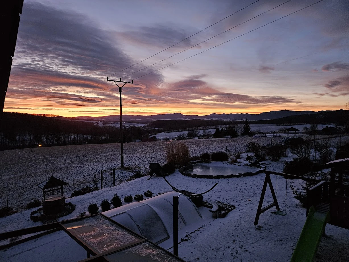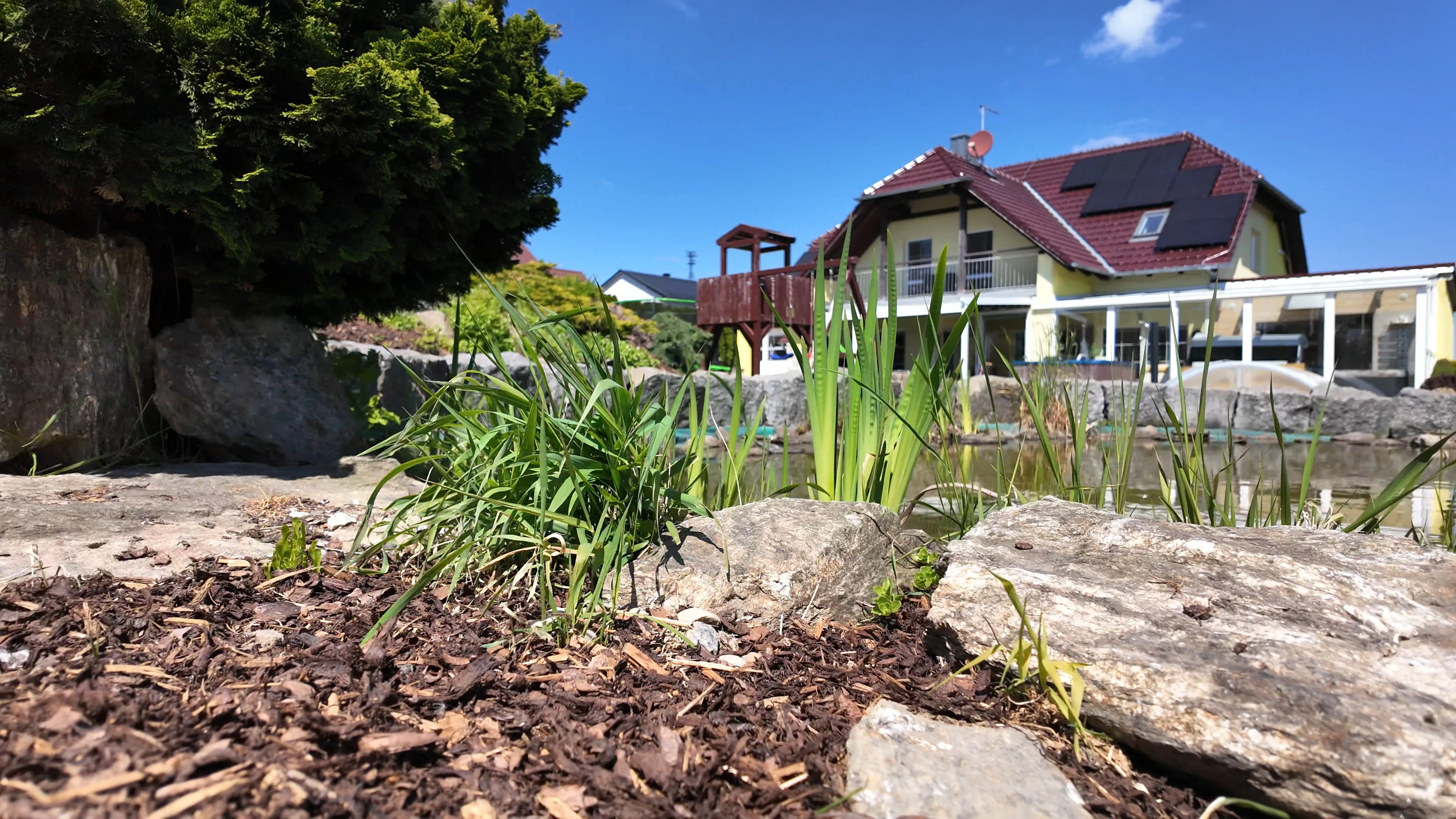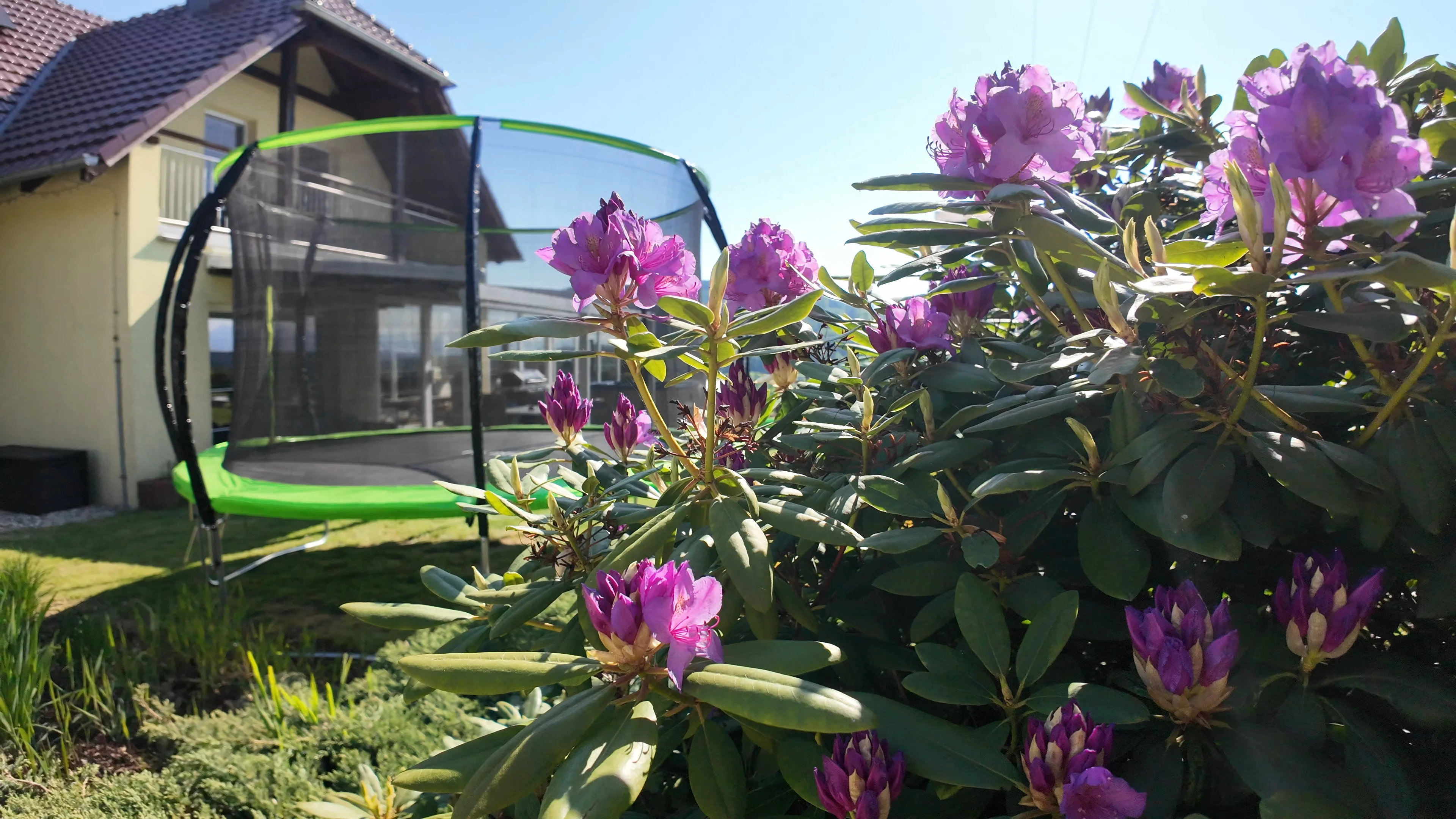 - Zahrada: krytý bazén s protiproudem, dětské hřiště se skluzavkou, trampolína 3,6 m, venkovní pingpongový stůl, jezírko