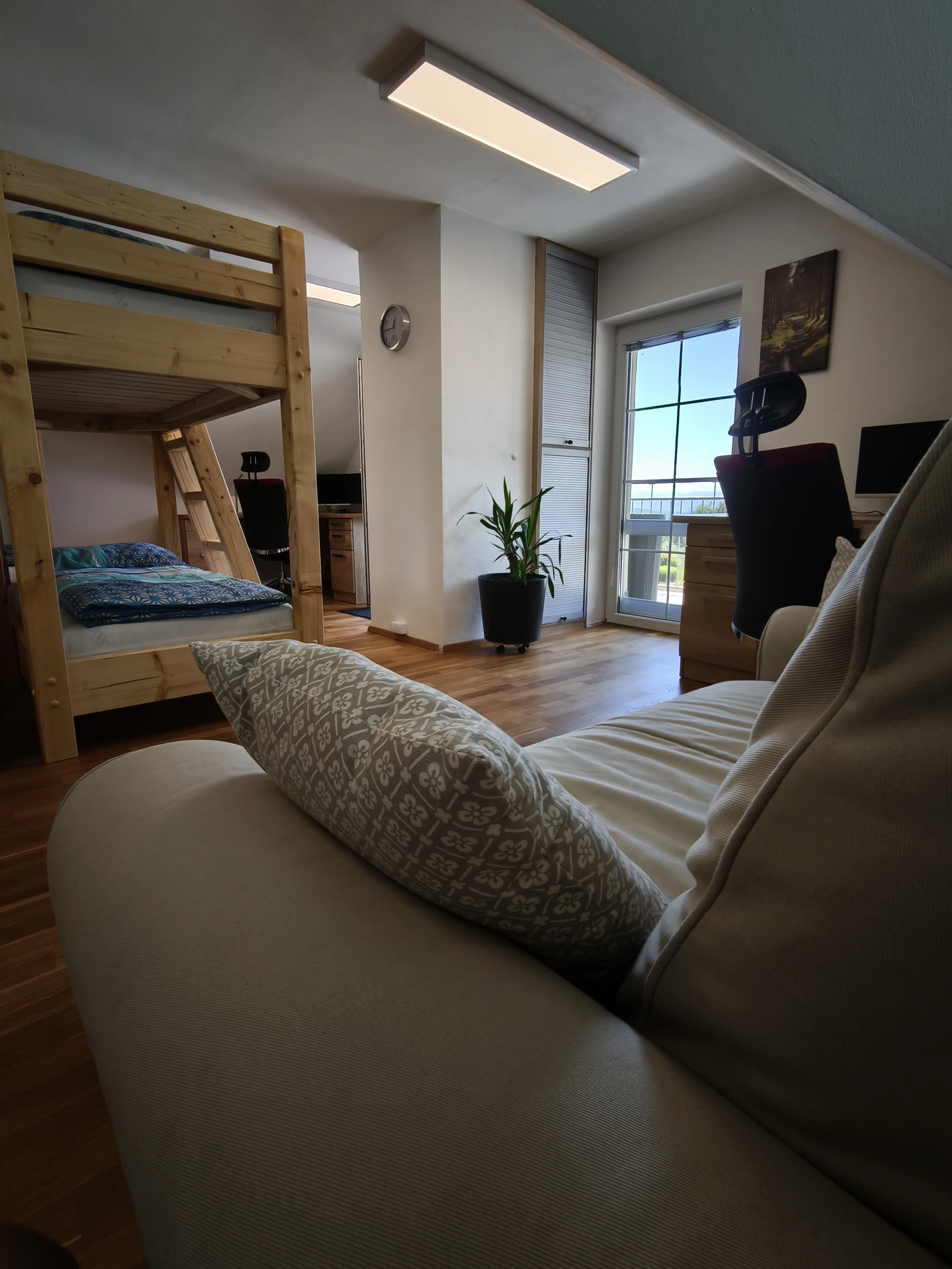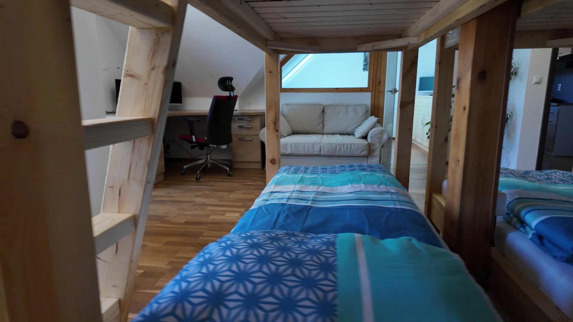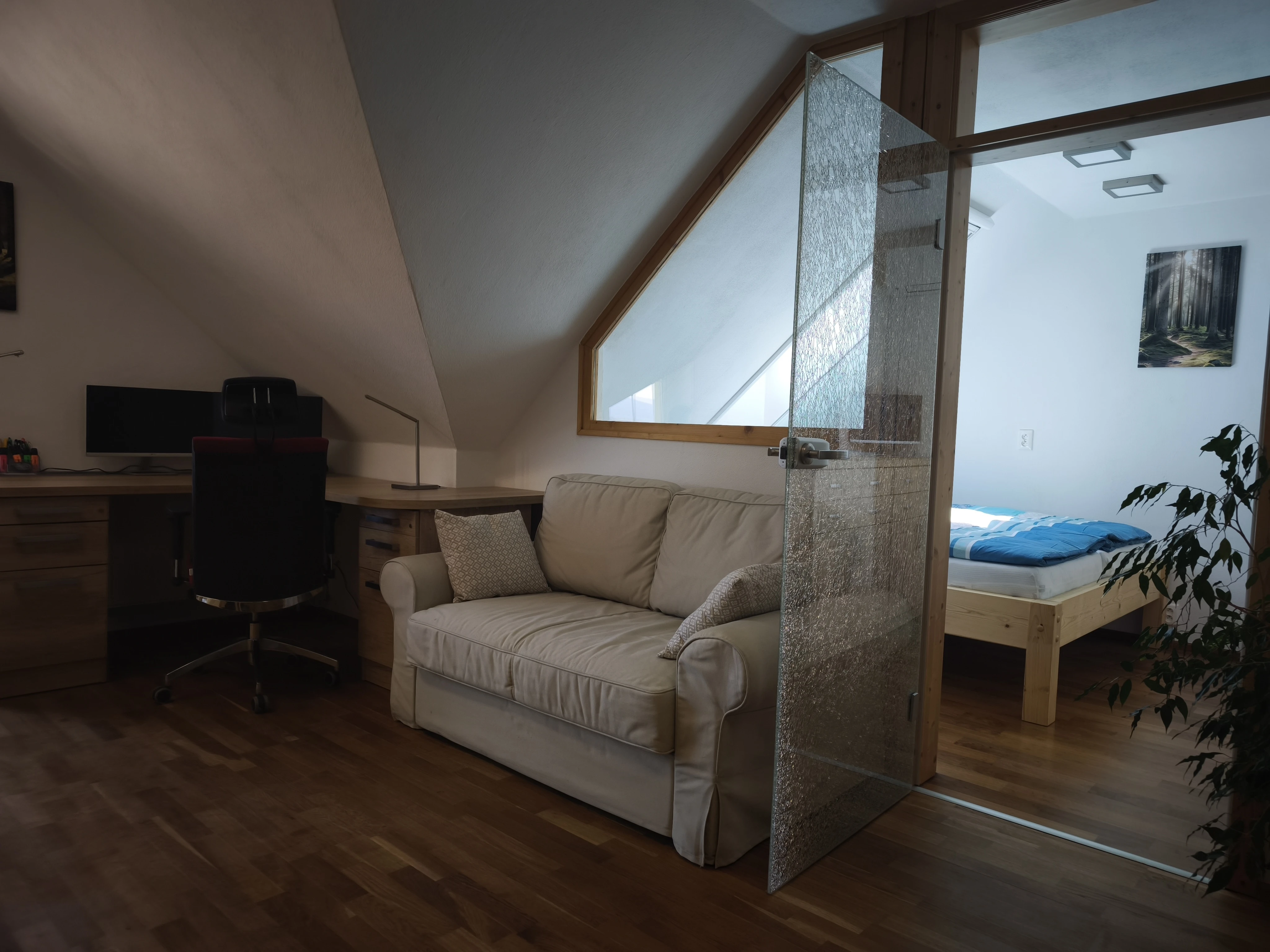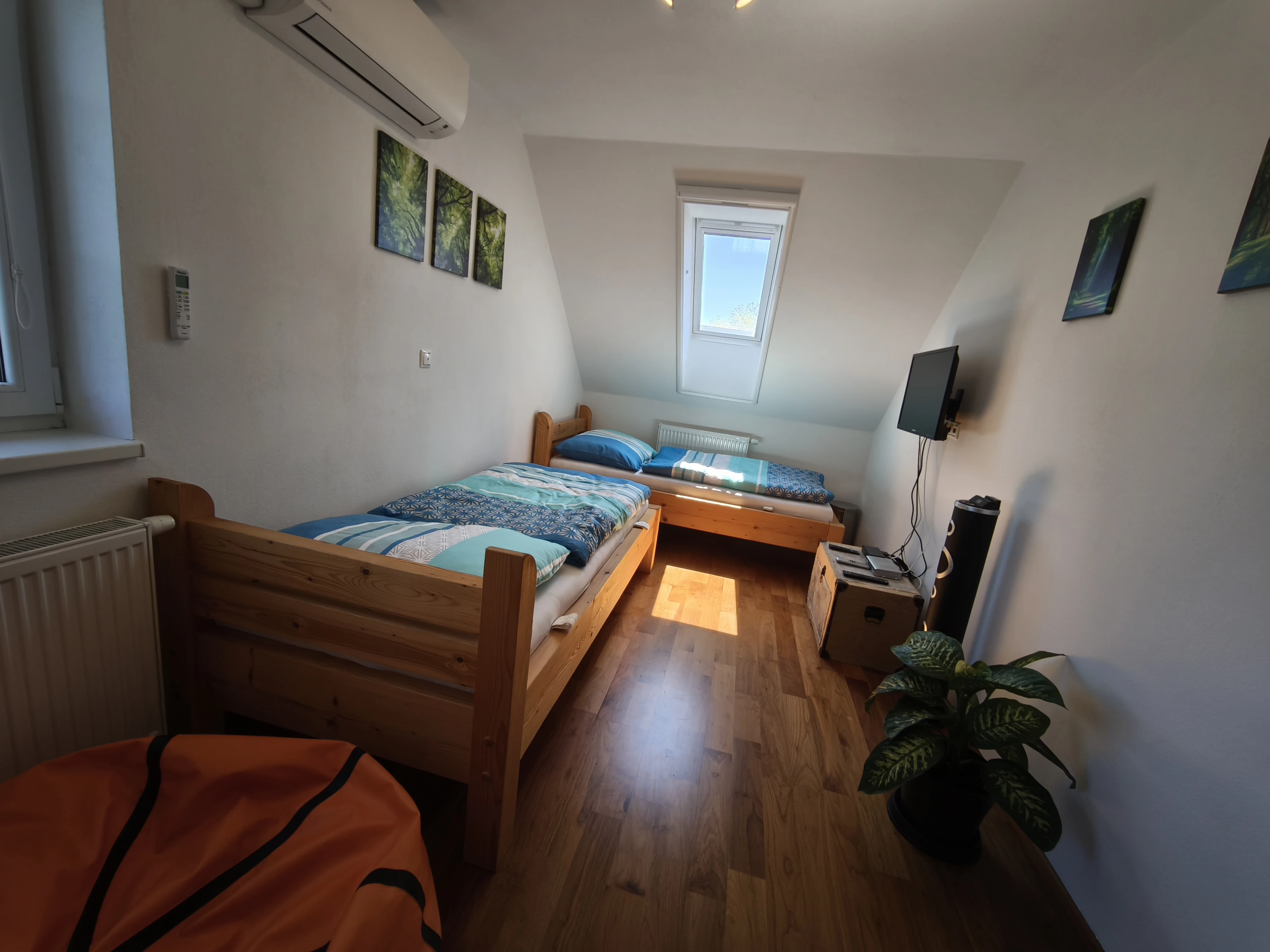 - Obývací pokoj patro: sedací souprava/rozkládací gauč 6+2 osob, klimatizace, dva psací stoly