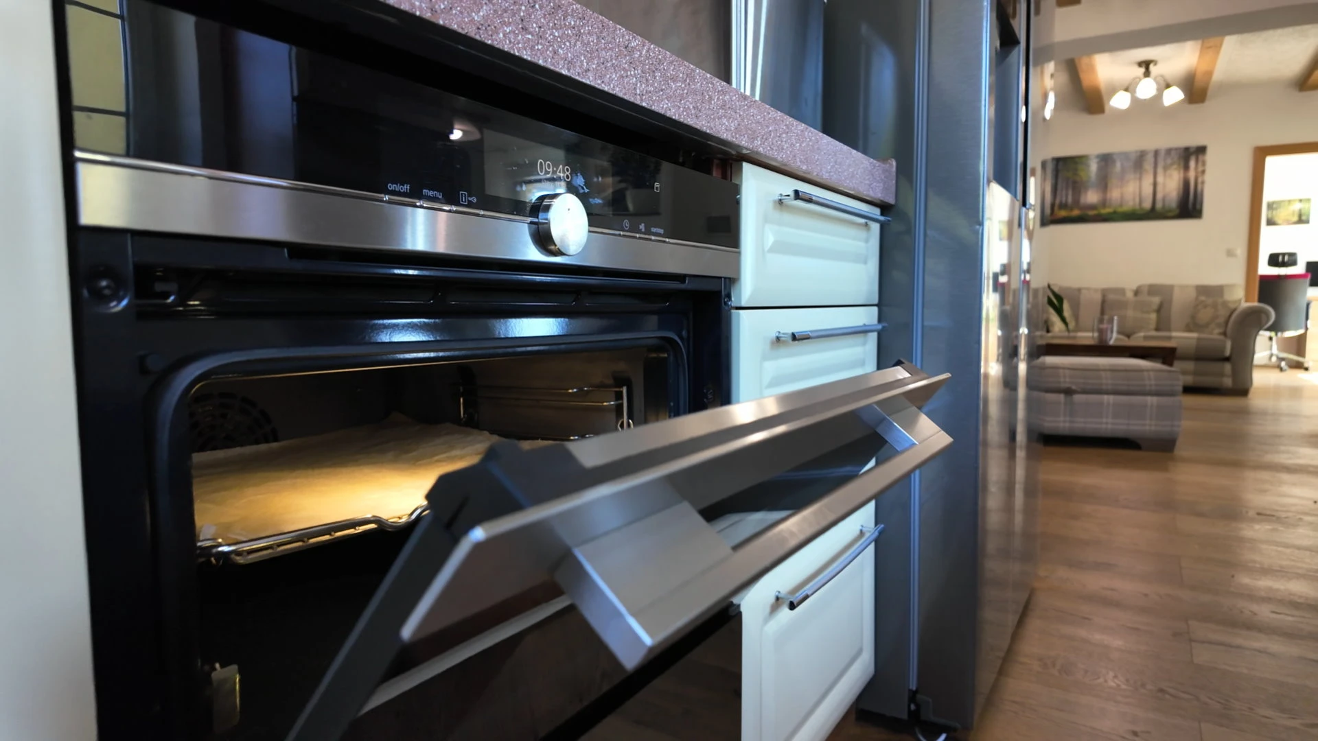- Přízemní kuchyně: indukční varná deska, trouba, americká lednice s mrazákem, výrobník ledu a podavač vody, myčka, mikrovlnná trouba, toustovač, kávovar, vinotéka, rychlovarná konvice, digestoř