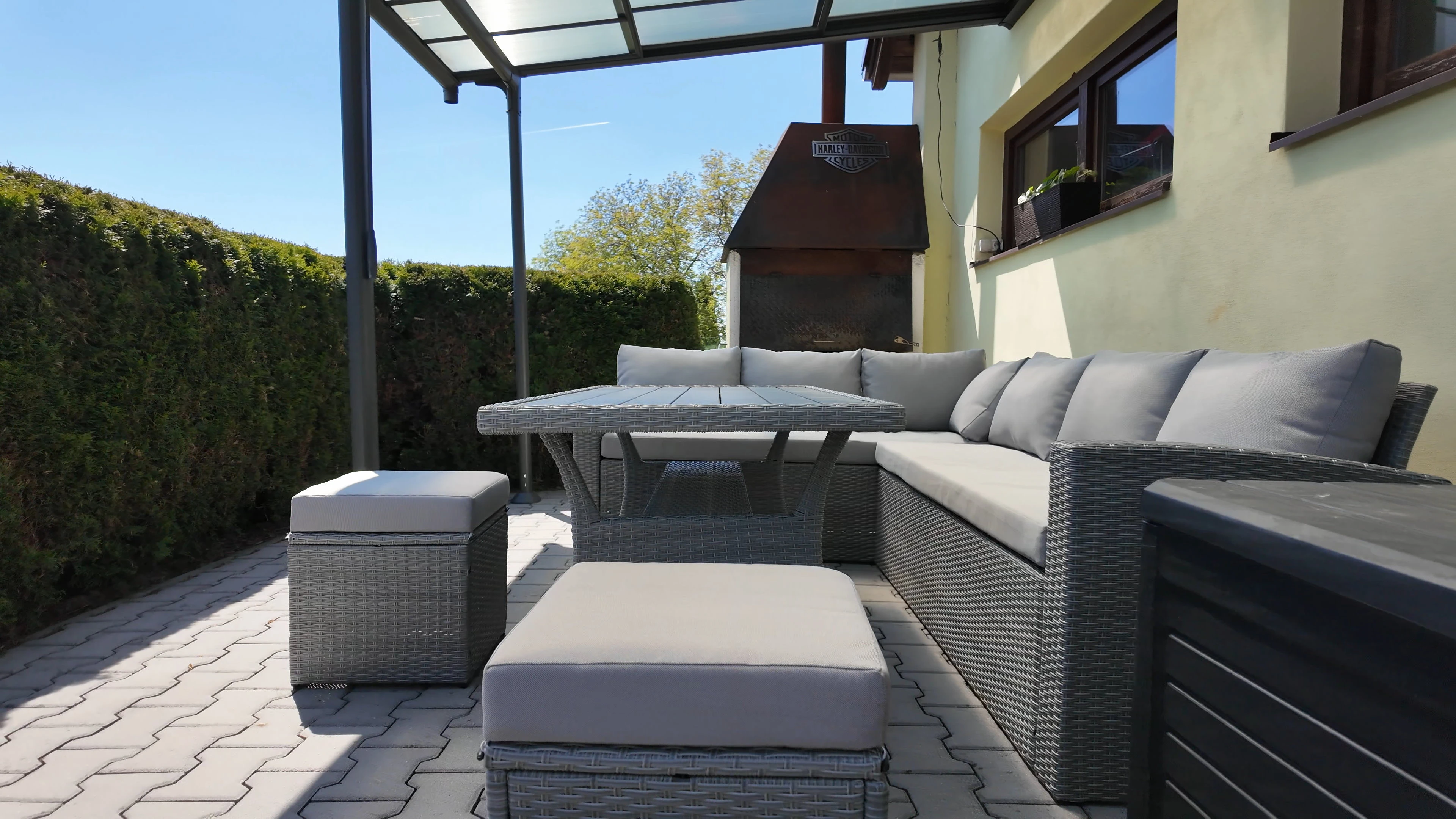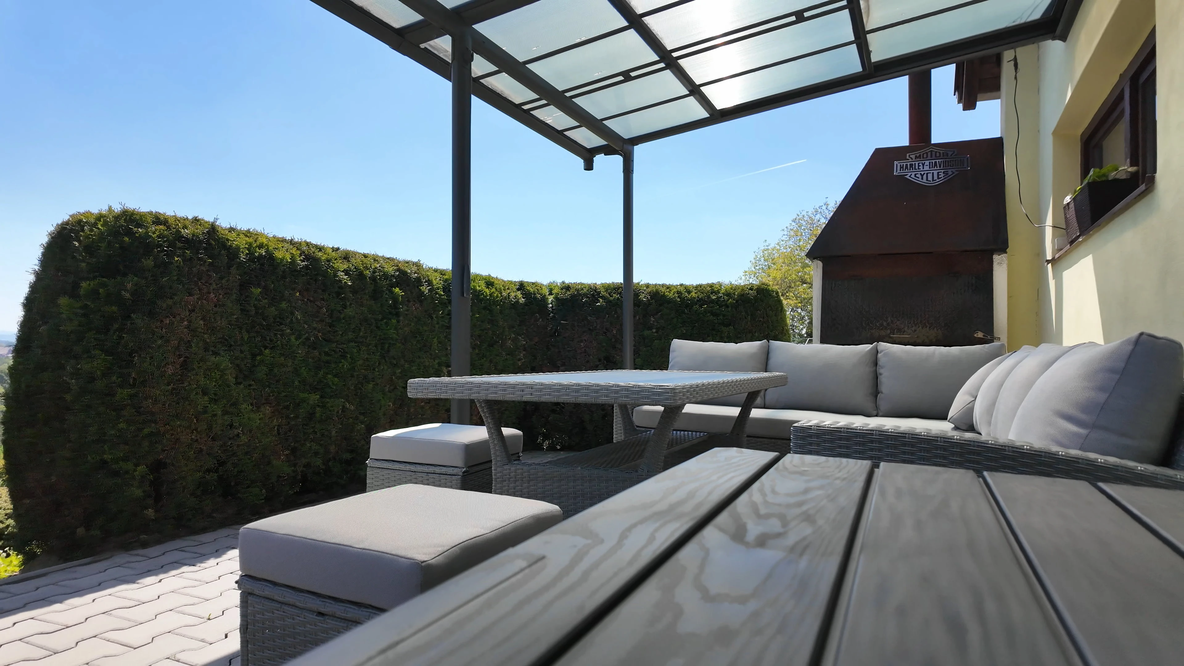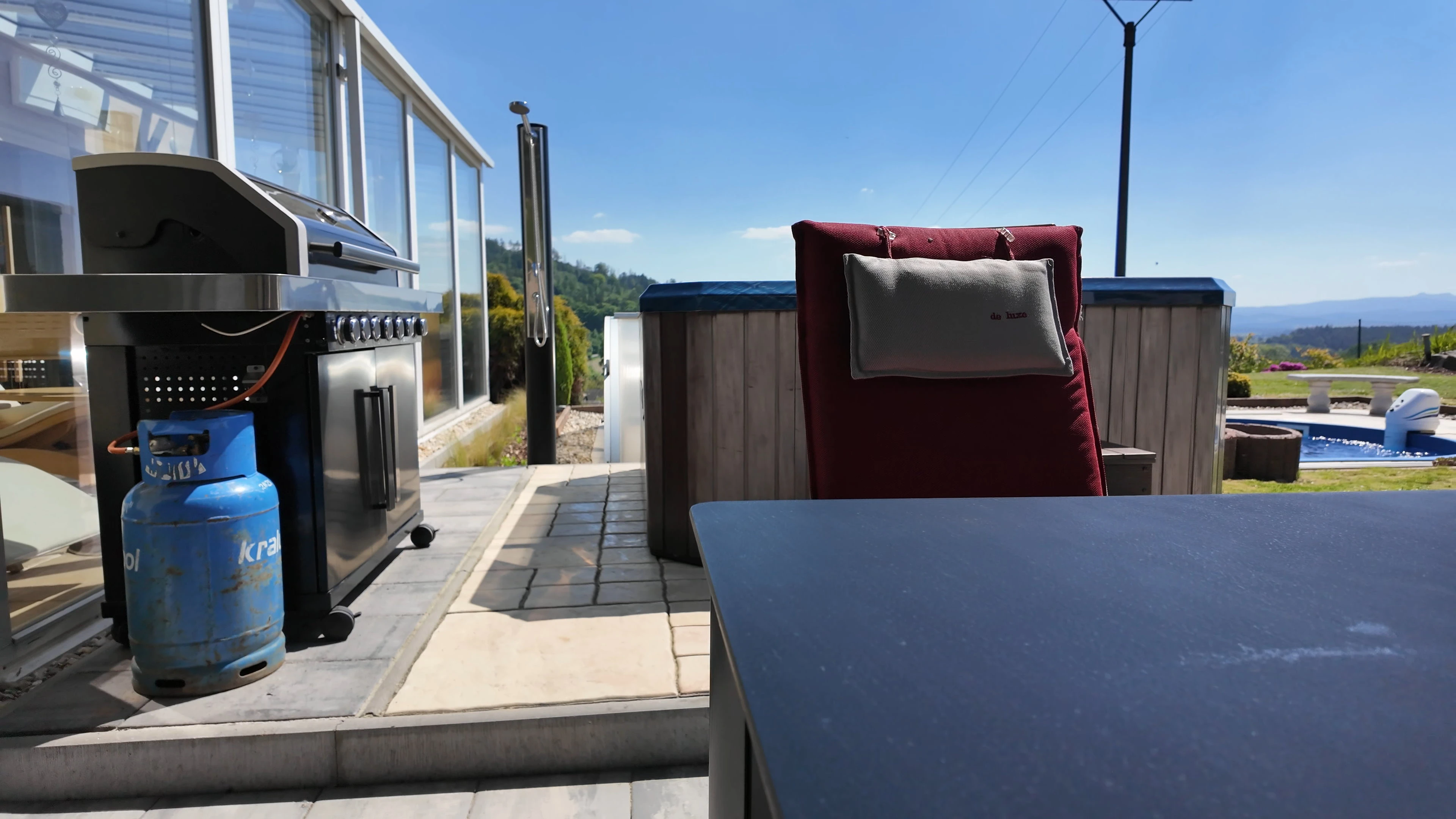 - Spodní terasa: hliníková pergola se stahovací střechou, jídelní stůl pro 6 osob, ratanové sezení pro 6 osob, kombinovaný gril (uhlí+plyn), lednička, integrovaná pípa na pivo, vířivka pro 6 osob, venkovní sprcha, ohniště, 4x opalovací lehátko, 2x box pro matrace