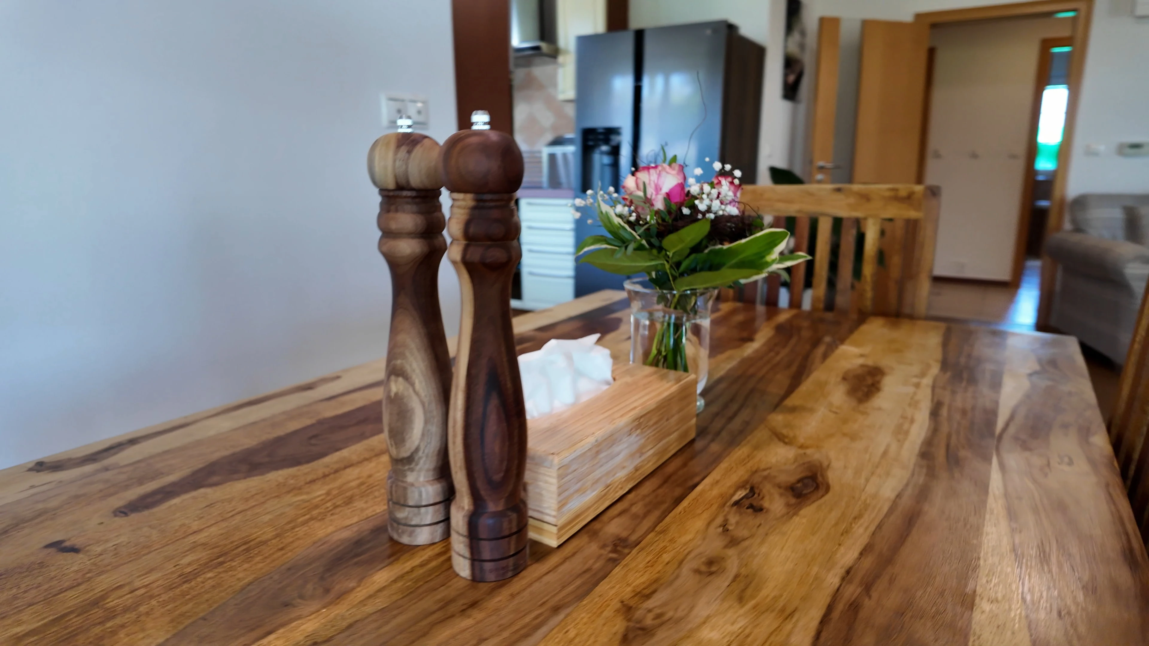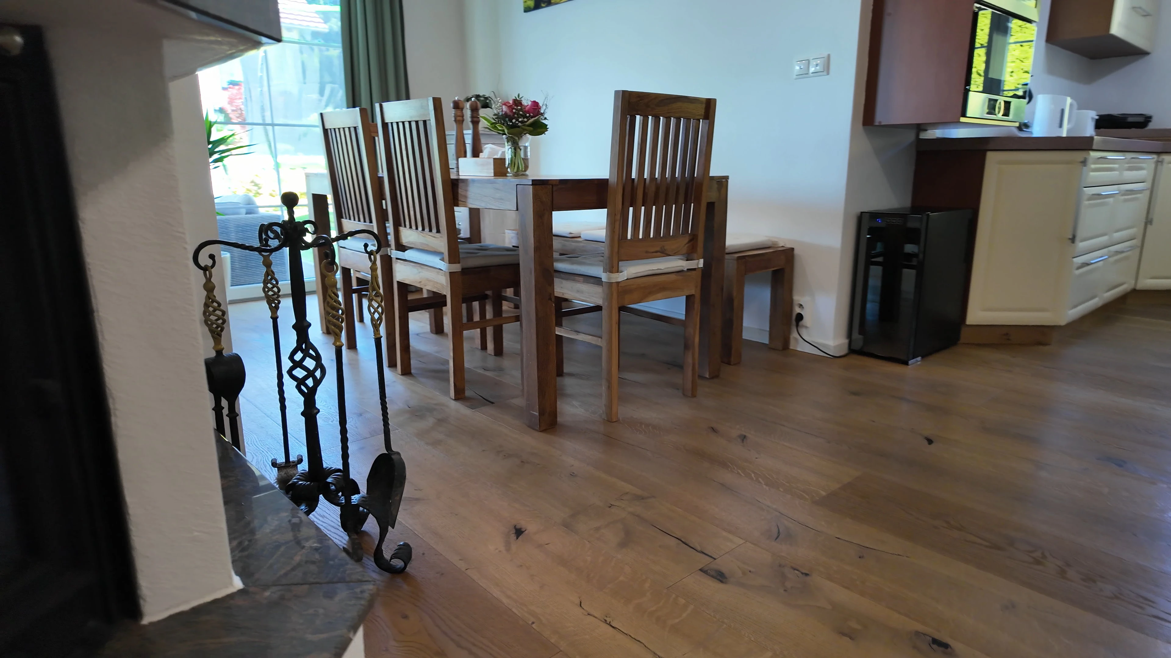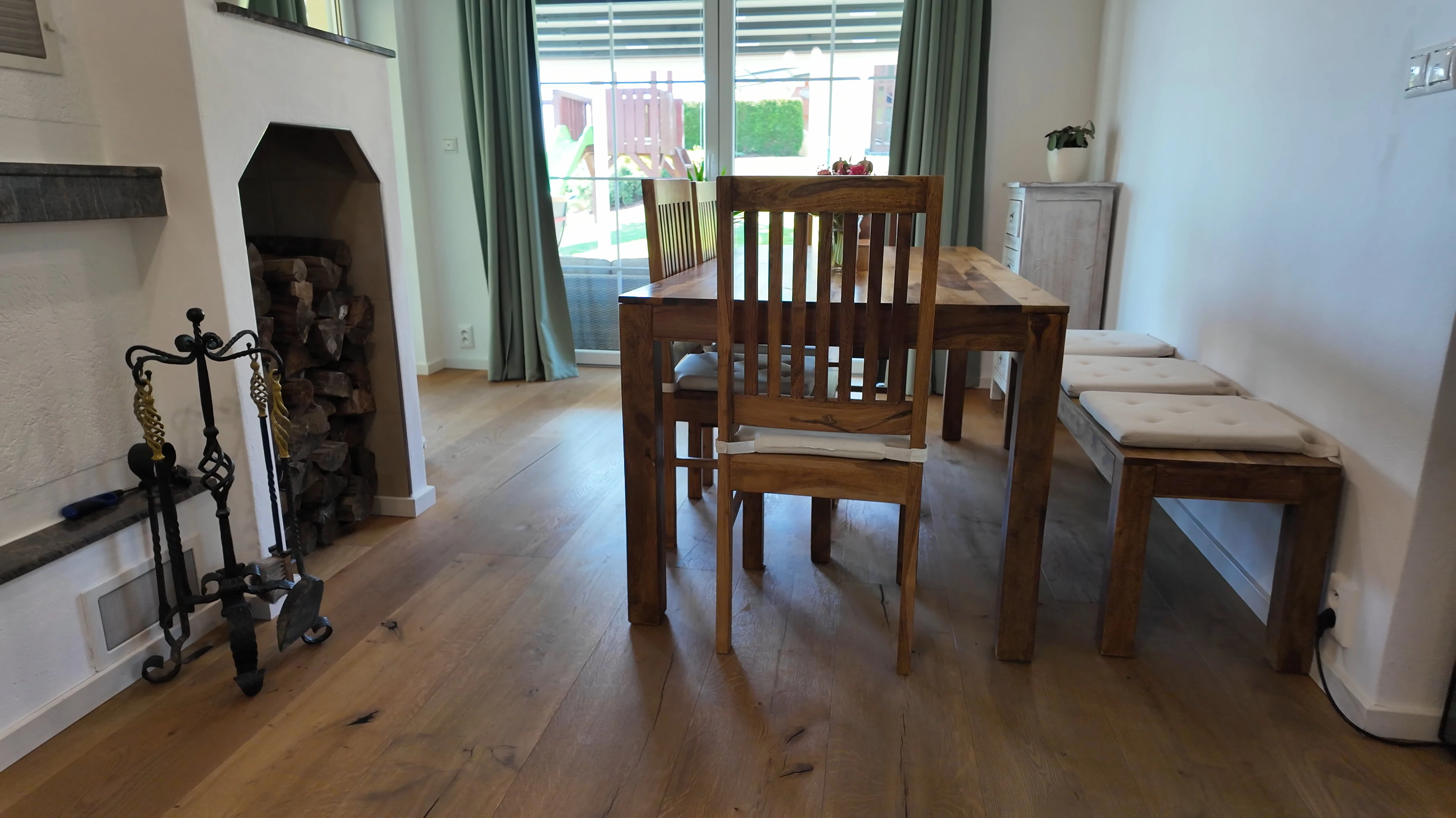 - Jídelna: velký stůl (2,5 m), lavice, židle, dětská židlička, příborník