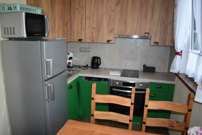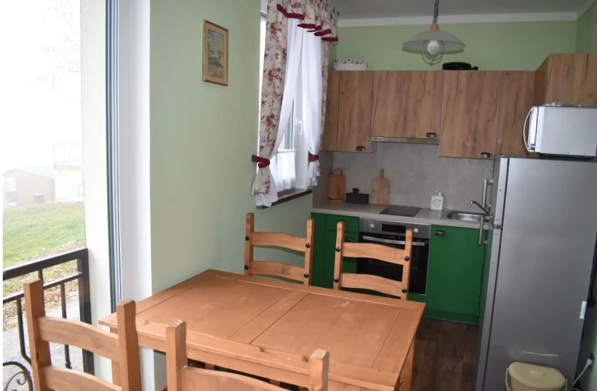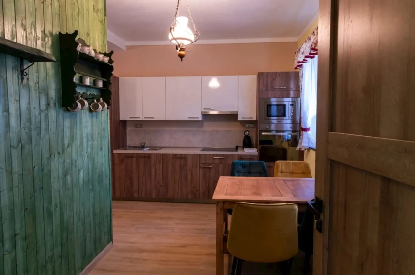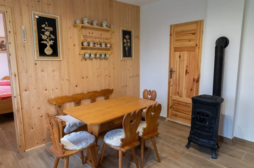 Apartmán Rajnošky má dvě ložnice s manželskými postelemi, krb a plně vybavenou kuchyni.