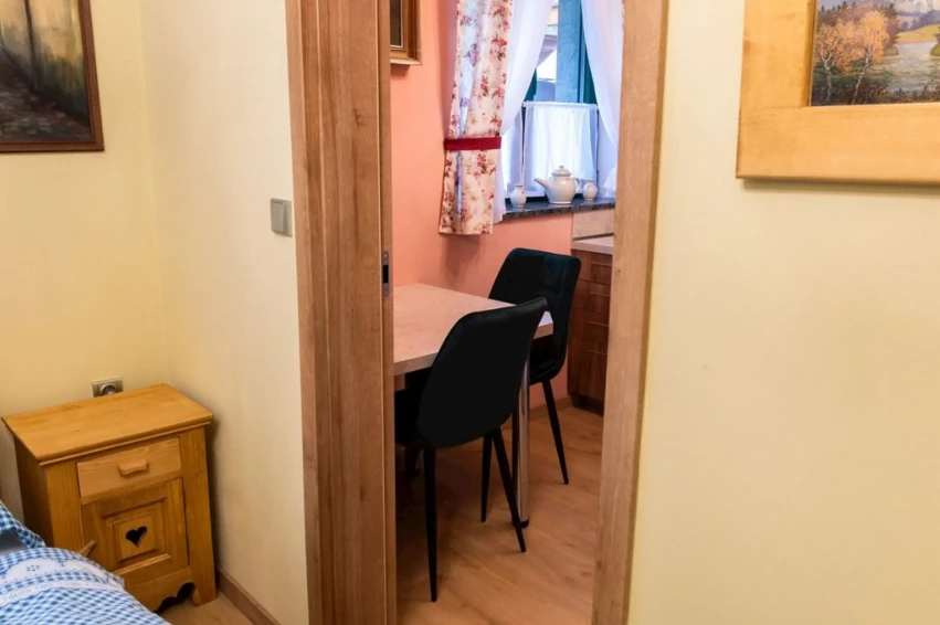 Tento apartmán se nachází v hlavní budově Rekreačního střediska Rajnošky v obci Rajnochovice. Je vhodný pro jednotlivce nebo páry, kteří hledají jednoduché a funkční ubytování. Vybavení apartmánu: Ložnice: Jedna ložnice s manželskou postelí. Kuchyň: Základně vybavená kuchyň pro přípravu vlastních jídel. Koupelna: Koupelna se sprchovým koutem a umyvadlem. Toaleta: Samostatná toaleta. Kapacita: Celková kapacita: 2 osoby. Minimální délka pobytu: 2 noci. Cena: Cena za noc: 1 800 Kč. Cena zahrnuje: Ložní prádlo a parkování. Poplatky na místě: Vratná kauce 2 000 Kč/pobyt. Další informace: Wi-Fi: Dostupné v celém objektu. Parkování: Zajištěno přímo u objektu. Okolí: Blízkost turistických a cyklistických tras v Hostýnských vrších.