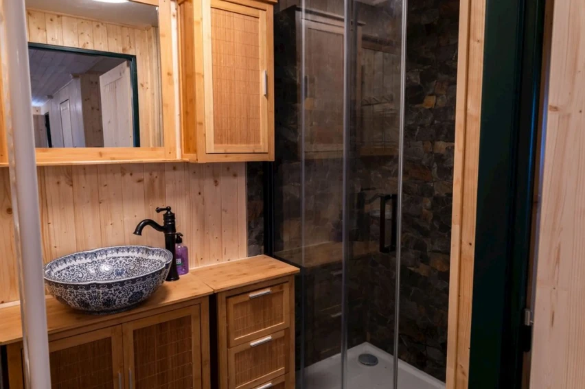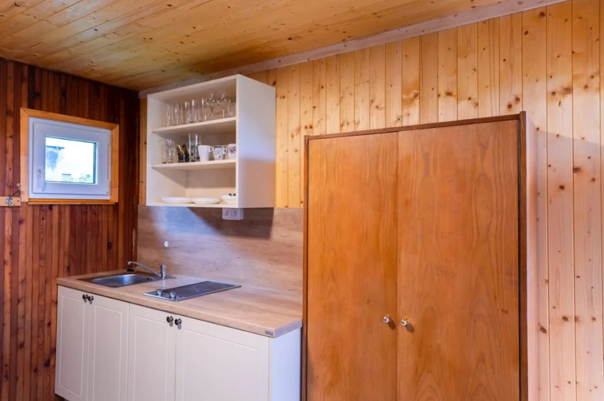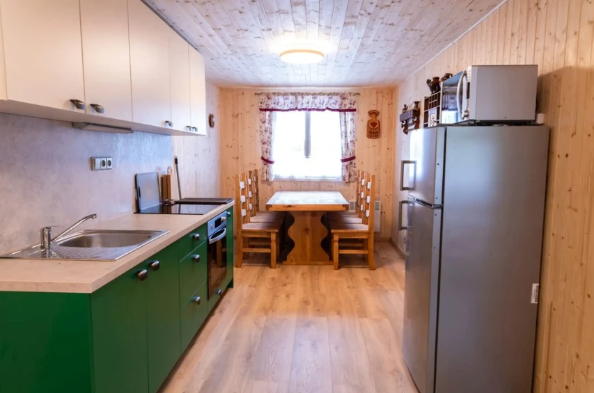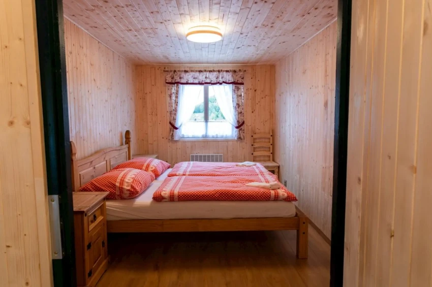 Samostatně stojící dřevěný apartmán Paseky je vybaven manželskou postelí a palandou, kuchyňkou a vlastním sociálním zařízením.