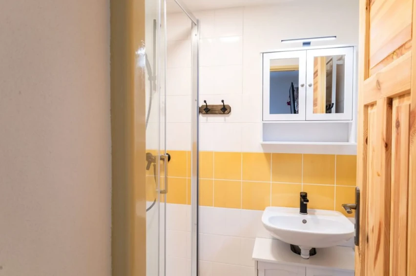 Koupelna: Koupelna se sprchovým koutem a umyvadlem.