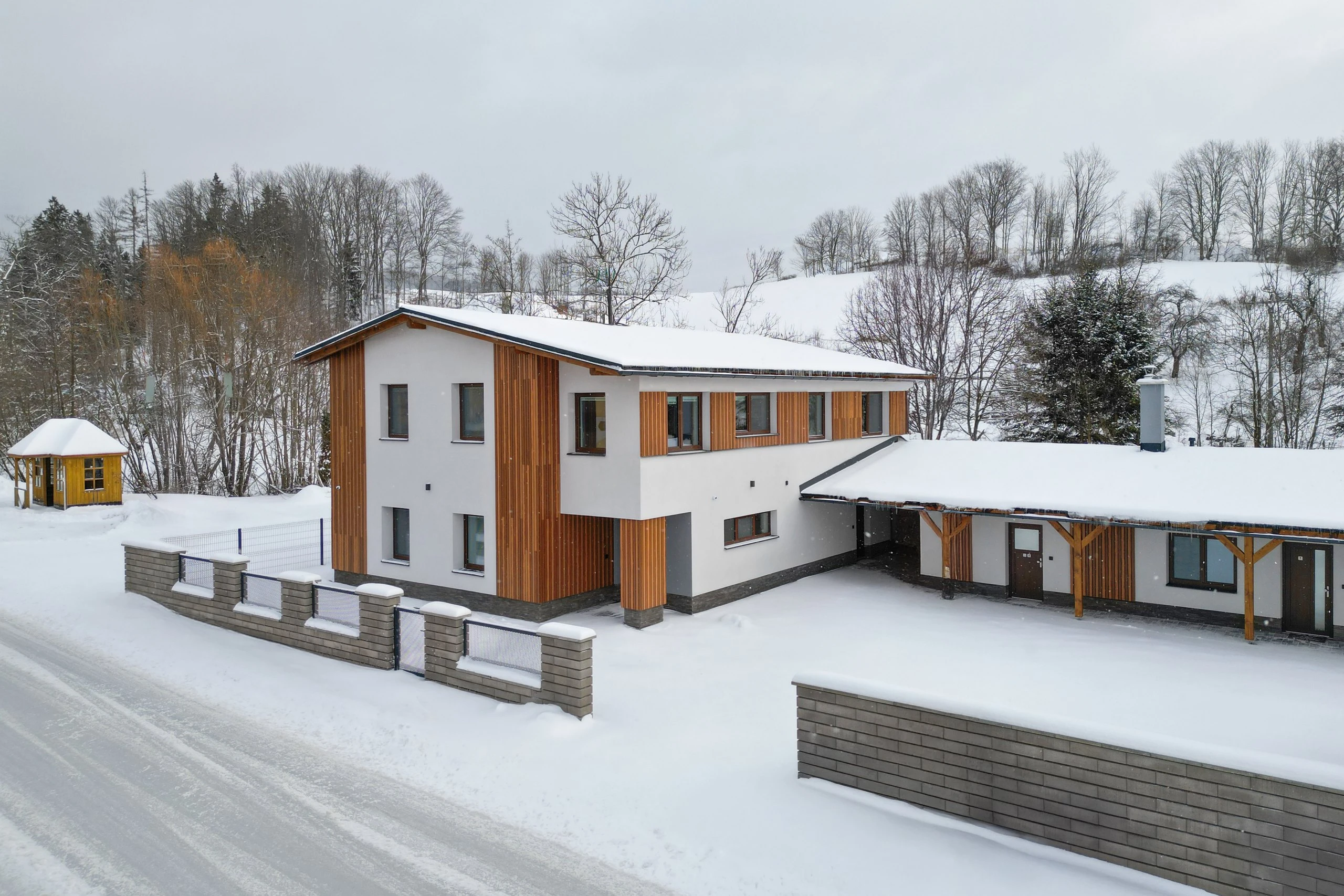 Všechny apartmány jsou vybaveny moderně a prakticky, s důrazem na pohodlí při delším pobytu. Nechybí základní spotřebiče, nádobí, úložné prostory, ani přístup k Wi-Fi a televizním programům. Hosté mohou využít i společné prostory v objektu – kuchyň s jídelní částí, společenskou místnost s krbem, televizí, šipkami, stolním fotbálkem a vinotékou, stejně jako saunu a relaxační zónu.