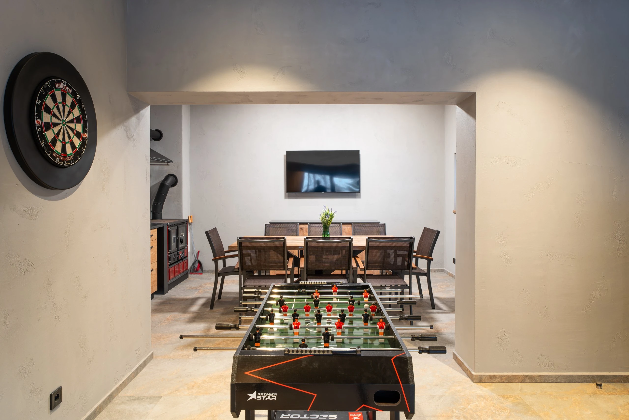 Televize, šipky, stolní fotbal, vinotéka