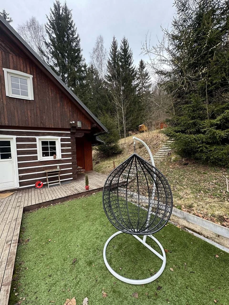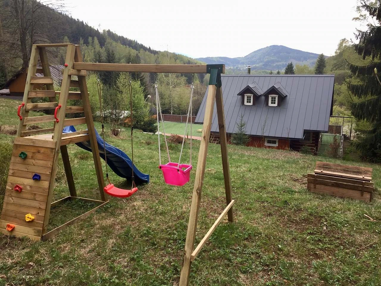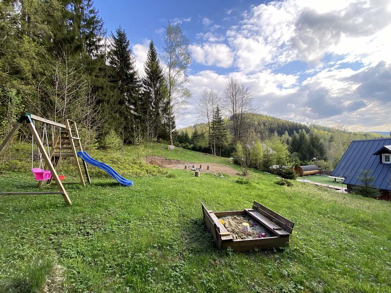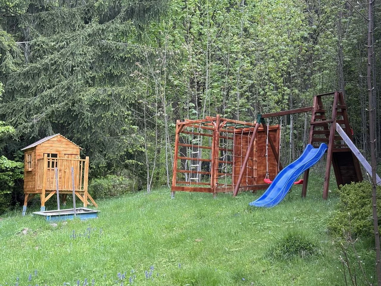 Venkovní prostory: venkovní sauna, posezení s grilem a ohniště, dětské hřiště, pískoviště, malý nafukovací bazén, oplocený pozemek s vlastním lesem.