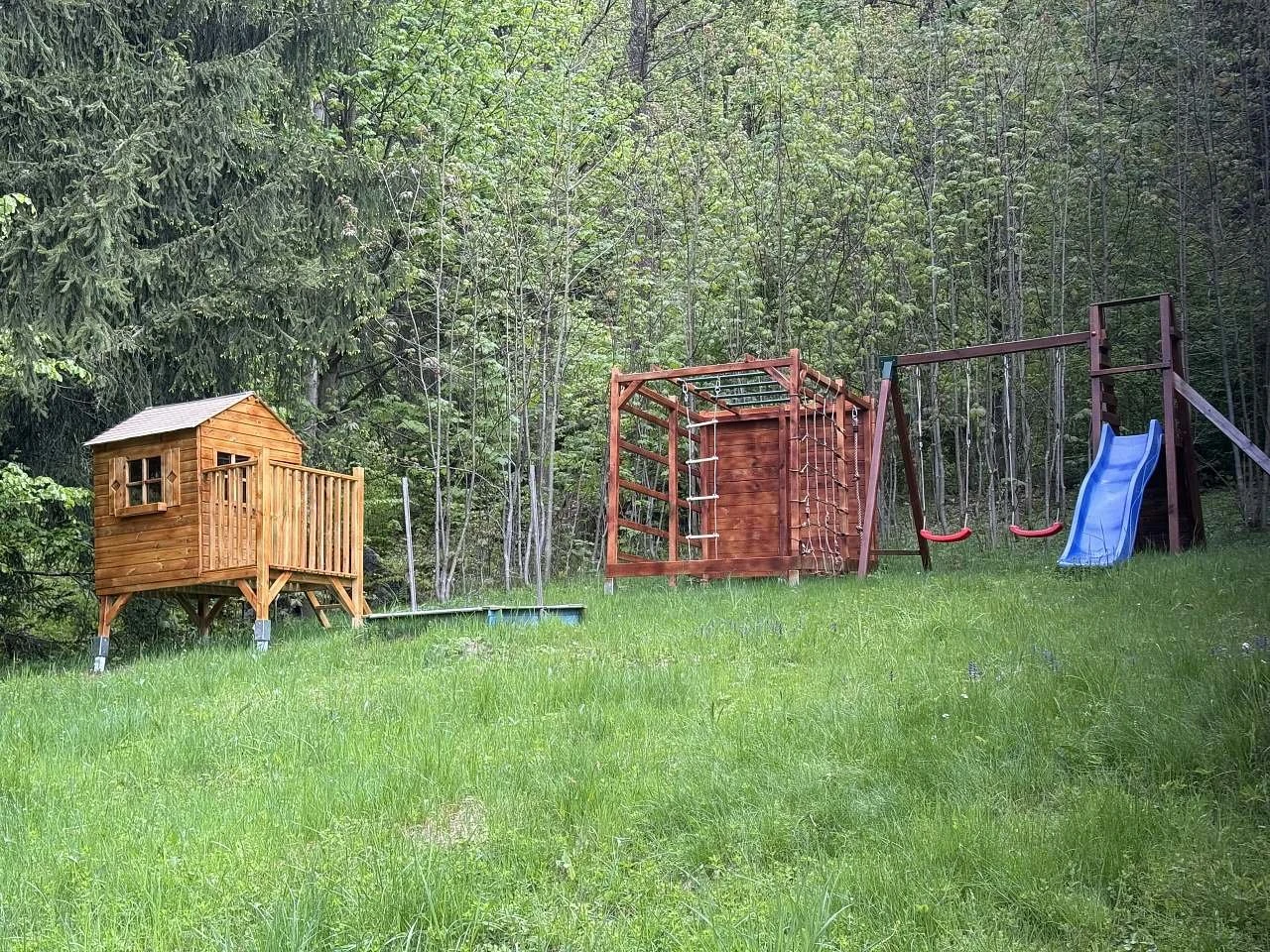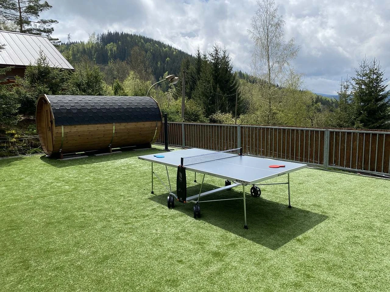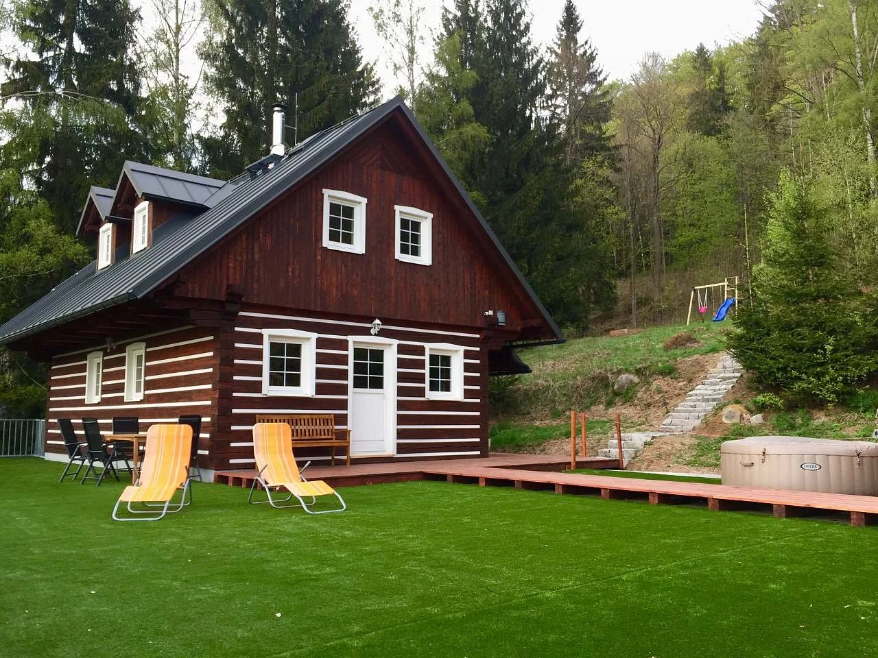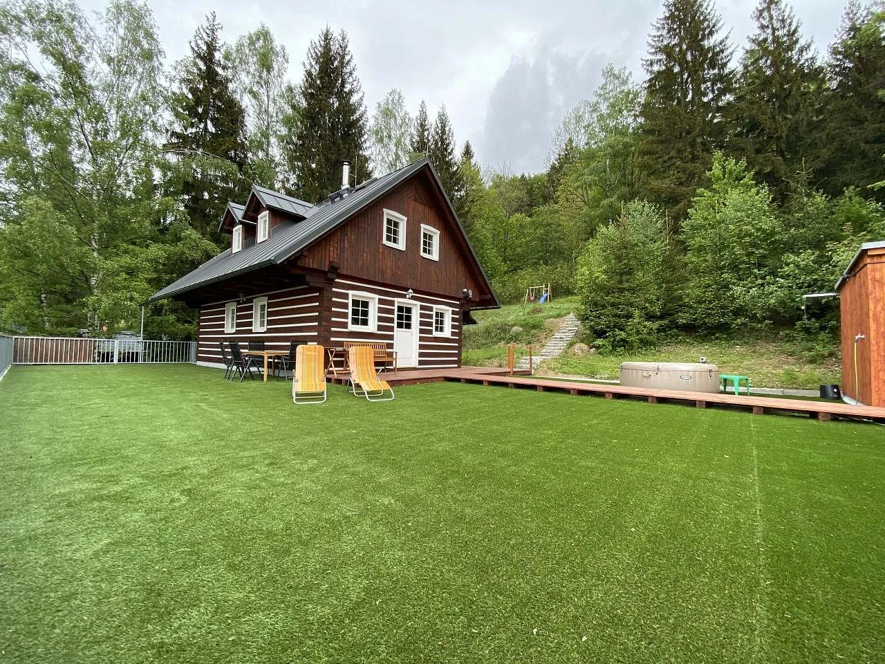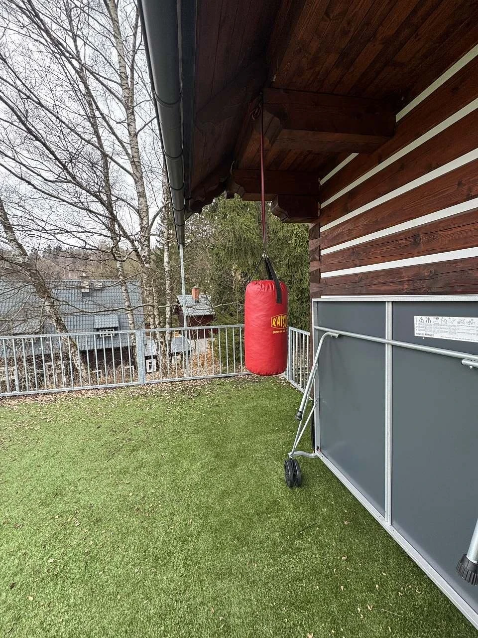 Venkovní prostory: venkovní sauna, posezení s grilem a ohniště, dětské hřiště, pískoviště, malý nafukovací bazén, oplocený pozemek s vlastním lesem.