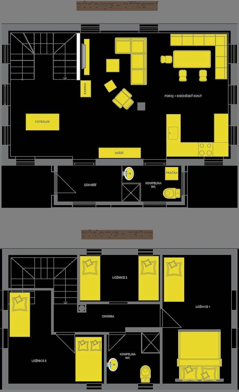 V přízemí je obývací pokoj s rozkládacím gaučem, TV, krbovými kamny, stolním fotbálkem a společenskými/dětskými hrami. Kuchyň je plně vybavená s jídelním koutem, koupelnou se sprchovým koutem, WC a pračkou.
