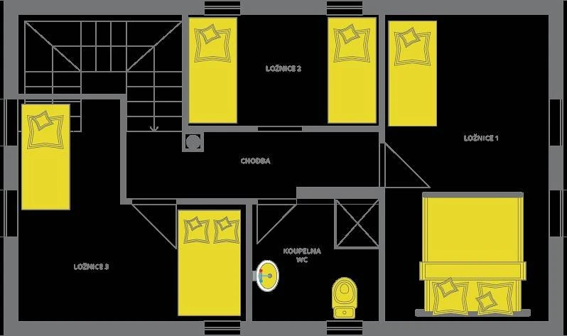 - Ložnice 3: dvoulůžková postel 160x200, jednolůžko 90x200 a rozkládací pohovka