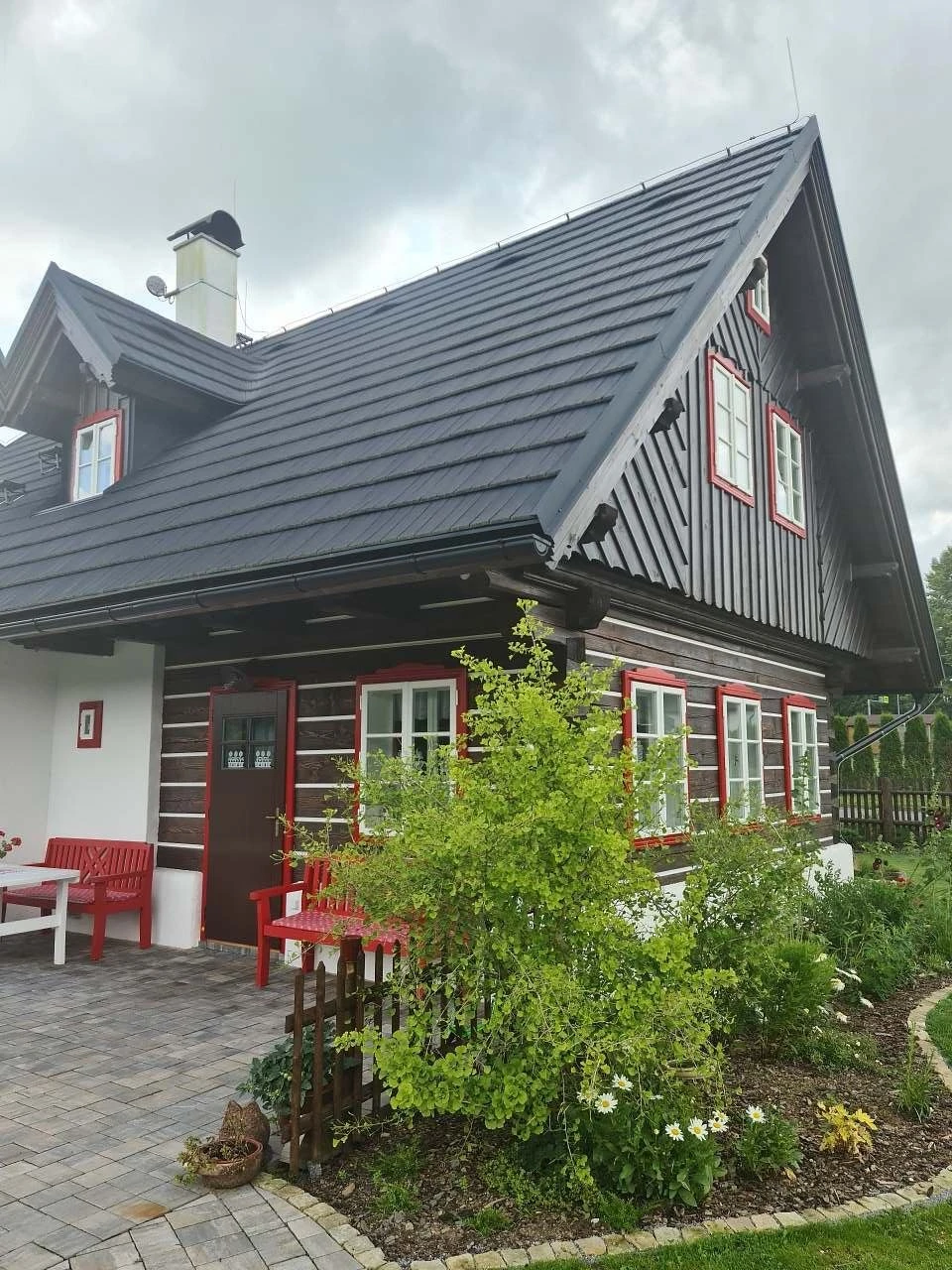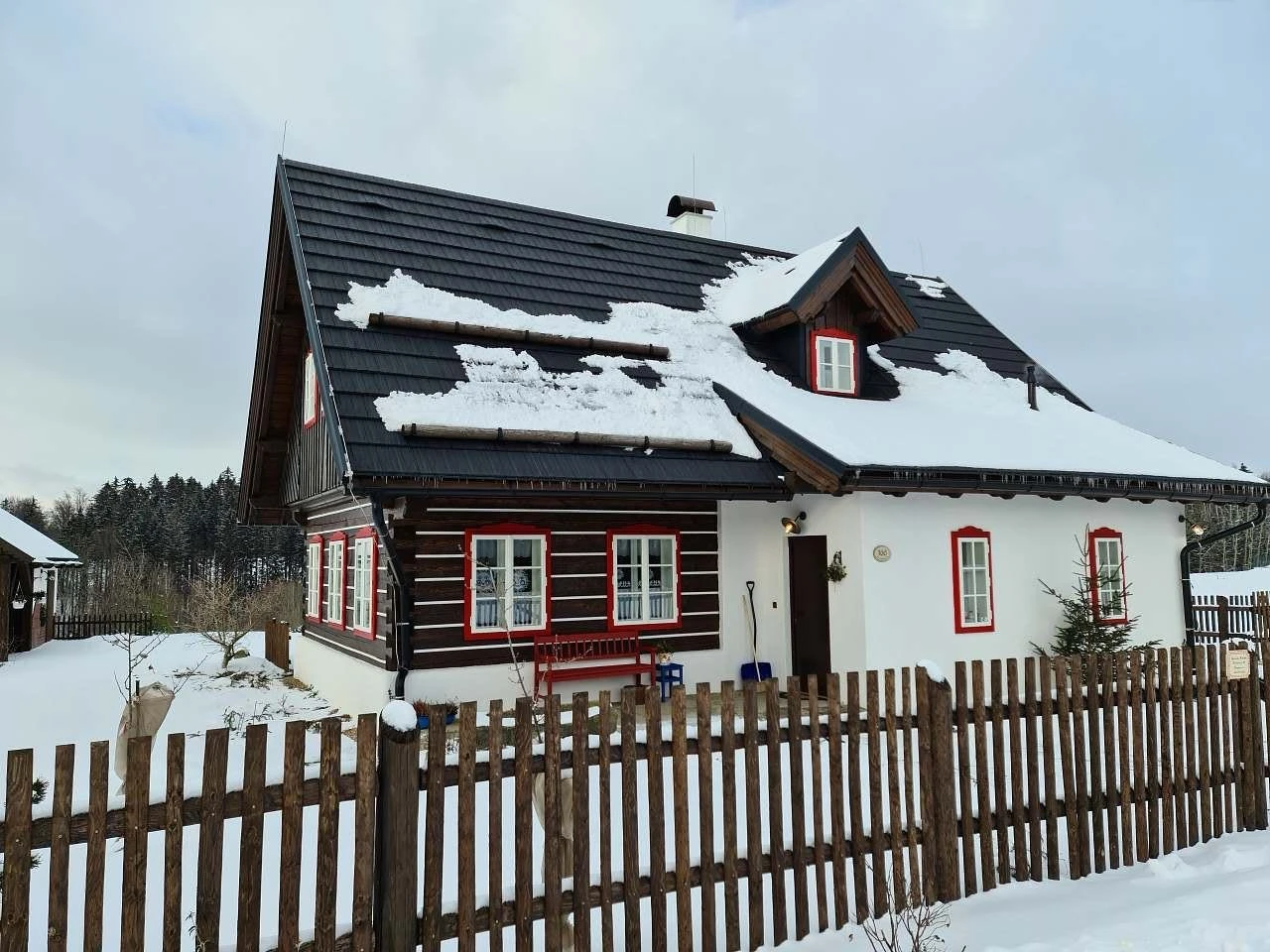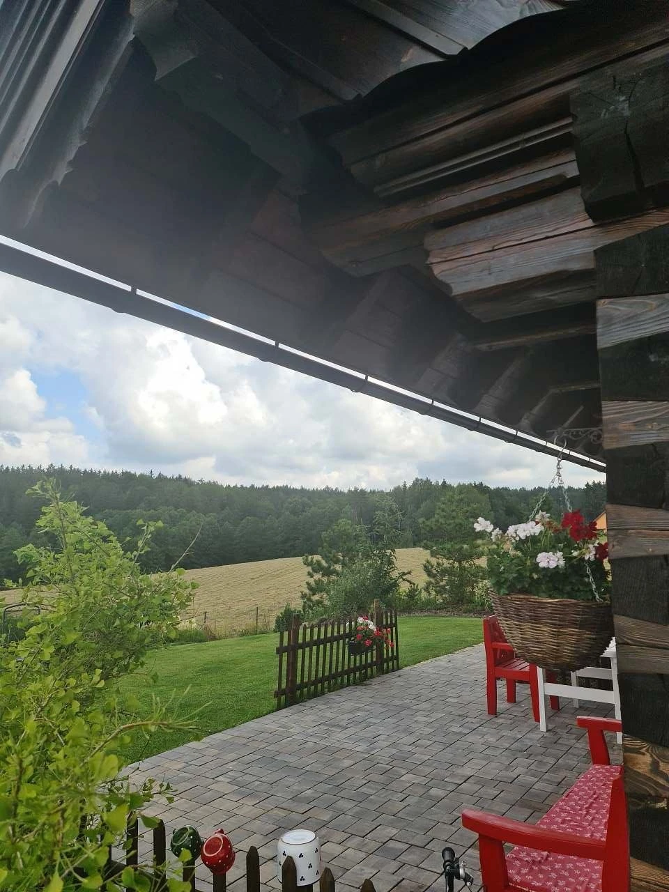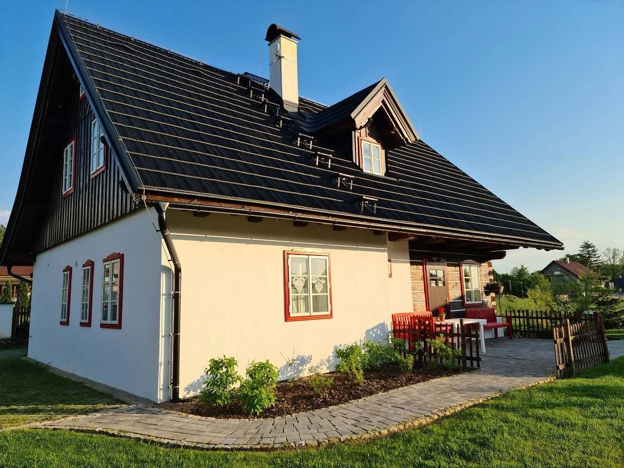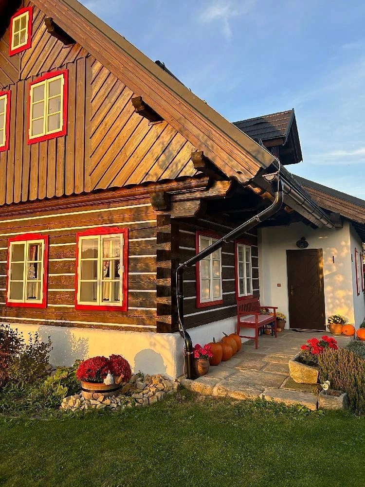 Vytápění je řešeno plynovým podlahovým topením, současně je možné topit dřevem v plně funkční kachlové peci. Z kuchyně je přímý vstup na terasu s posezením orientovanou na západ. Součástí venkovních prostor je roubená pergola s plynovým grilem a posezením, dále ohniště. Zahrada je k dispozici hostům, včetně možnosti sklizně aktuálně dozrávající zeleniny a lesních plodů.