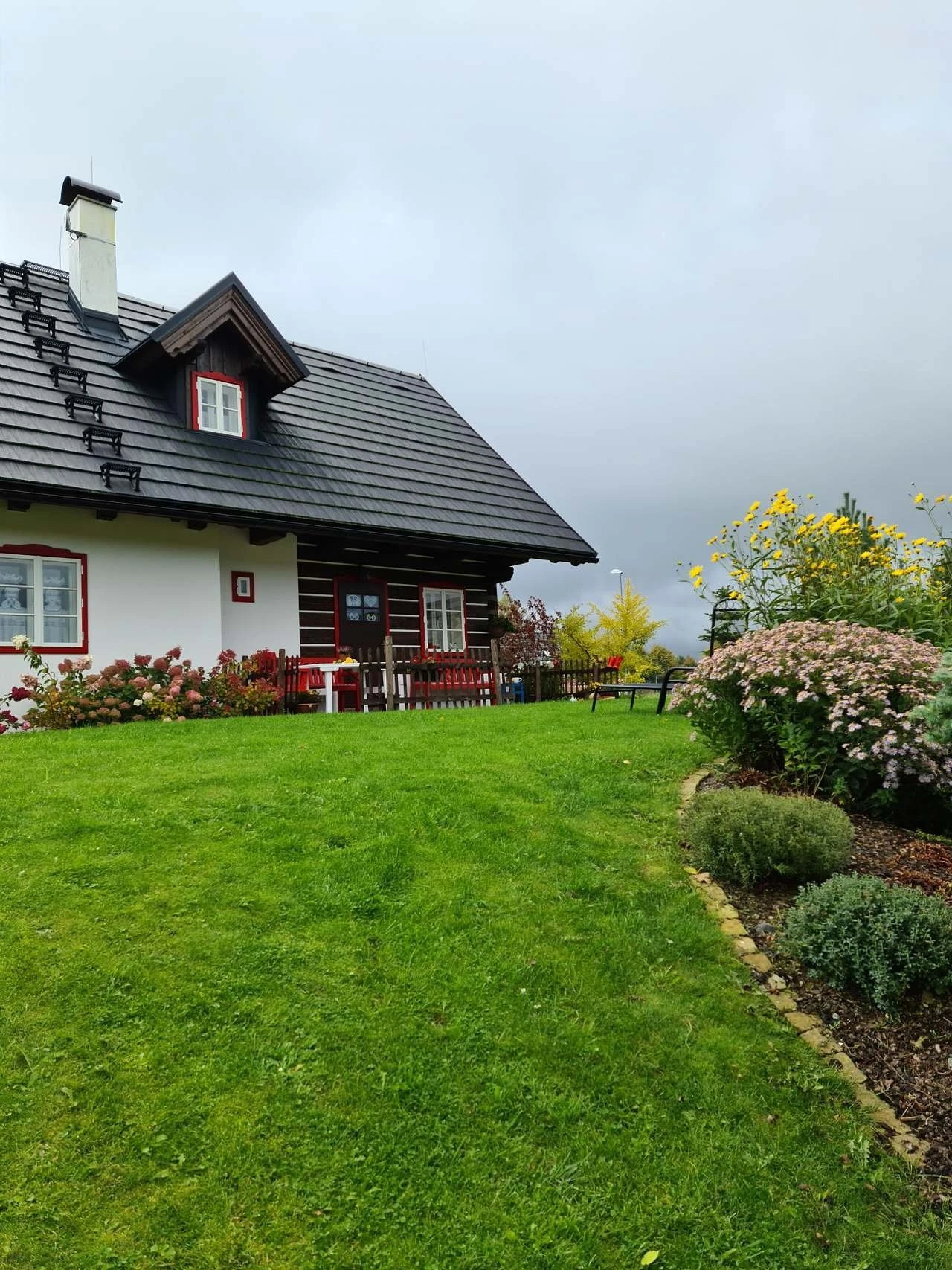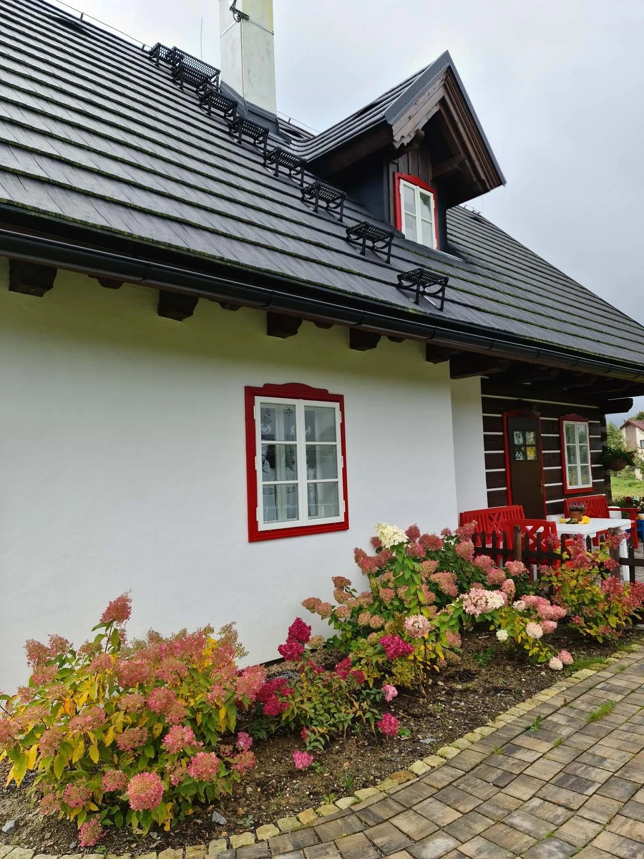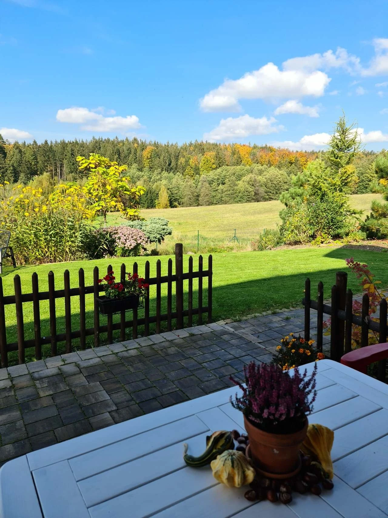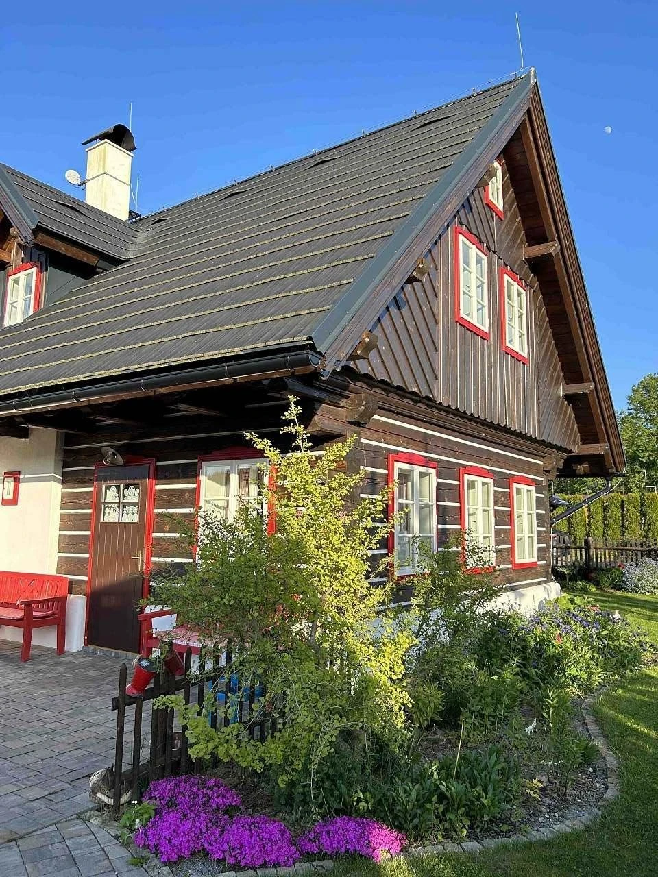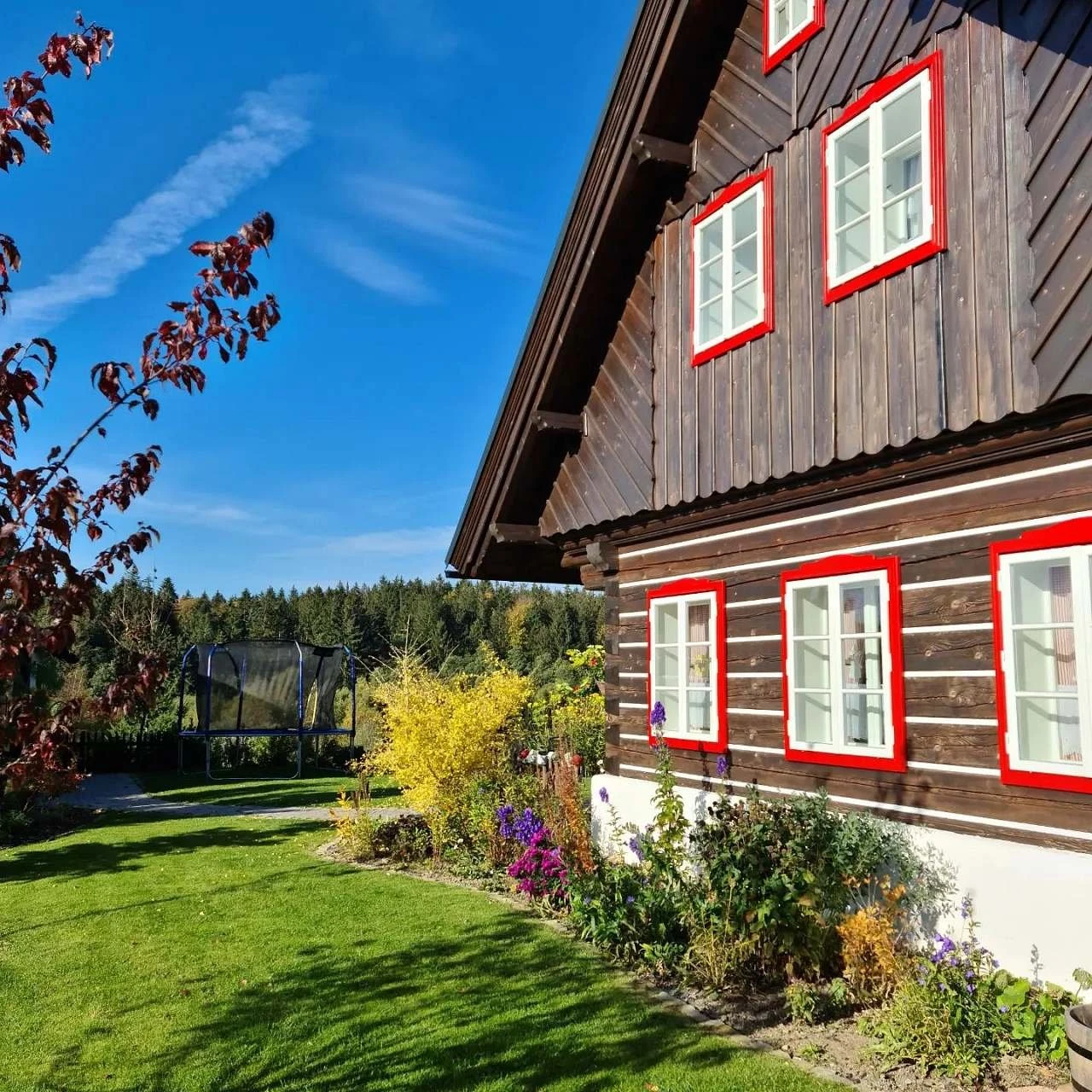 Vytápění je řešeno plynovým podlahovým topením, současně je možné topit dřevem v plně funkční kachlové peci. Z kuchyně je přímý vstup na terasu s posezením orientovanou na západ. Součástí venkovních prostor je roubená pergola s plynovým grilem a posezením, dále ohniště. Zahrada je k dispozici hostům, včetně možnosti sklizně aktuálně dozrávající zeleniny a lesních plodů.