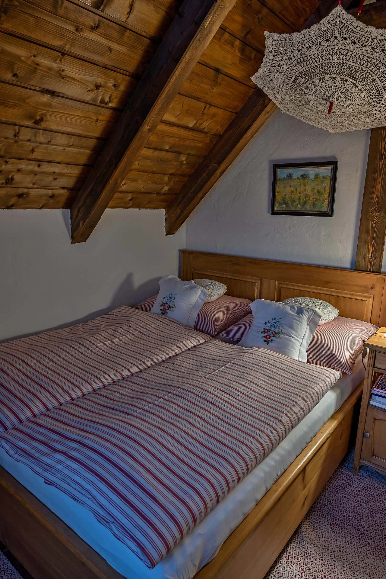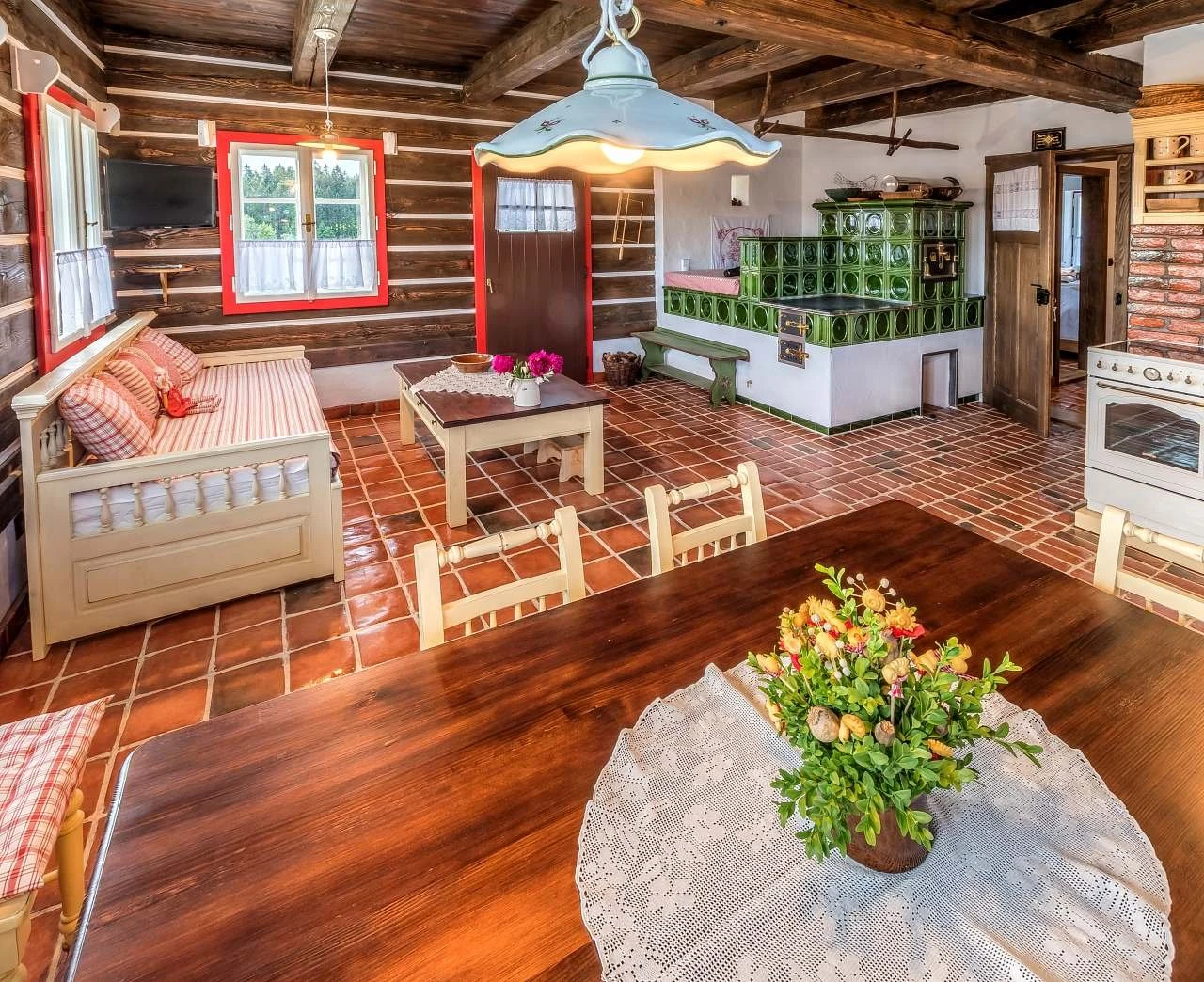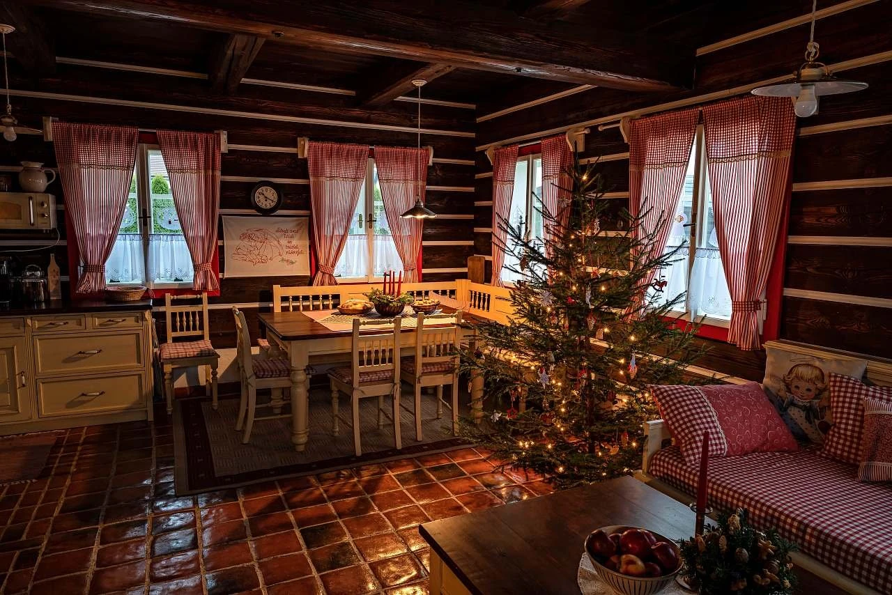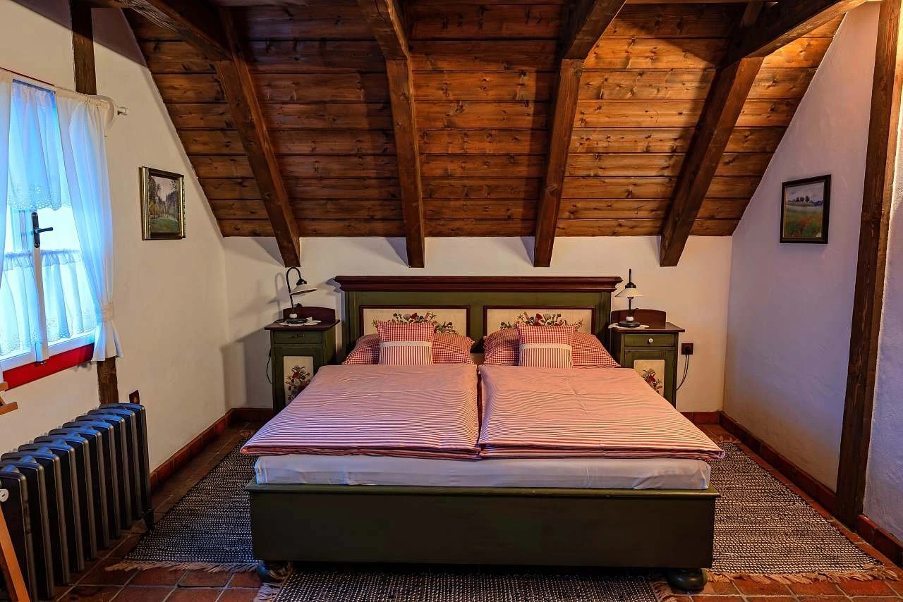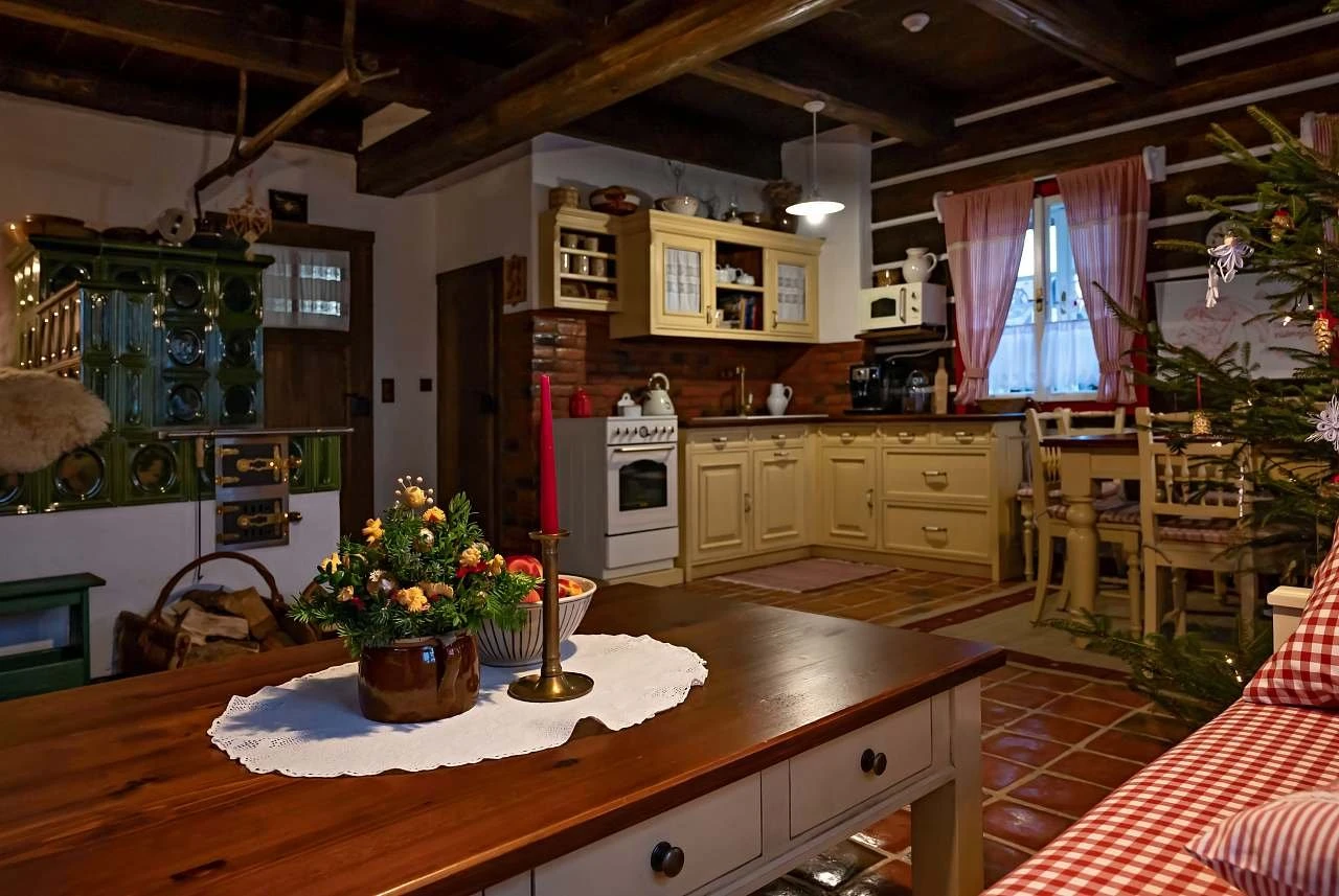 Ubytování nabízí tři samostatné pokoje a velkou obytnou kuchyň s kachlovou pecí, na které je možné i spát. Součástí kuchyně je sofa s výsuvným lůžkem (přistýlka). První pokoj je dvoulůžkový, nachází se v přízemí a je orientován na východ. Druhý pokoj je dvoulůžkový, umístěný v patře, rovněž s orientací na východ, a je propojen schody s podkrovním prostorem (hambálkem), kde se nachází dvě postele vhodné pro děti. Třetí pokoj je třílůžkový, nachází se v patře, je orientován na západ a je vybaven manželskou postelí, jednolůžkem s možností rozložení na přistýlku a malovanou skříní. Povlečení je z českého kanafasu. V interiéru jsou použity ručně malované prvky s motivem vlčích máků.