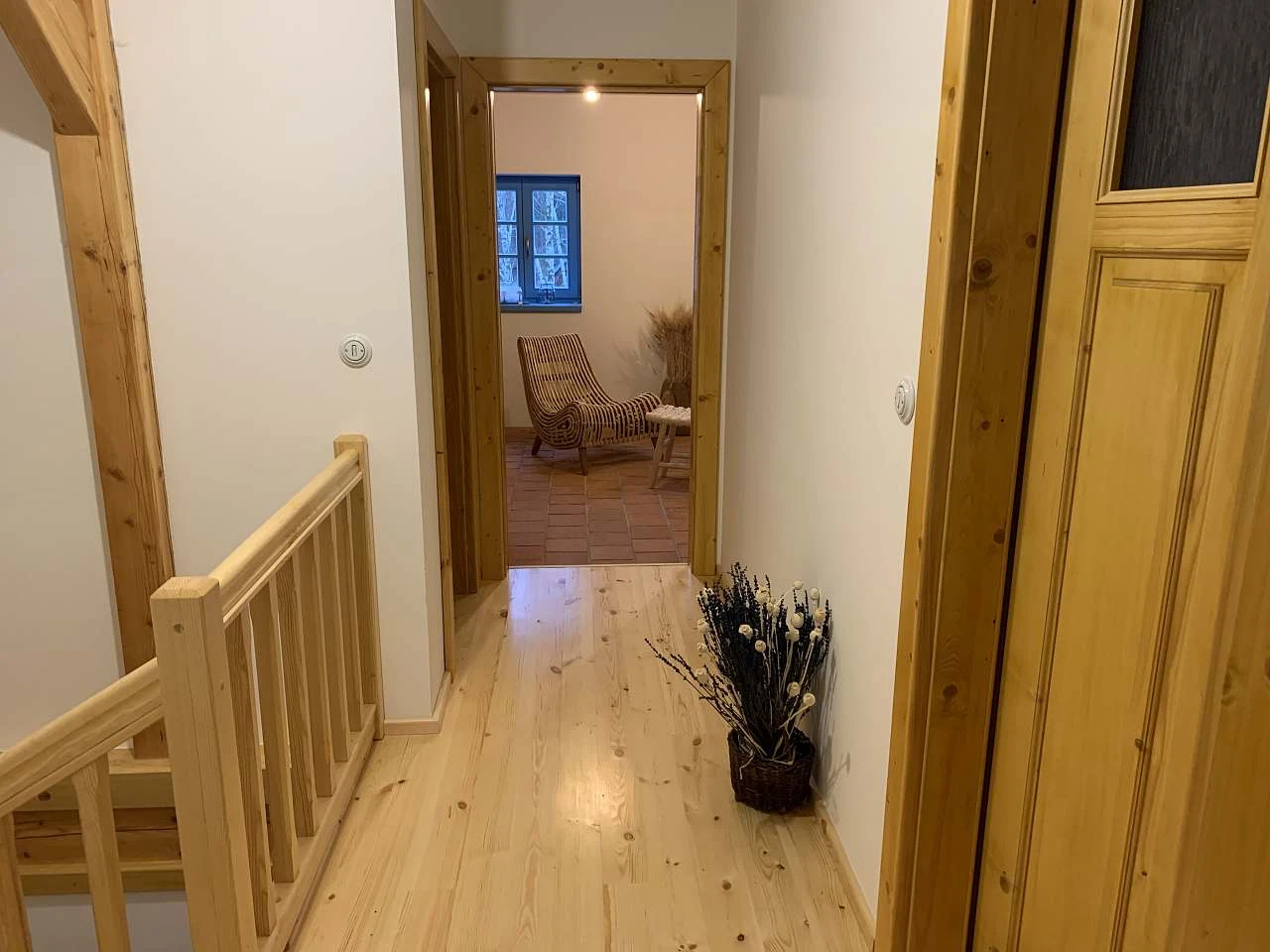 Otevřené dřevěné schodiště vede do prvního patra, kde je WC, dvě ložnice (jedna s manželskou postelí a komodou, druhá se třemi samostatnými postelemi a policovou skříní) a wellness zóna. Wellness prostor obsahuje dřevěnou vanu (220 cm) s perličkovou masáží pro dva osoby, finskou saunu pro 4 osoby, sprchu a relaxační zónu. V ložnicích a na chodbě je dřevěná podlaha s keramickými elektrickými topnými panely, ve wellness a WC je podlahové vytápění s cihlovou dlažbou.