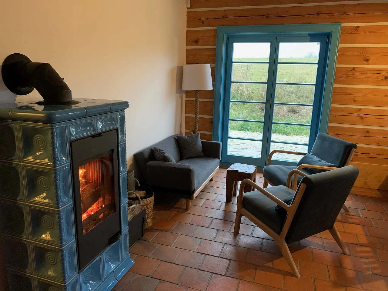 Vstupní chodba je vybavena botníkem, věšákem a skříní. V přízemí se nachází samostatné WC s umyvadlem a koupelna se sprchovým koutem, pračkou a sušičkou. Jedna ložnice s manželskou postelí ze dřevěných trámů, akátovými nočními stolky, skříní a křeslem je rovněž v přízemí. Hlavní místnost zahrnuje kachlová kamna, velký dřevěný stůl s lavicemi a židlemi, křesla, gauč, houpací křeslo, televizi a plně vybavenou kuchyňskou linku s kávovarem. Celé přízemí má podlahu z cihlových půdovek s podlahovým vytápěním.