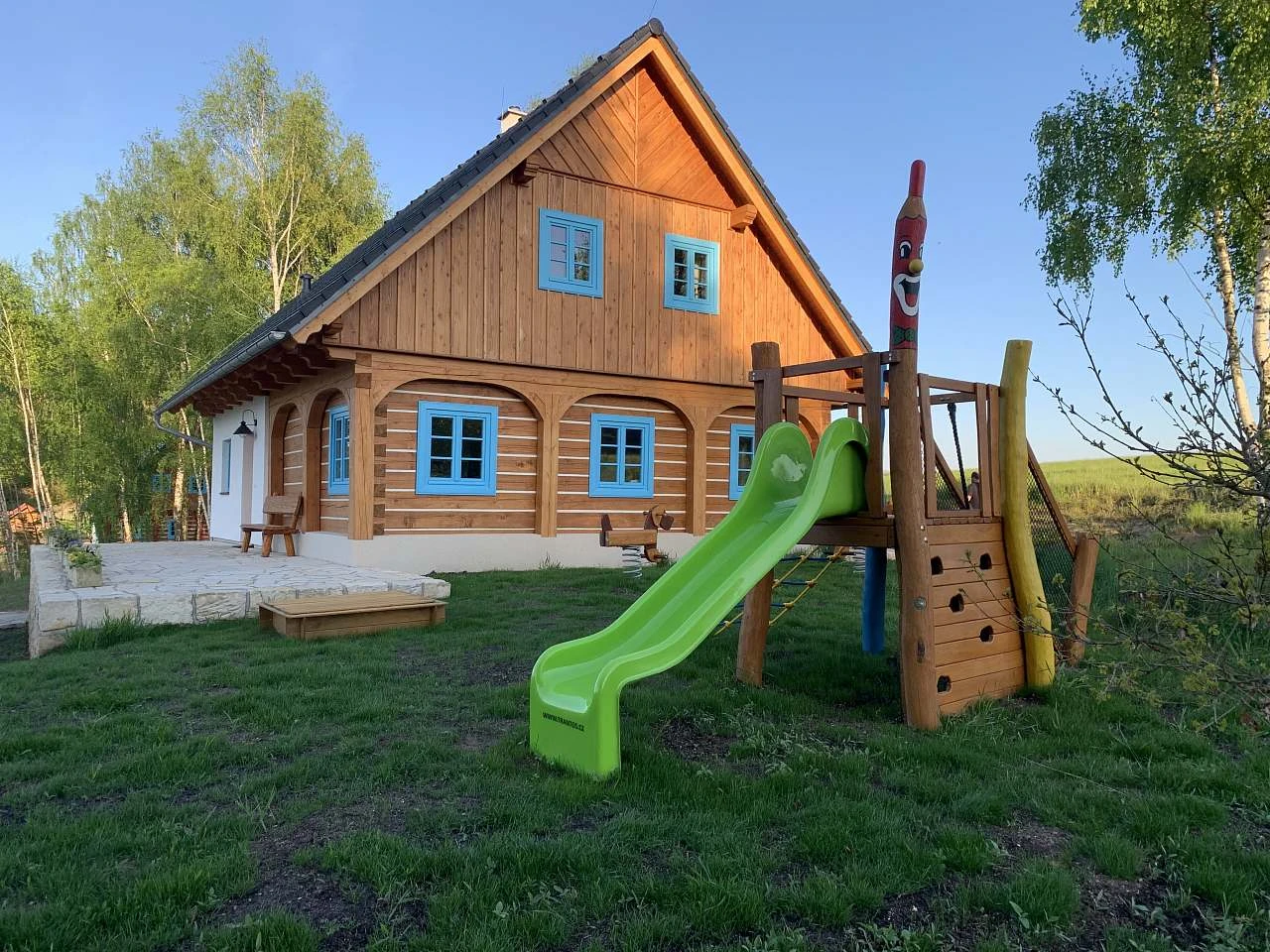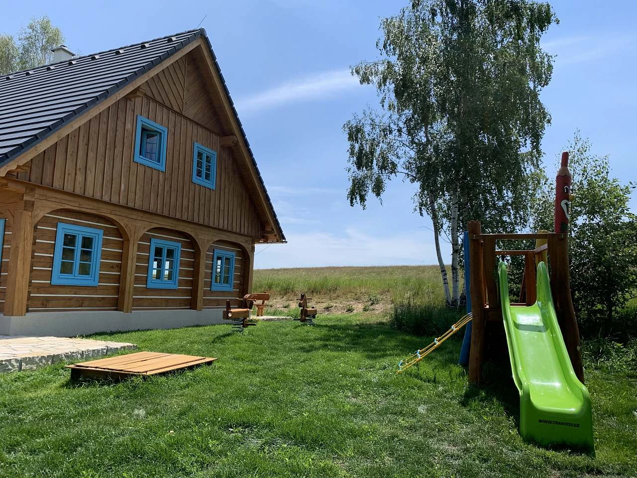 V obytné části je dětský herní koutek s kobercem, maňásky, knížkami, kostkami, plyšáky a dalšími hračkami. K dispozici je také jídelní židlička, vanička, WC prkýnko a nočník.