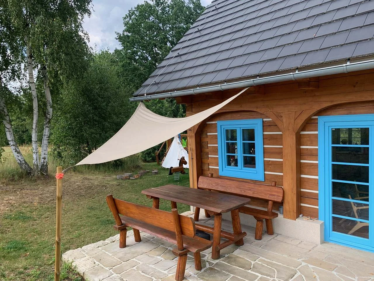 Roubenka má dvě pískovcové terasy - přední (vstupní) a zadní s přístupem z obývací části. Obě terasy jsou vybaveny dřevěnými lavicemi a stoly, je zajištěn stín, k dispozici je slunečník. Na zadní terase je v létě stínící plachta. Hosté mohou využít elektrický venkovní gril a ohniště.