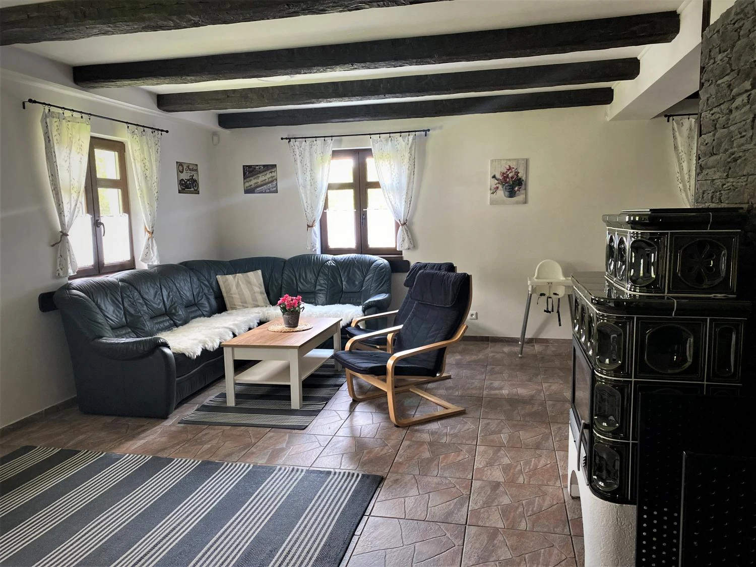 - obývací pokoj (kožená sedačka, TV)