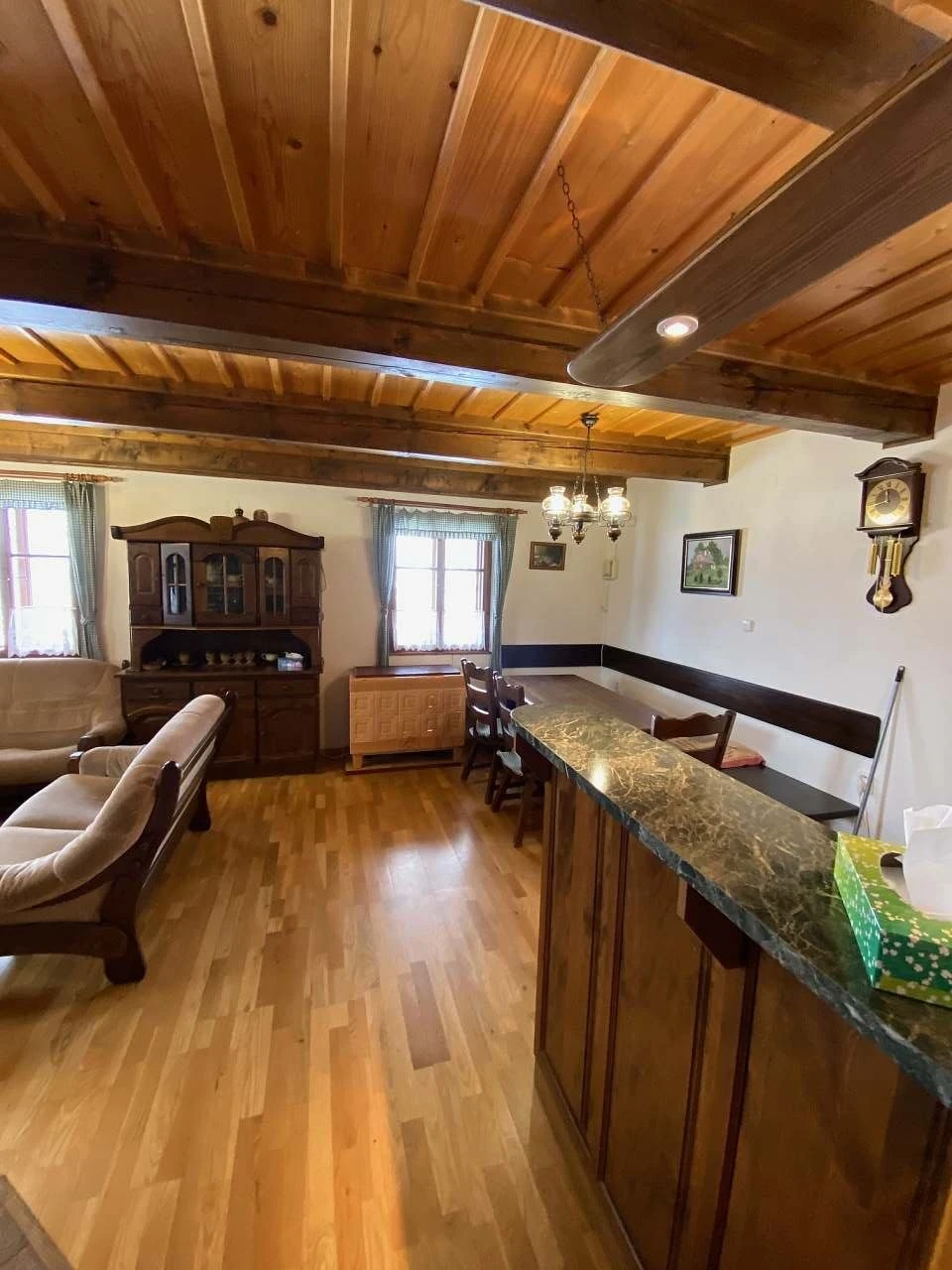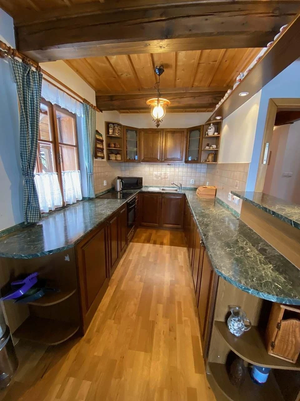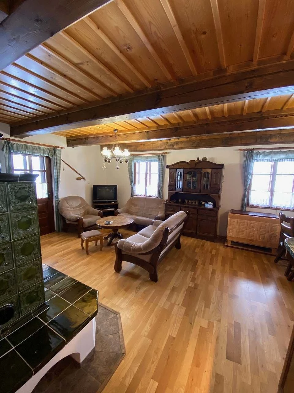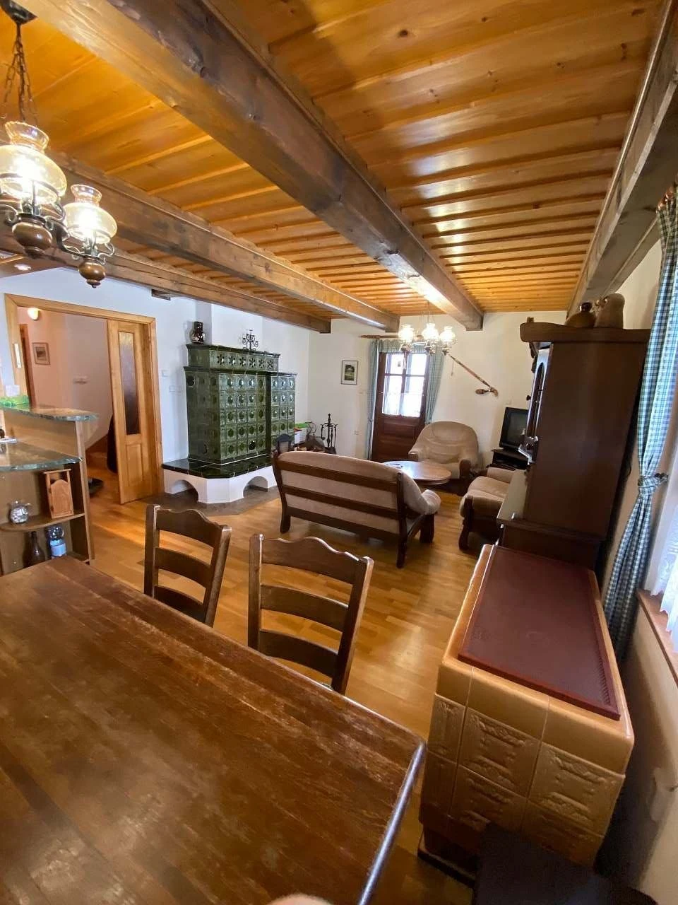 - Plně vybavená kuchyně: sporák, kachlová kamna, lednice, varná konvice, mikrovlnná trouba, veškeré nádobí, jídelní kout